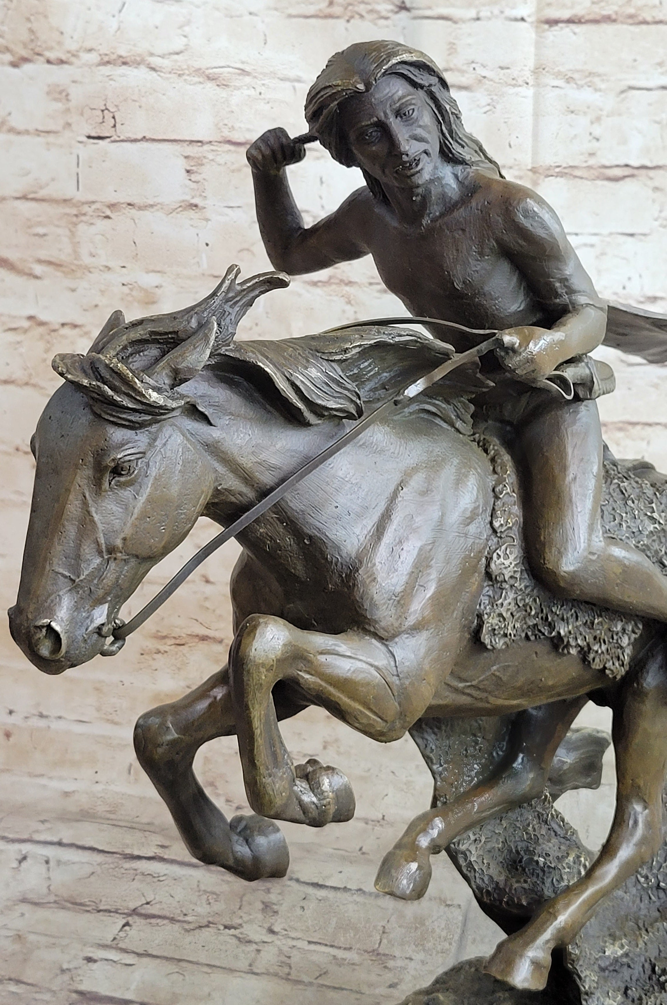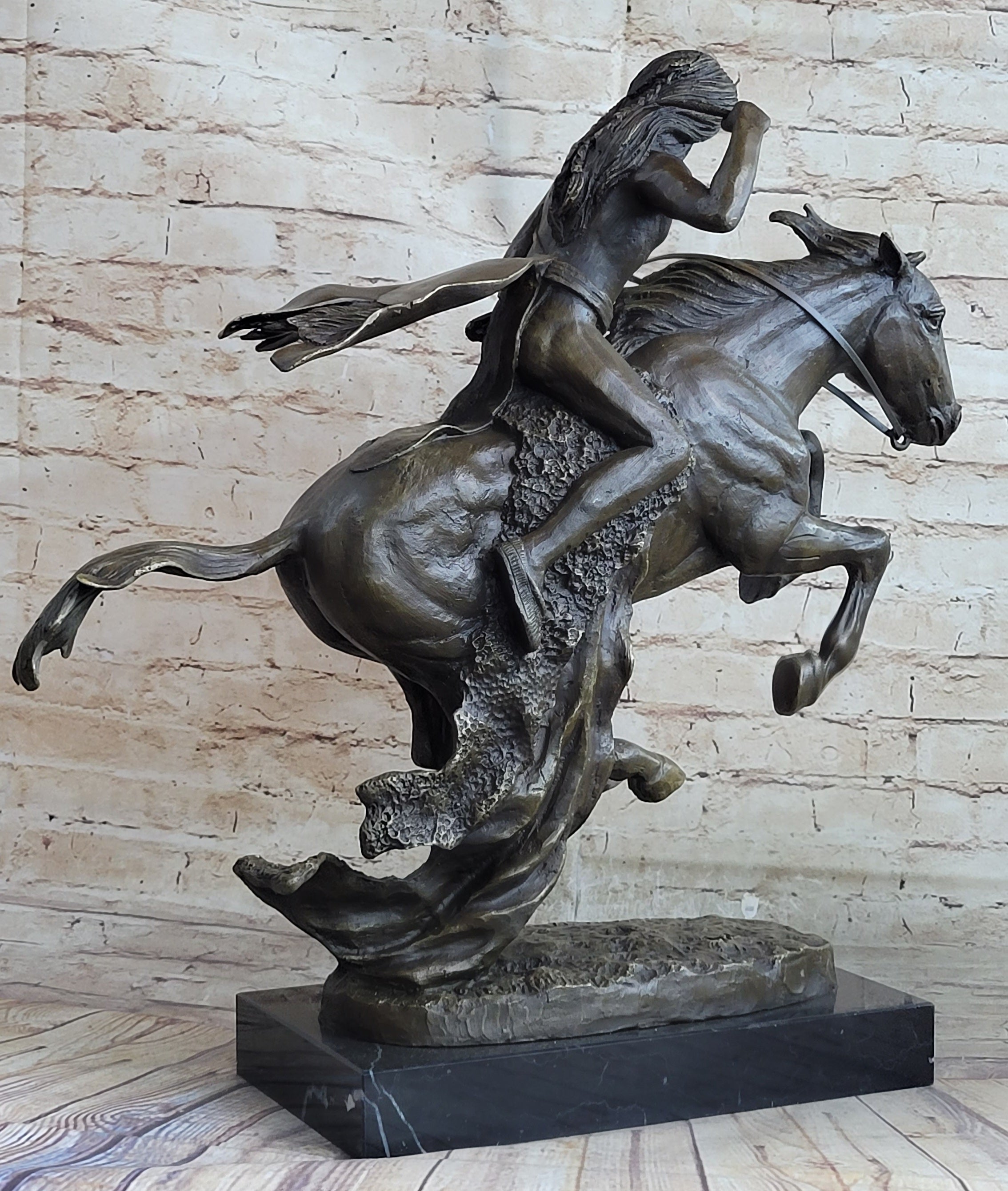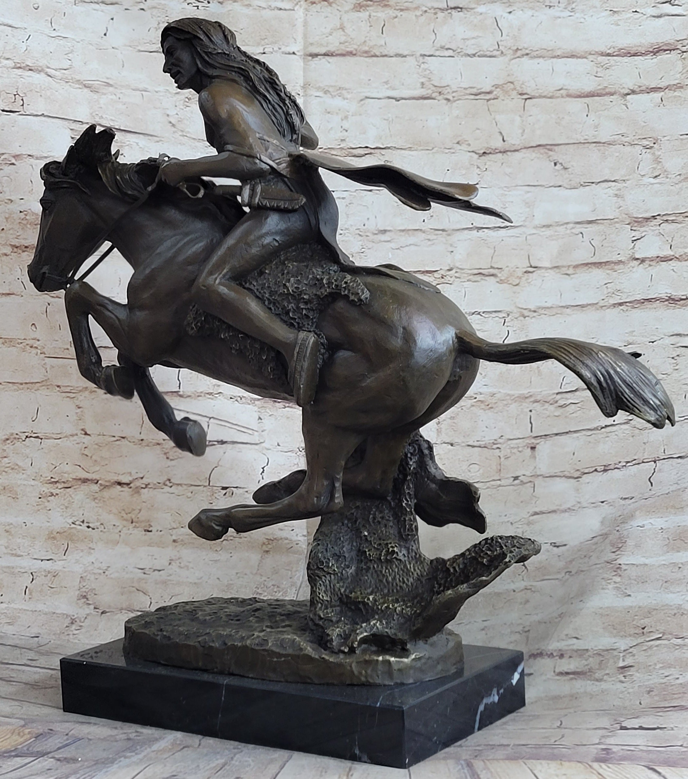 In a dynamic tribute to the enduring Native American spirit, this bronze sculpture vividly captures a breathtaking moment of action—an Indian warrior charging fearlessly across the arid desert landscape atop a powerful steed. Armed with a long spear, the rider leans forward with resolute focus, embodying courage, skill, and ancestral pride. The horse beneath him, equally intense and alive, gallops with muscular precision, its nostrils flaring and head lowered in perfect synchronization with its rider. This striking composition exudes motion, emotion, and purpose, drawing the viewer into a storied world of bravery and tradition. Every detail of the sculpture is crafted with remarkable precision, showcasing the sculptor’s masterful ability to bring bronze to life. From the taut sinews of the horse’s legs to the expressive tension in the rider’s posture, the scene brims with energy and realism. A rich brown patina enhances the sculpture’s depth and texture, lending a timeless character to the piece. The famed “Lost Wax Method” was employed to cast this work, ensuring that even the subtlest elements—from the folds of the rider’s garments to the straining reins—are preserved with fidelity and permanence. Mounted on a sleek black marble base, the sculpture radiates sophistication and strength. Signed by the renowned artist Frederic Remington, this piece not only celebrates the raw intensity of the moment but also serves as a poignant homage to the cultural heritage it represents. Whether displayed in a private collection, rustic interior, or executive space, it stands as a powerful symbol of the unbreakable bond between human and horse—and of the spirit that rides forever across history’s open plains.