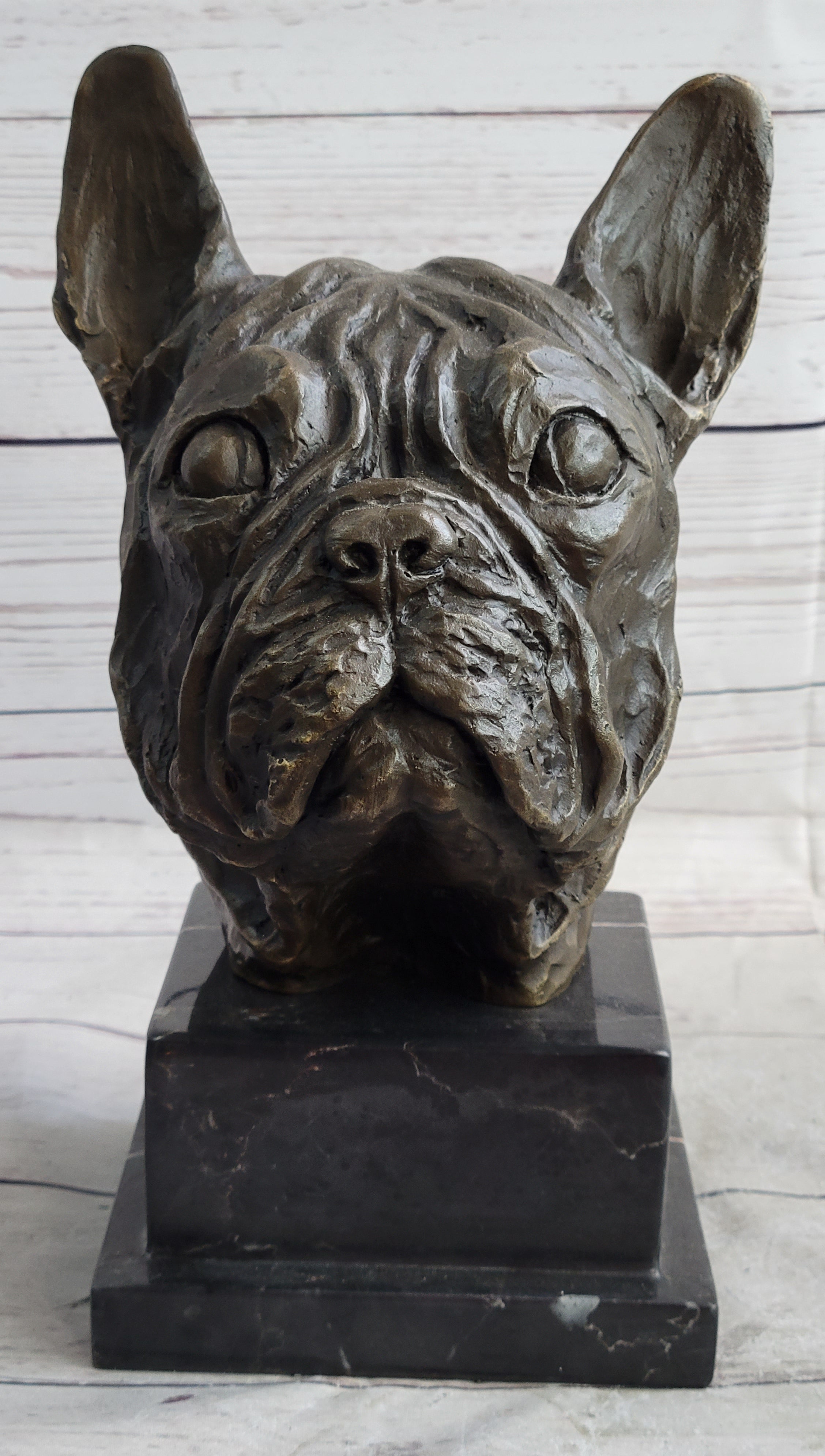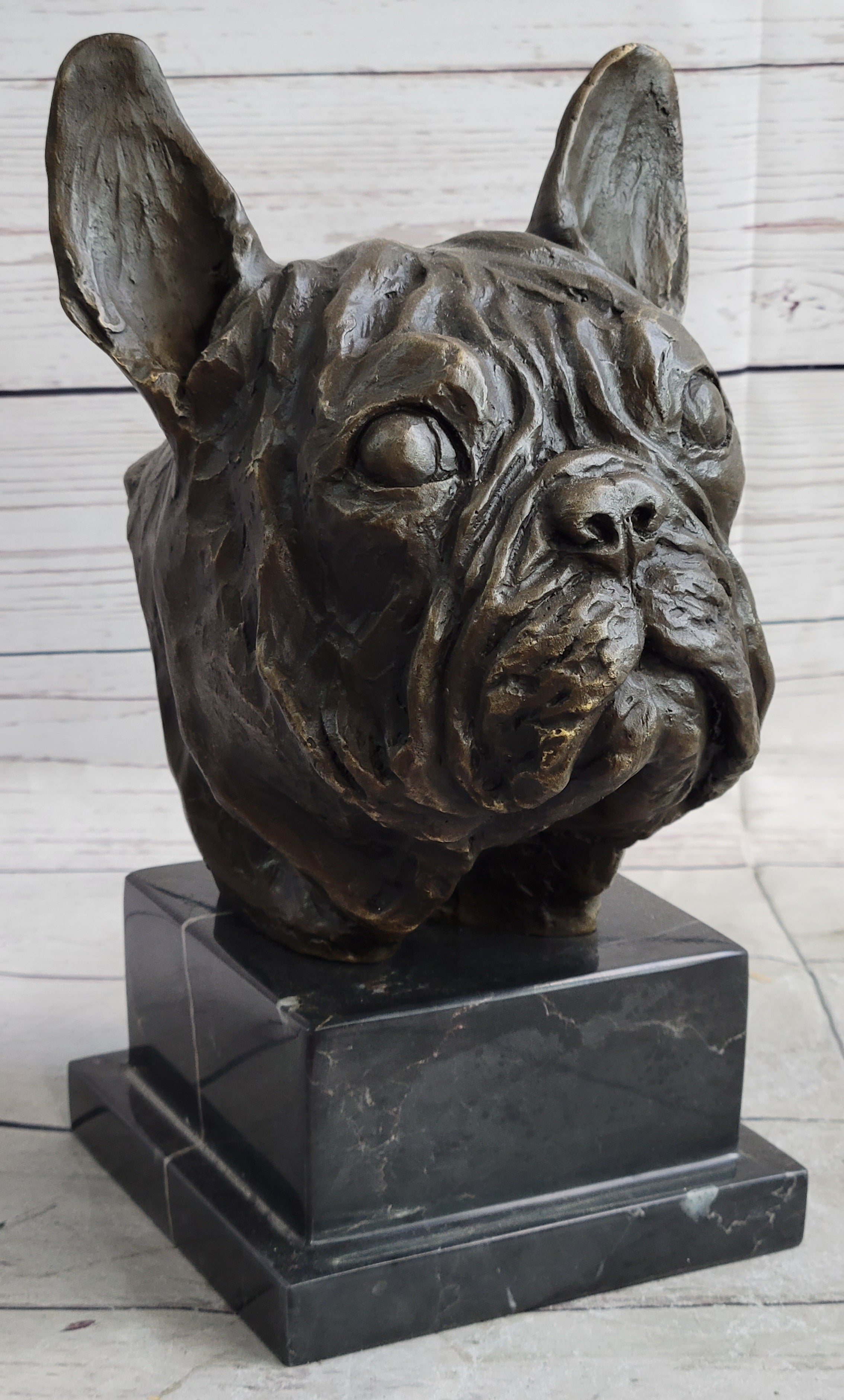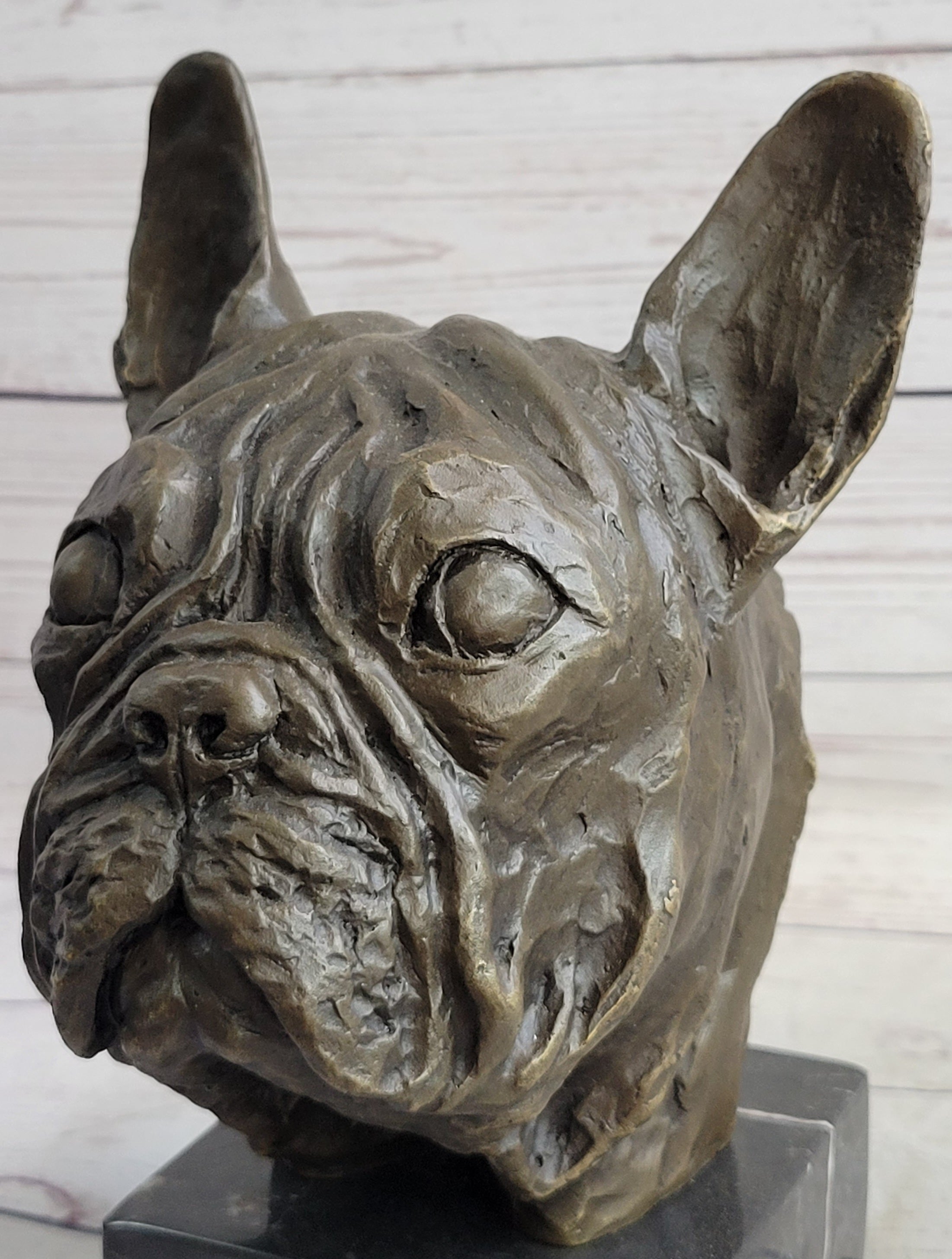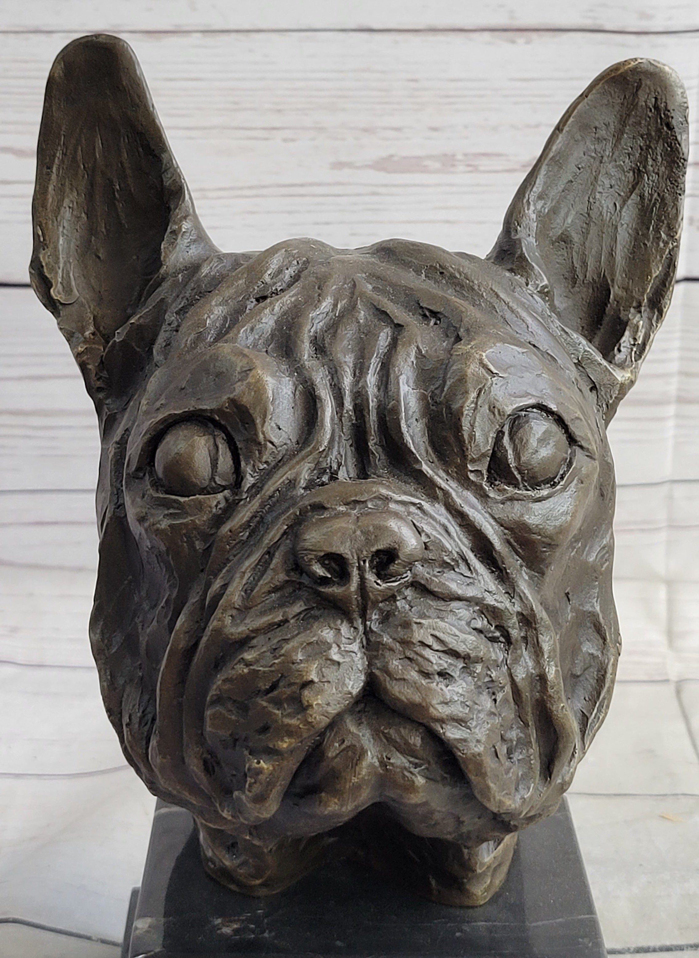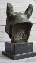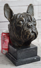 French Bulldog Puppy Dog Bronze Bust Sculpture Statue Decor on Marble Base