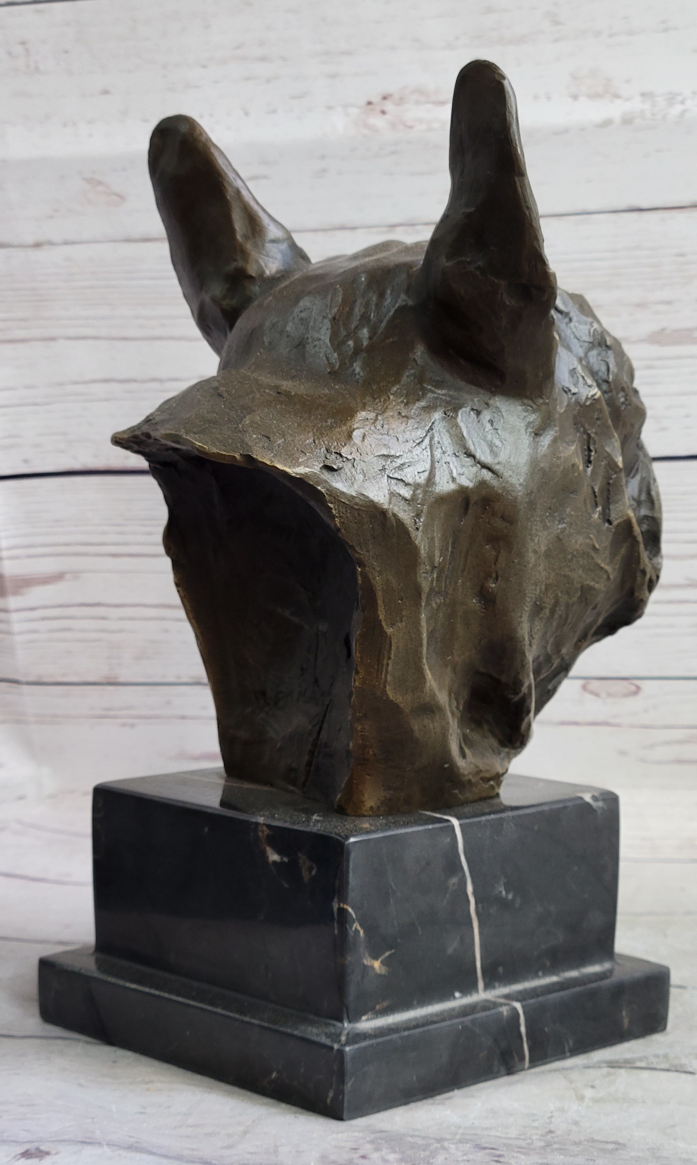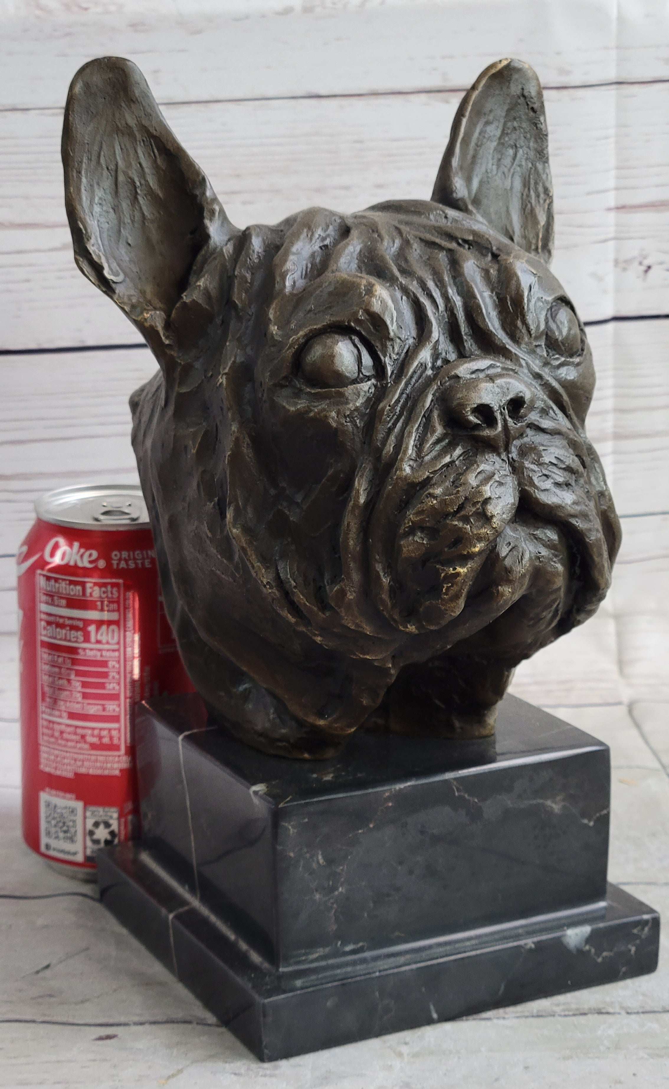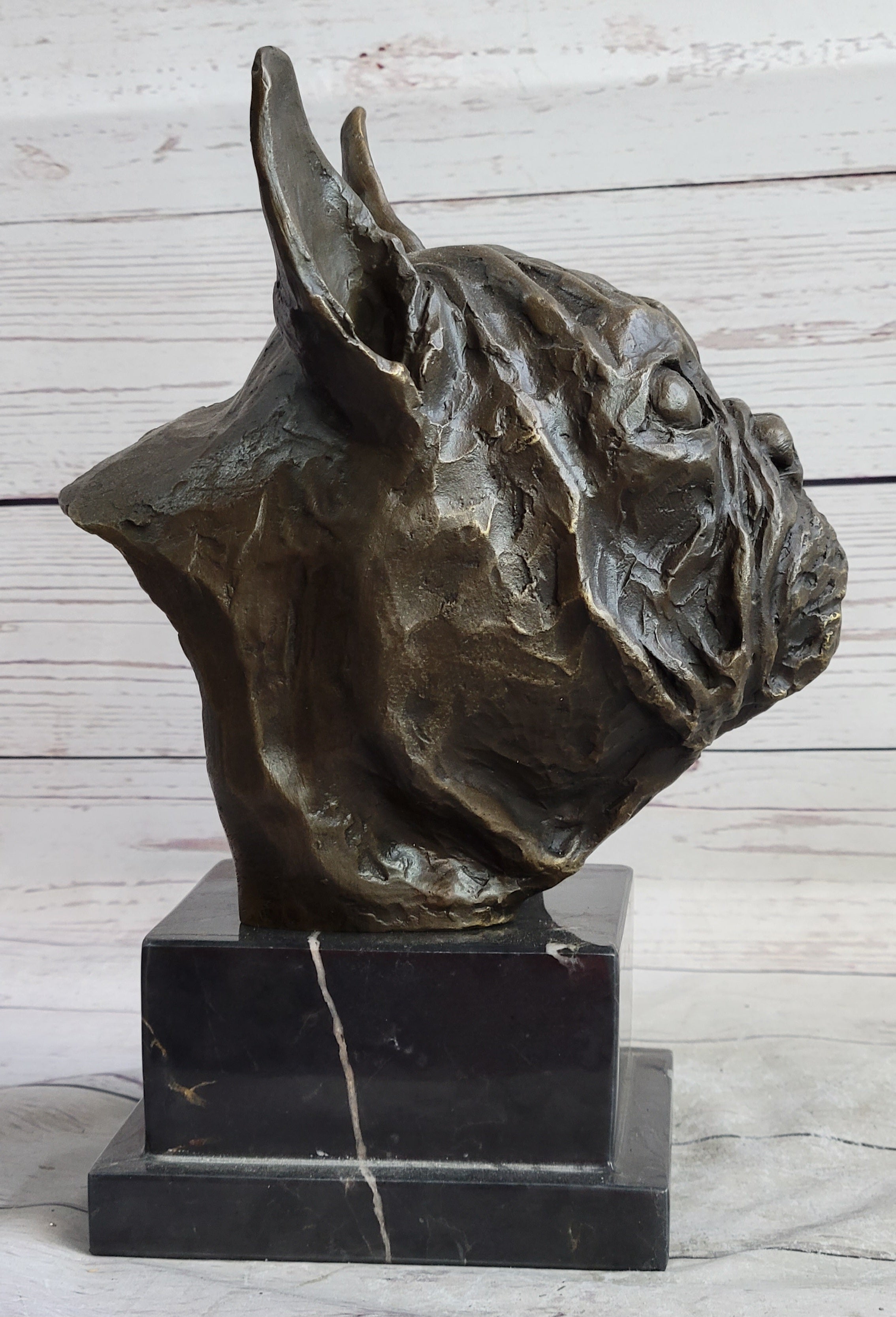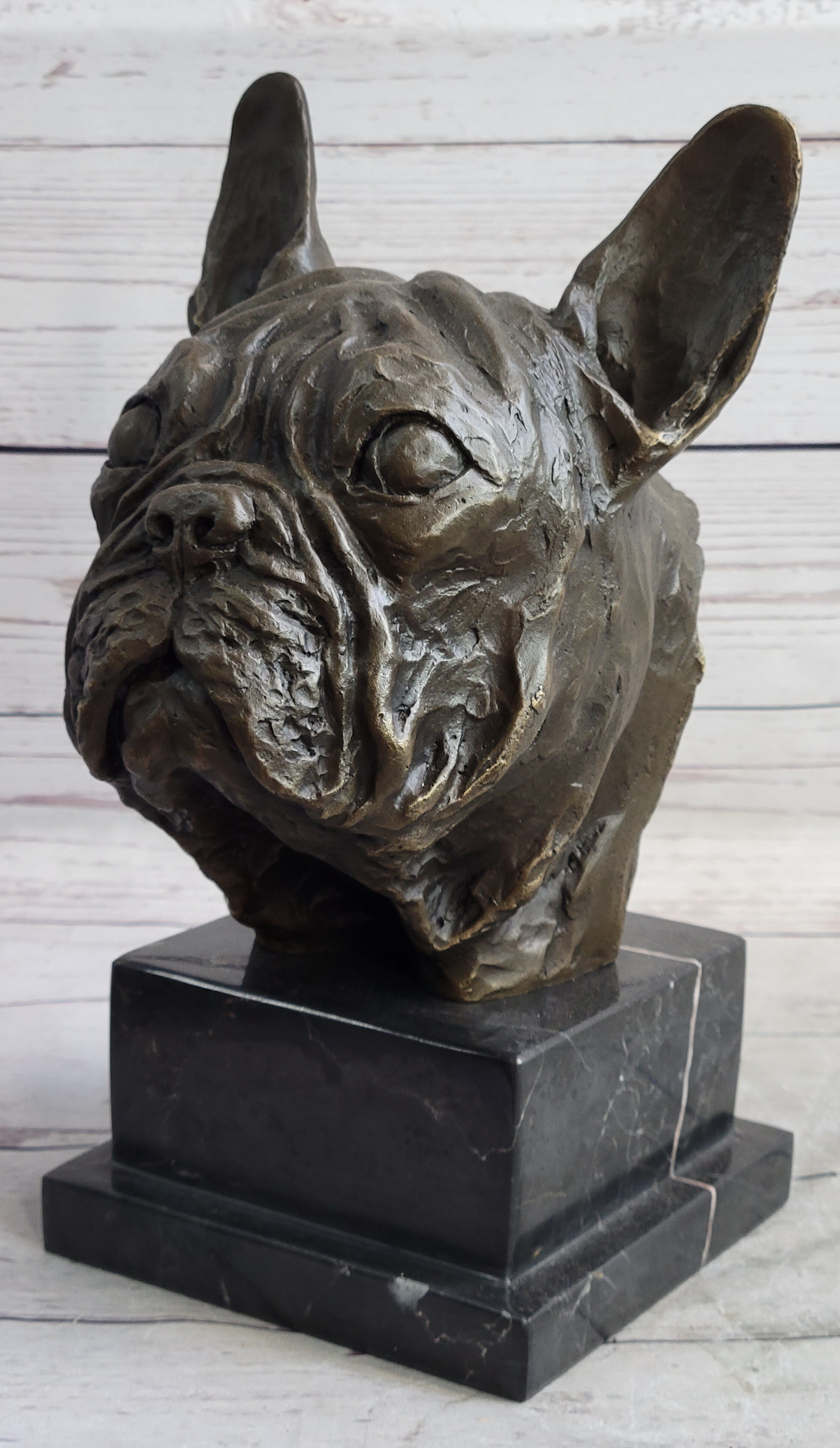 French Bulldog Puppy Dog Bronze Bust Sculpture Statue Decor on Marble Base