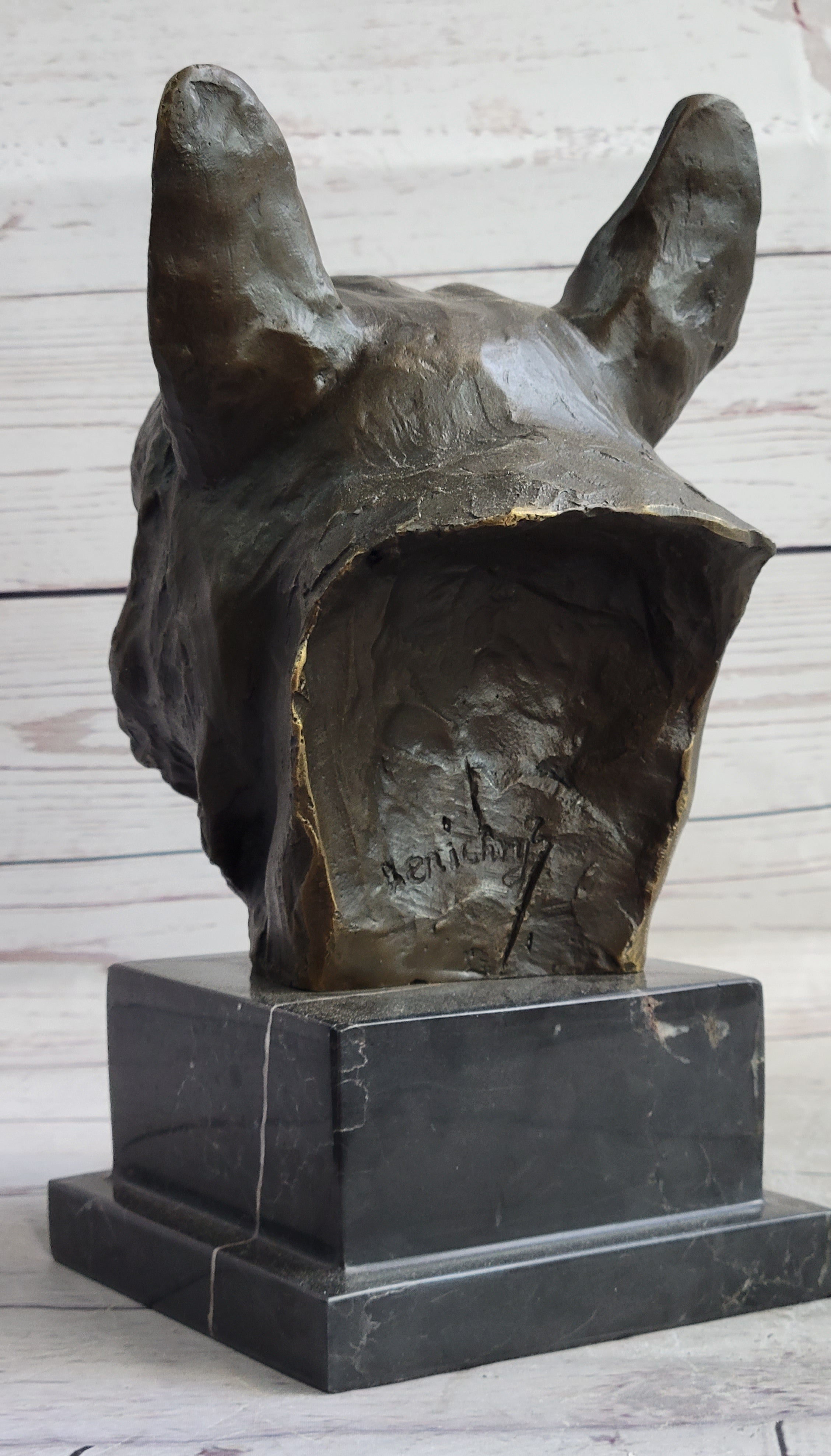 Signed by the talented artist Renichez, this sculpture not only pays homage to the timeless companionship offered by dogs but also stands as a unique and cherished piece of art. Whether displayed in a home, office, or any space, this sculpture serves as a heartwarming reminder of the joy and love that our canine friends bring into our lives.Bronze Dimensions with Marble Base: Height 11" X Width 8"