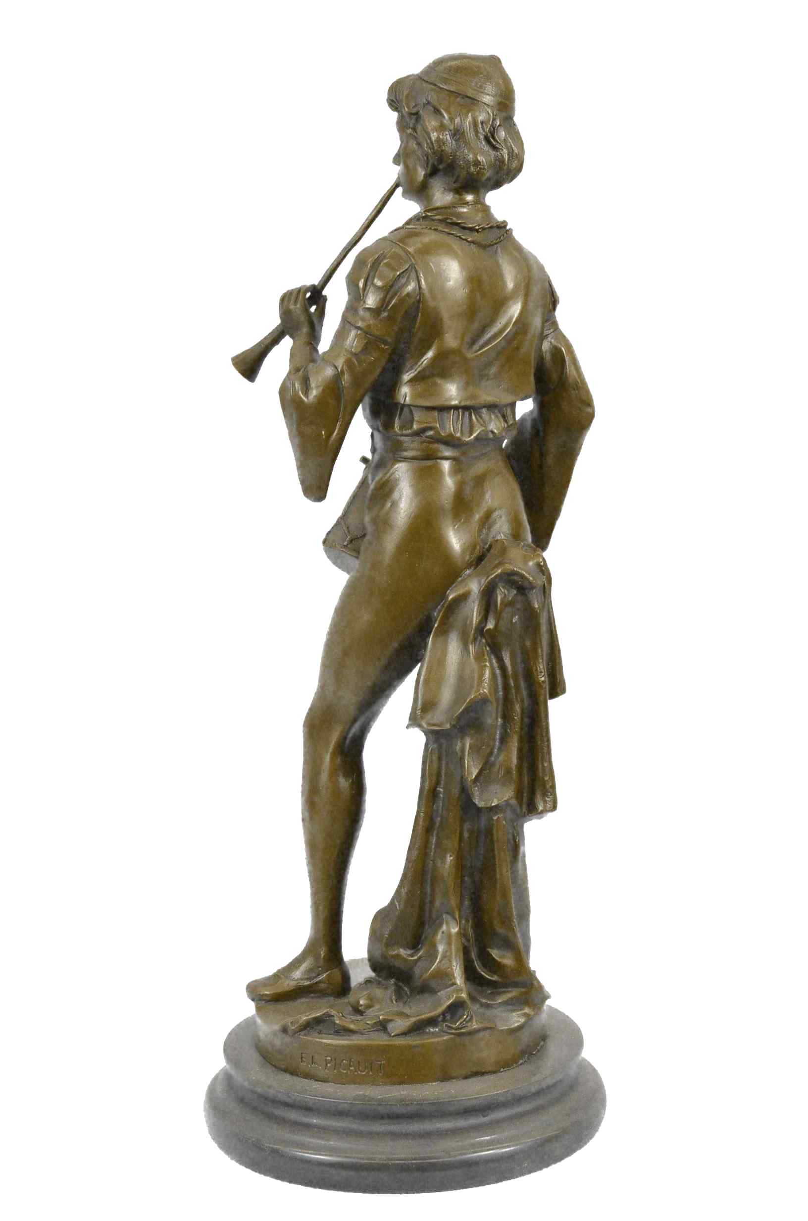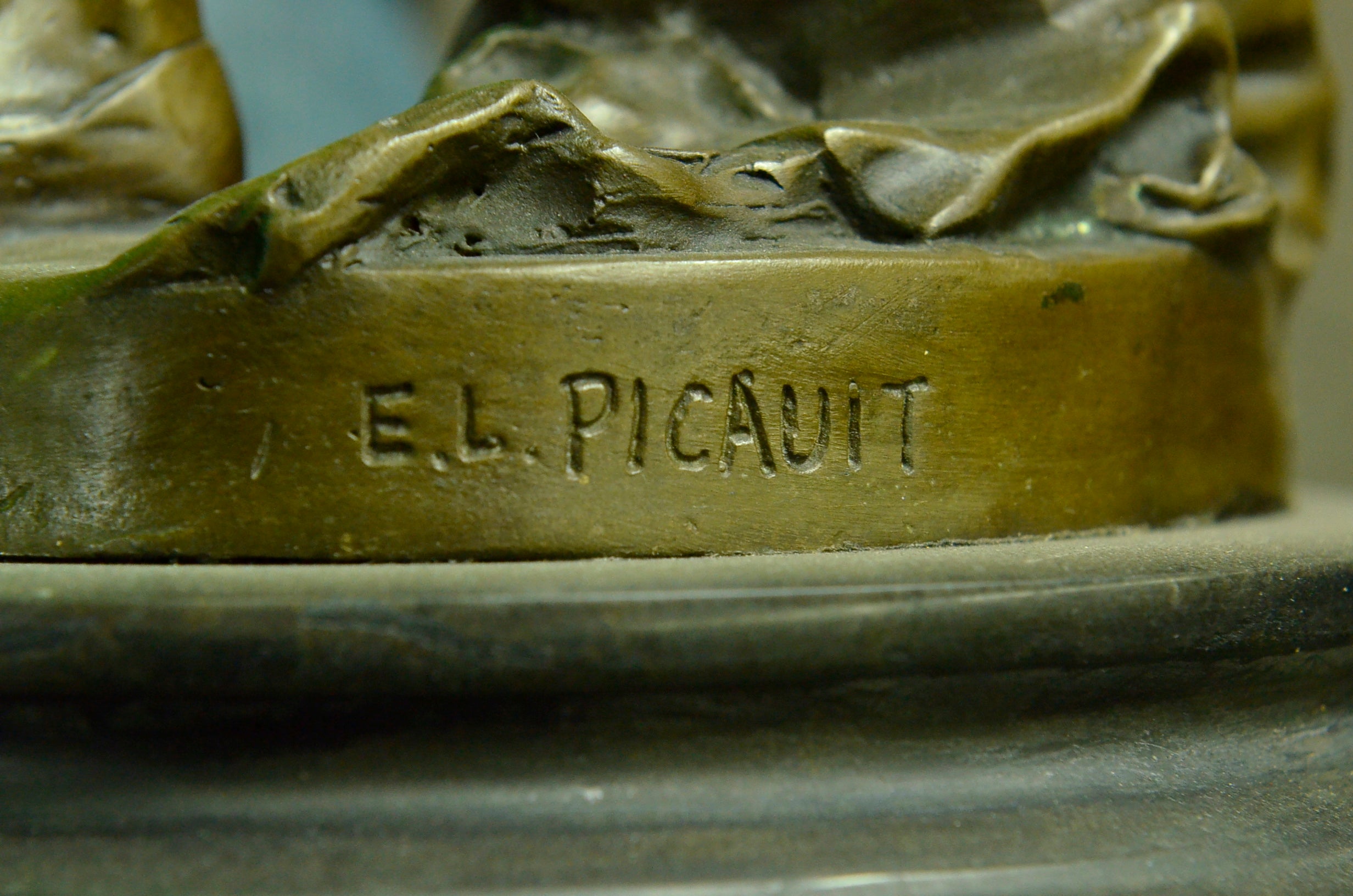 Standing at a height of 19 inches, this cast bronze sculpture is a testament to the skill of the artist, Picault. The choice to mount the sculpture on a black marble base adds both stability and a visually appealing presentation. The signature of the artist serves as a mark of authenticity, acknowledging the craftsmanship that went into creating this evocative portrayal of a drummer from the French civil war period. As a historical tribute, this sculpture invites viewers to reflect on the role of communication and symbolism in military history.Bronze Dimensions with Marble Base: Height 19" X Width 7"