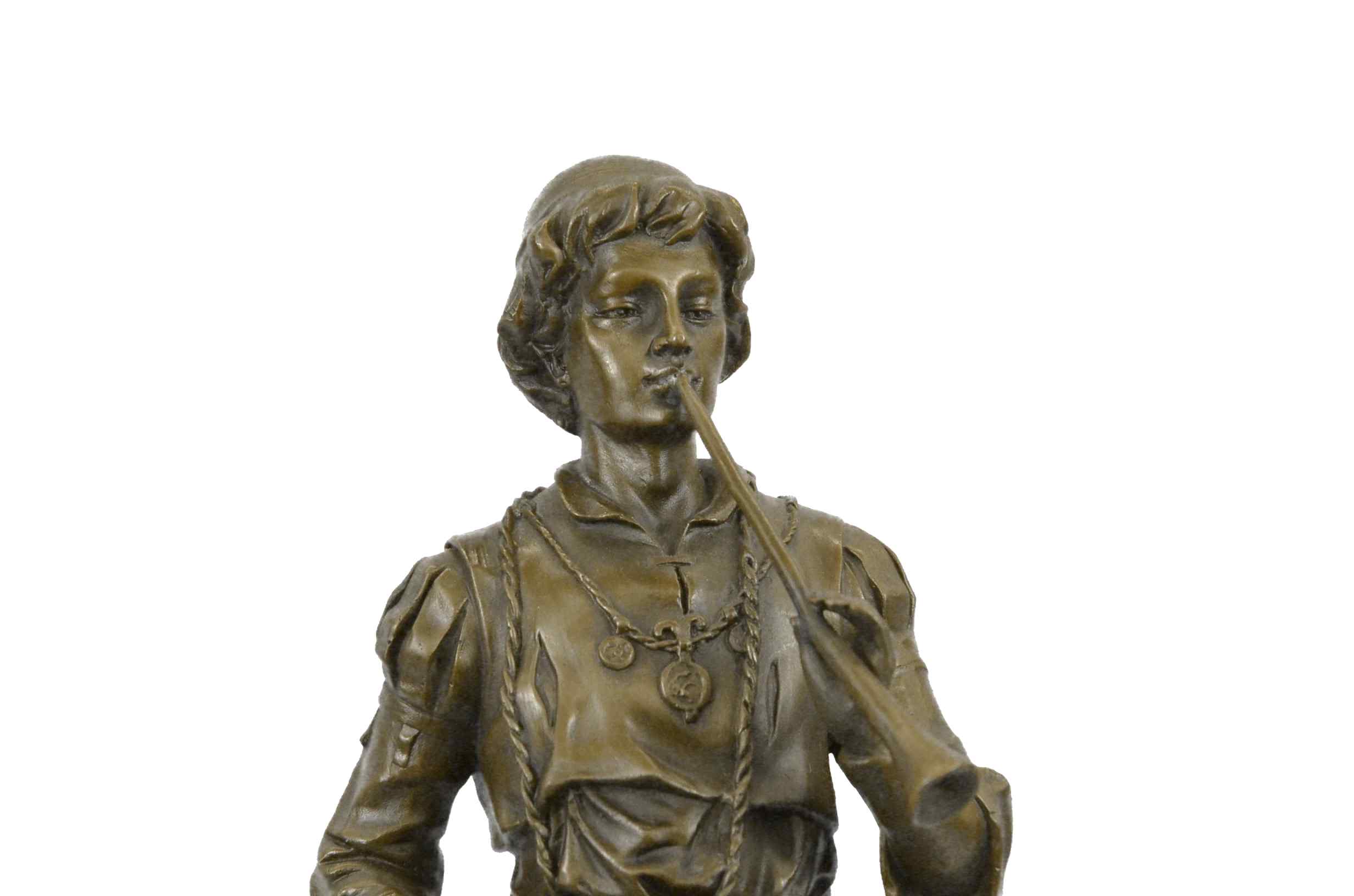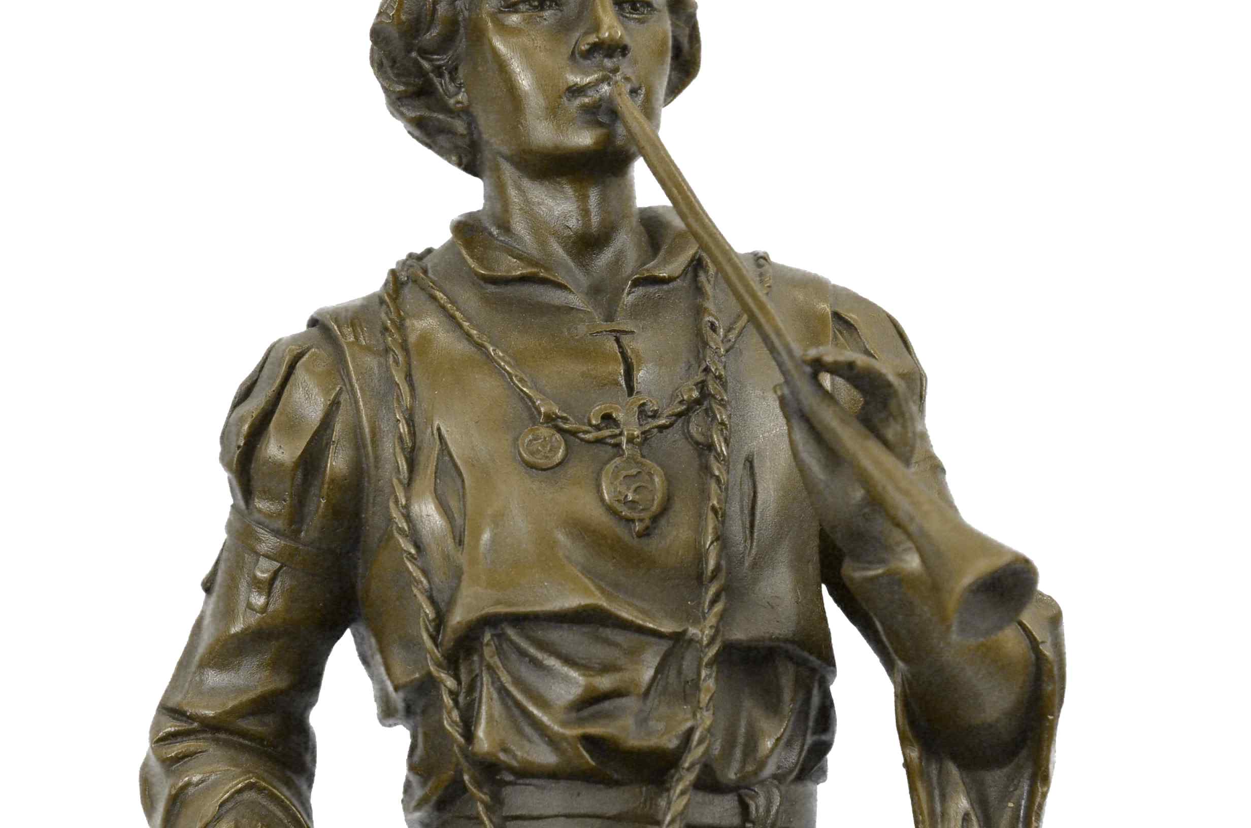 This striking bronze sculpture captures a moment from the French civil war period, showcasing a figure adorned in the standard attire of the time. The historical accuracy of the sculpture is evident in the meticulous details, portraying the uniform worn during this tumultuous period. Both Royalists and Parliamentarians employed drummers to communicate with troops using coded drum messages. The design of the drums and the clothing of the drummers, as depicted in this sculpture, were remarkably similar for both factions. The attention to historical accuracy provides a window into the past, offering a glimpse of the communication methods and attire prevalent during the French civil war.