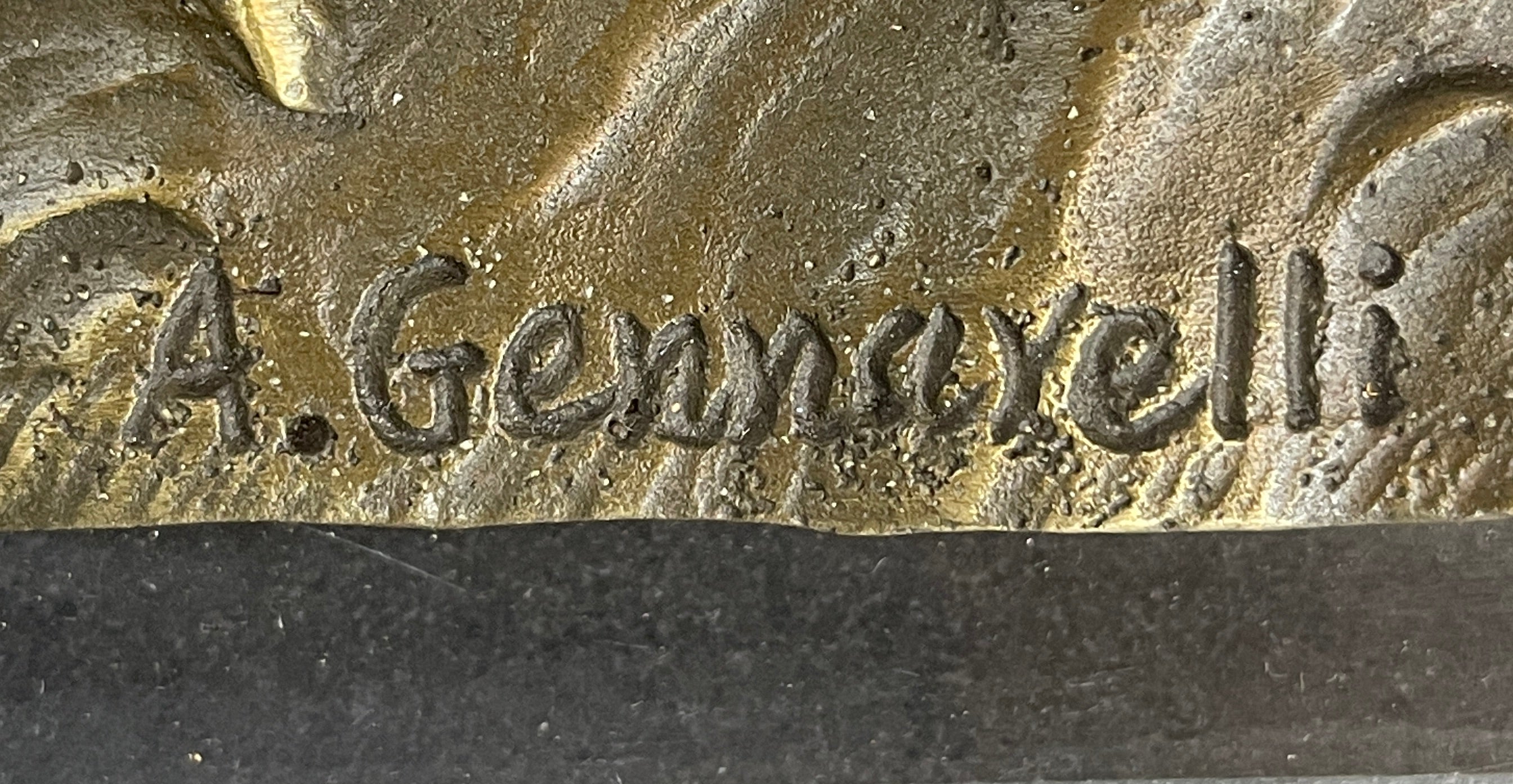 This extraordinary sculpture is signed by the artist A. Gennarelli, adding a personal touch and ensuring its quality. It is a testament to the artist's skill and artistry, as well as a celebration of the inherent beauty and grace of the human form. Whether displayed in a home, office, or art gallery, this bronze sculpture will undoubtedly become a focal point, inviting viewers to appreciate the timeless allure and artistic expression it embodies.Bronze Dimensions with Marble Base: Height 10" X Width 20"