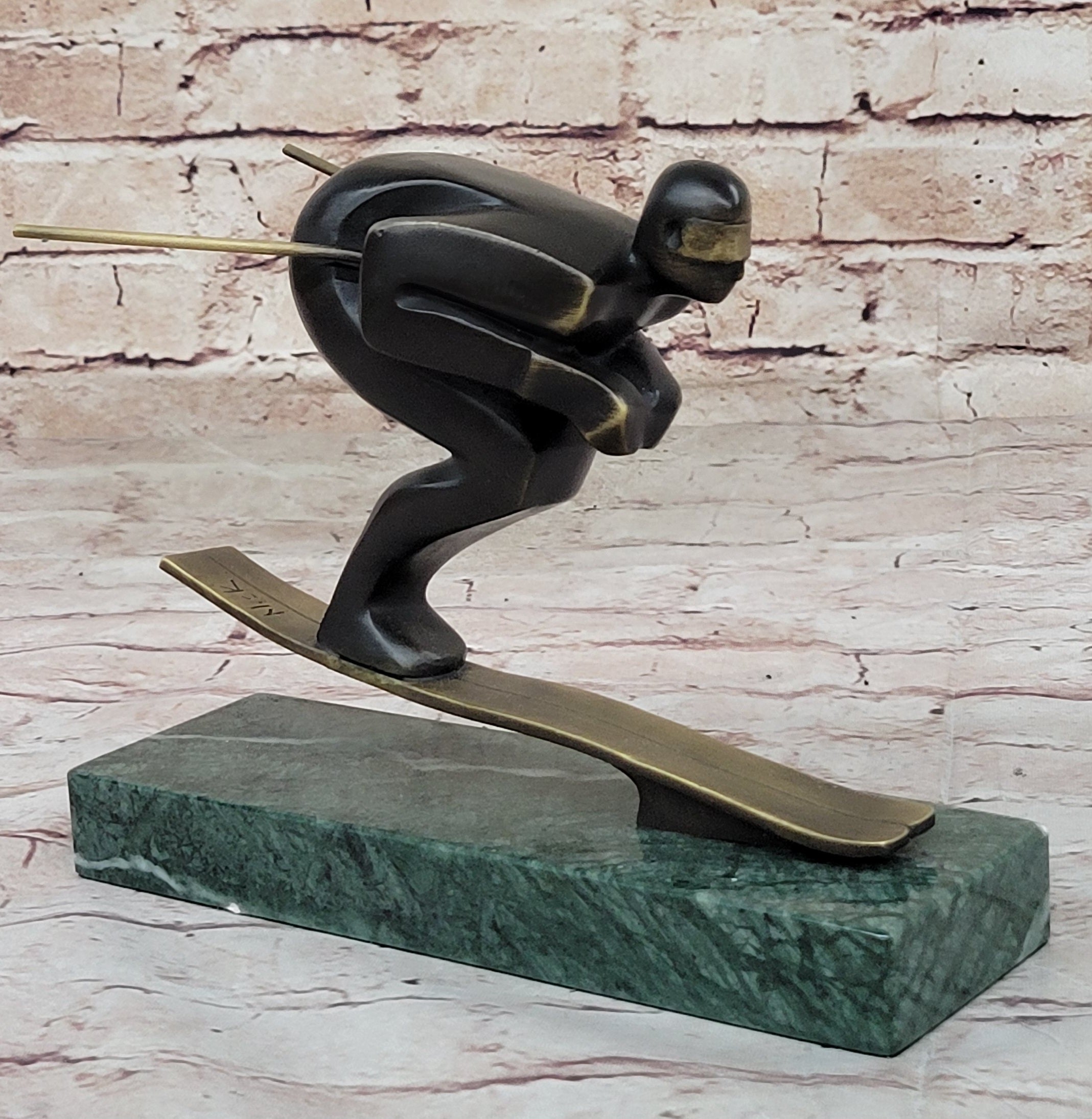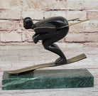 Crafted with meticulous attention to detail, this bronze sculpture captures the dynamic energy and fluidity of the skier's movements with unparalleled precision. Utilizing the time-honored "Lost Wax Method," the sculpture boasts a rich brown patina finish that accentuates the textures and contours of the skier's form. Mounted on a sturdy marble base, the sculpture stands as a testament to the artist's skill and the skier's passion for the sport.