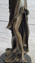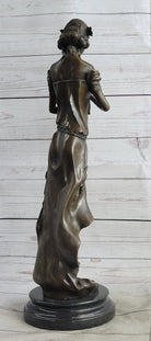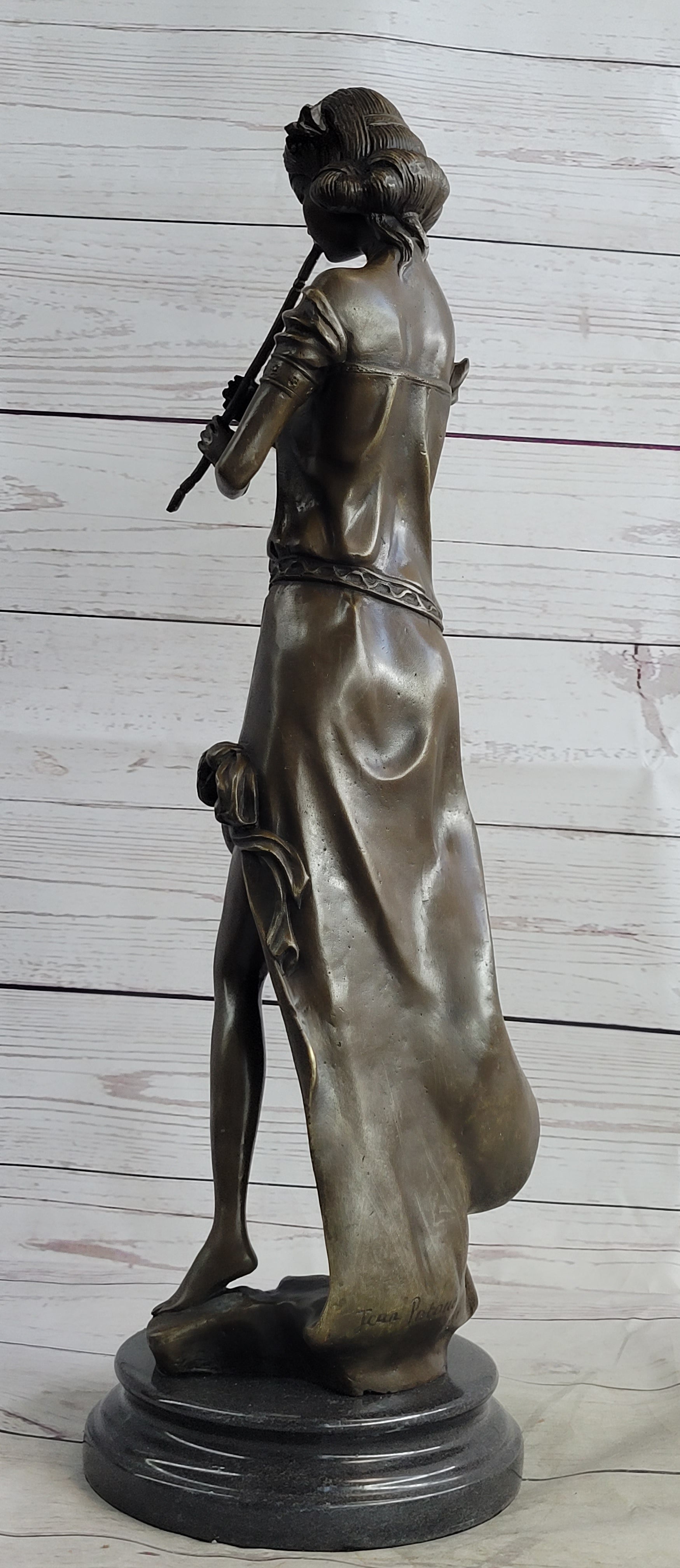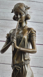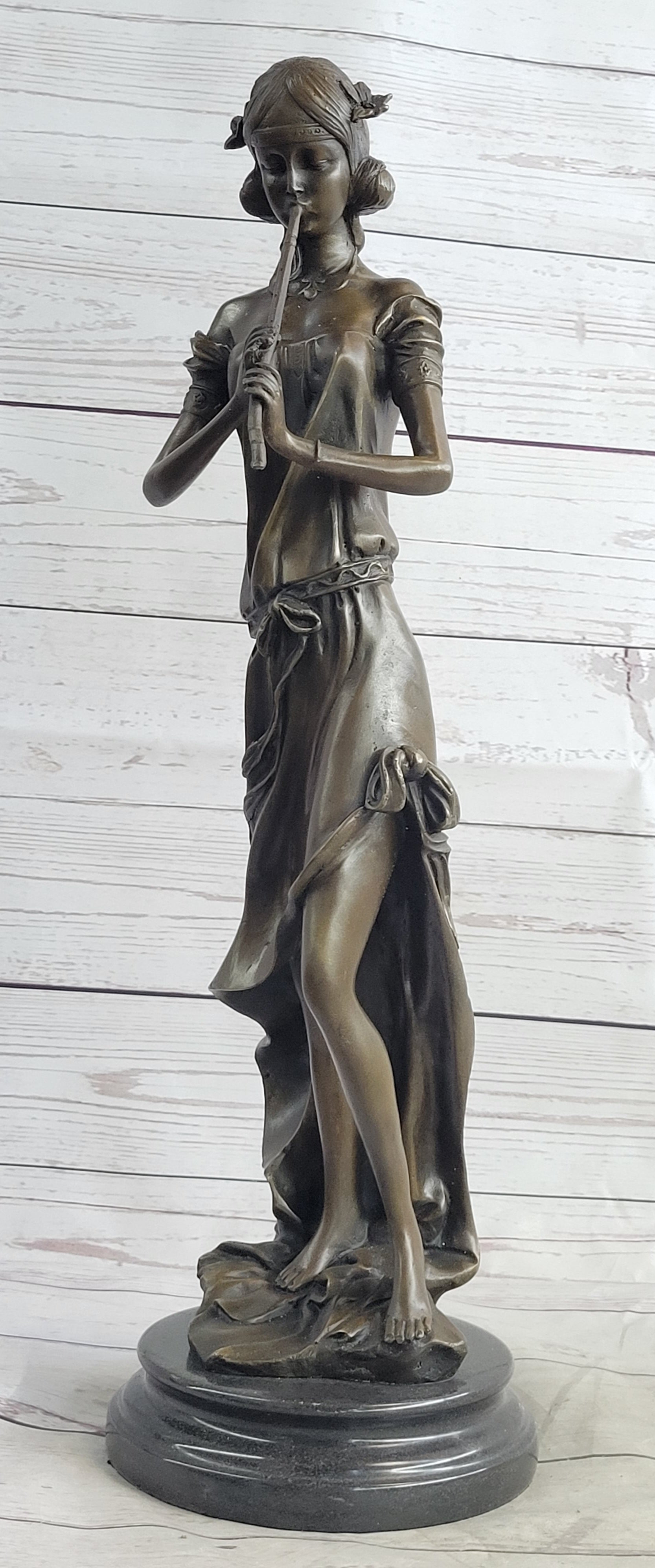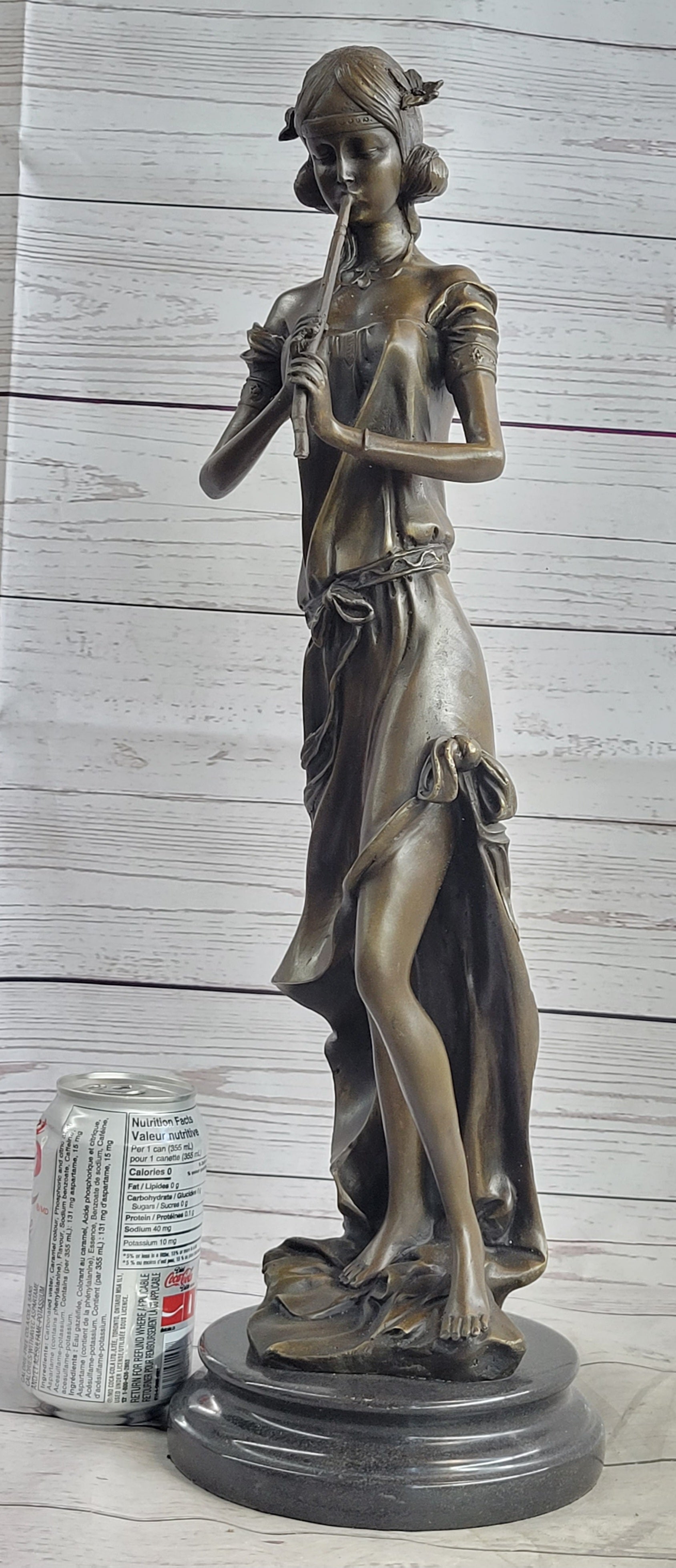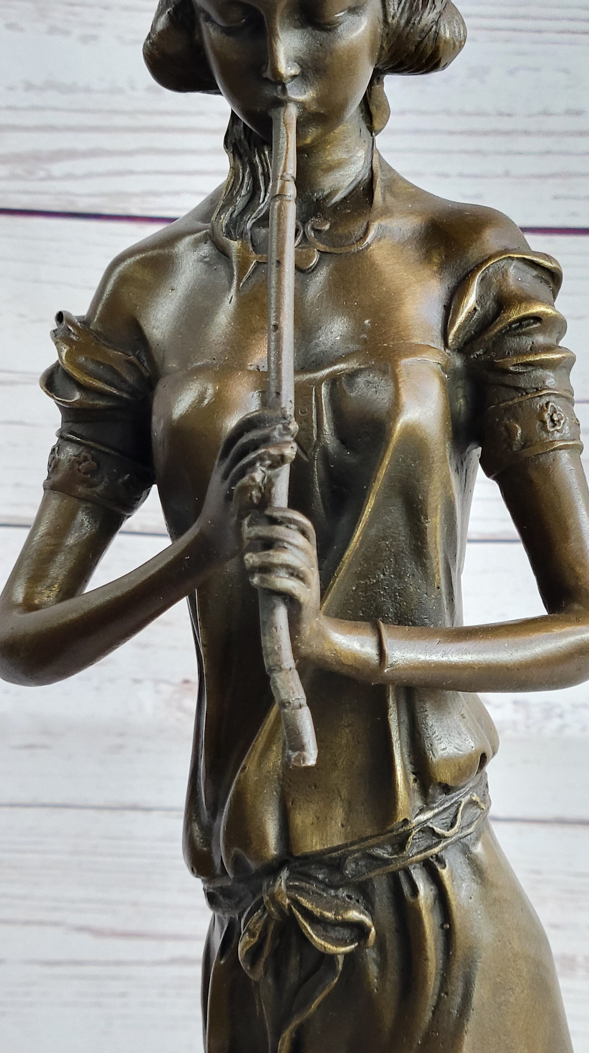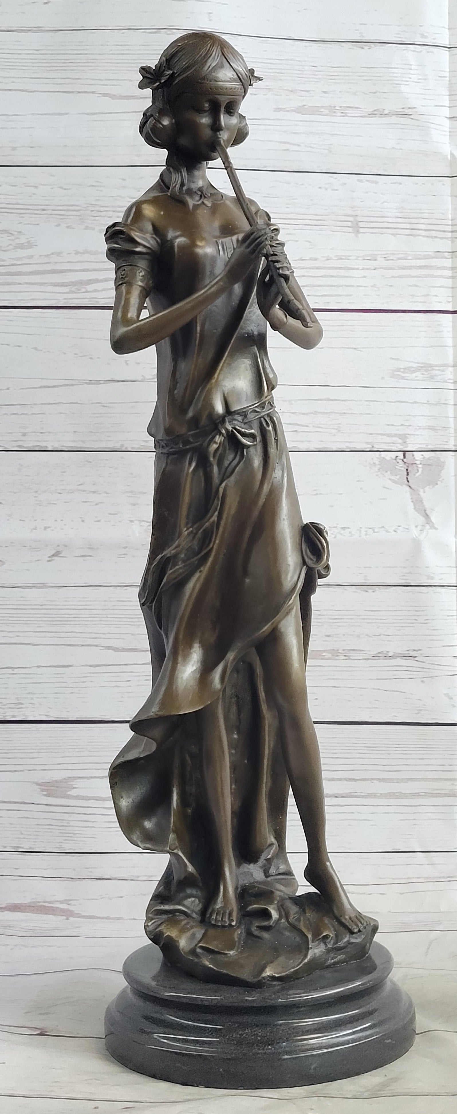 Girl Playing The Flute Female Musician Bronze Sculpture Statue Figure on Marble Base