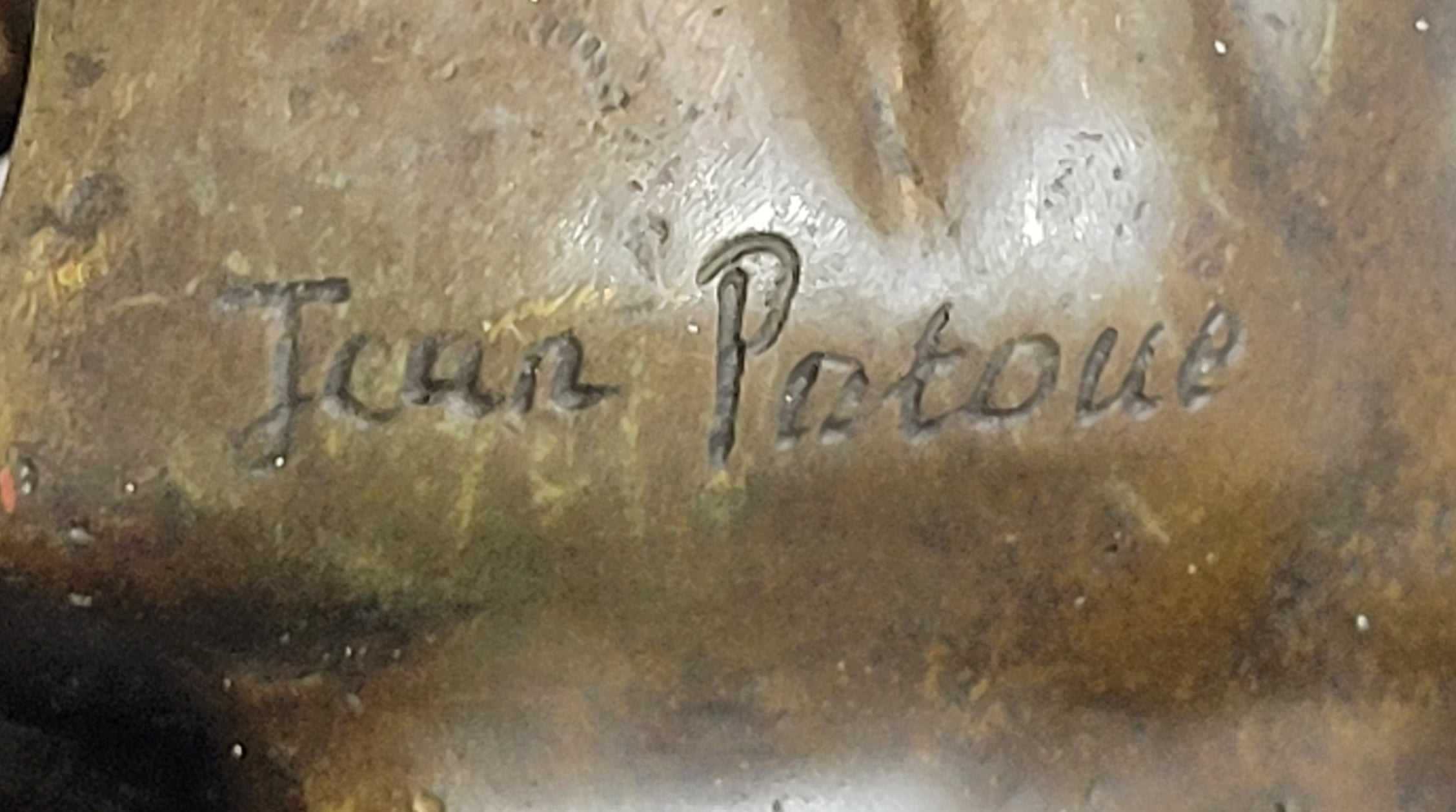 A young woman plays a soothing song on her flute. She puckers her lips around the slender instrument and blows. She shuts her eyes and listens to her melody, confident that she will not hit any sour notes. Her musical notes lift into the air that swirls around her. Her golden yellow patina goddess dress hangs loosely over her slender body. She entertains all who steal a moment to listen to her sweet lullaby. 100% bronze and handmade, this brown patina sculpture was cast using the “Lost Wax Method” and is mounted on a round marble base and is signed Jean Patoue.Bronze Dimensions with Marble Base: Height 20" x Width 6.5"