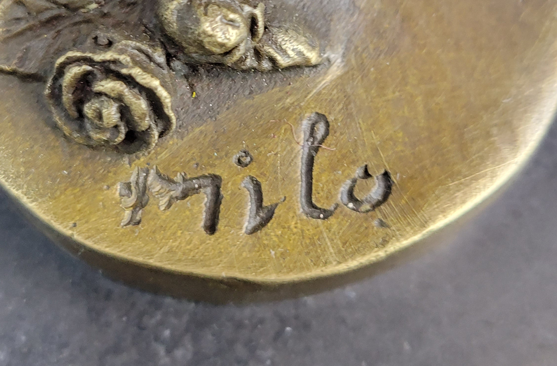Signed by the renowned artist Milo, this sculpture stands as a testament to his mastery in capturing the essence of the human form and the expressive beauty of dance. Whether displayed in a dance studio, a gallery, or a collector's home, this bronze sculpture serves as a timeless celebration of the art of ballet, inviting viewers to appreciate the skill, dedication, and sheer beauty embodied by the prima ballerina.Bronze Dimensions with Marble Base: Height 11" X Width 9"
