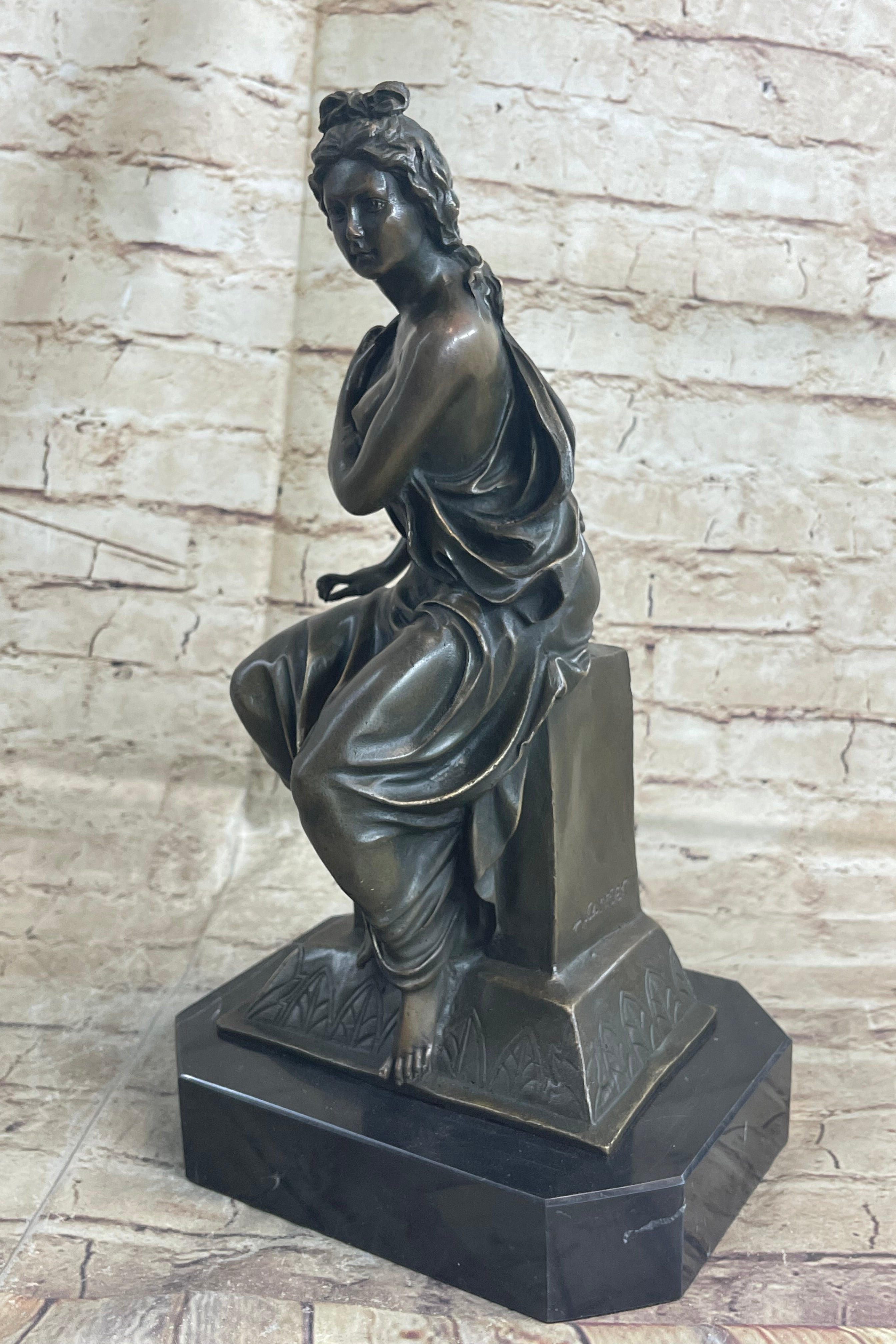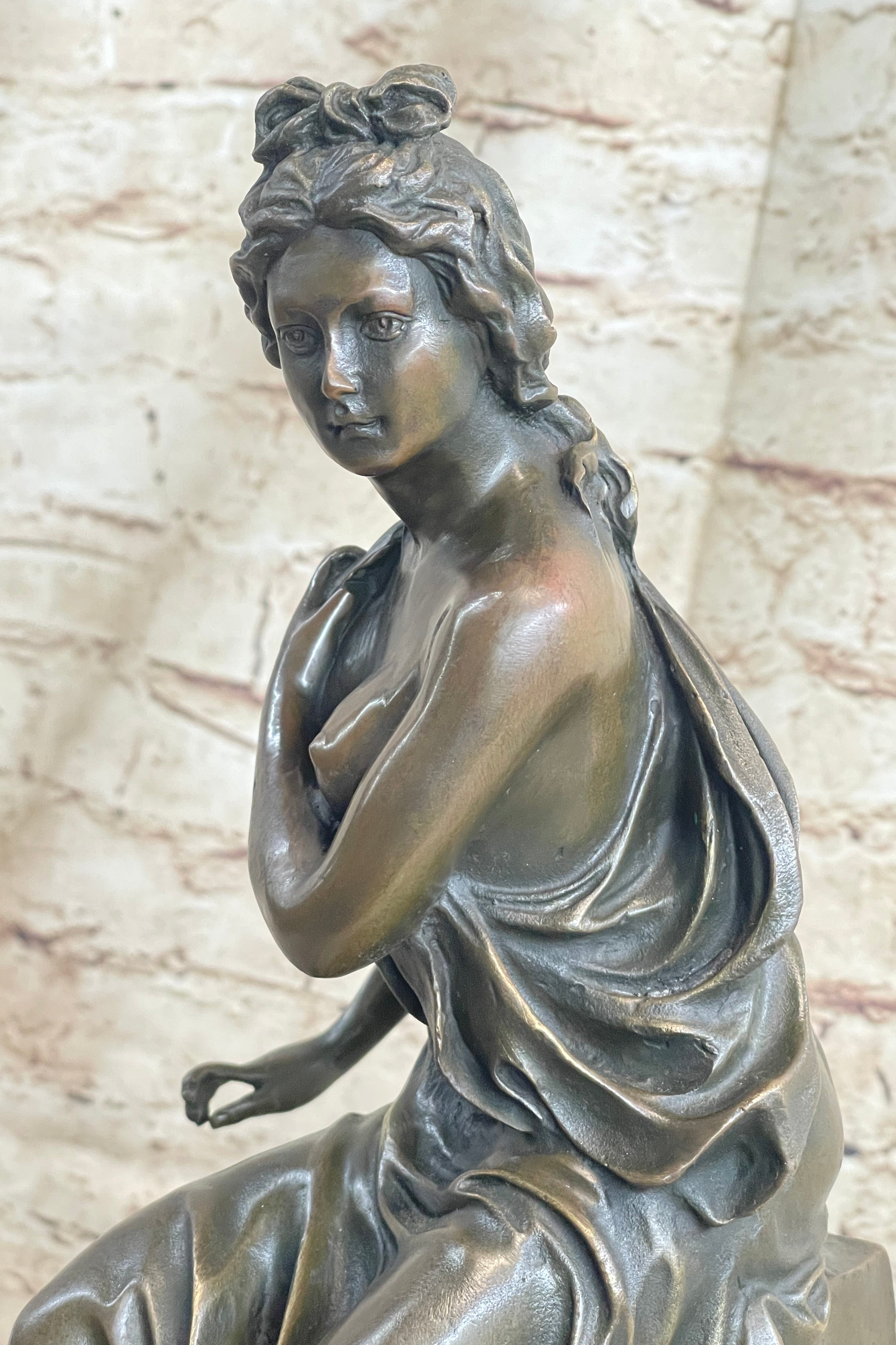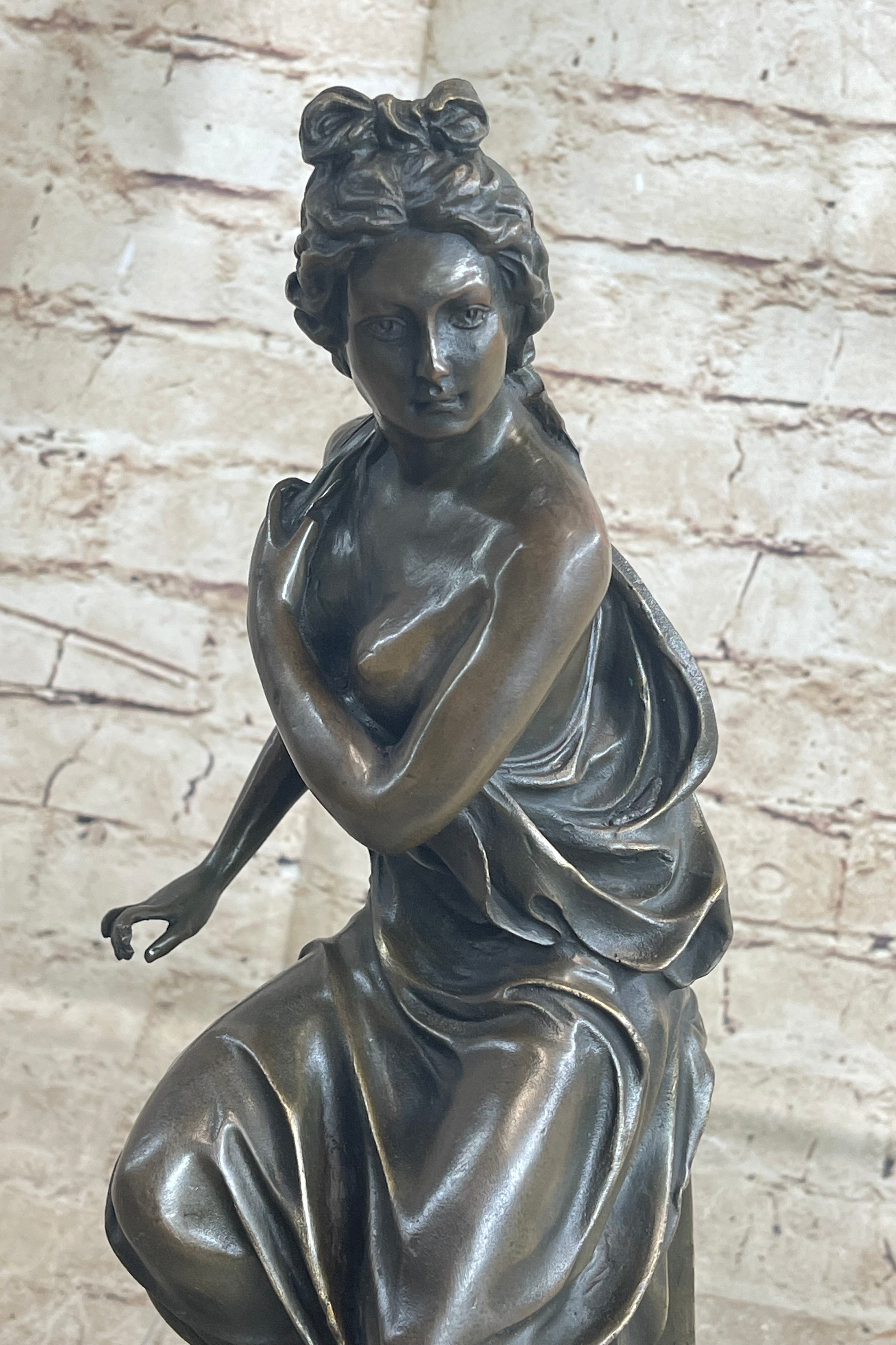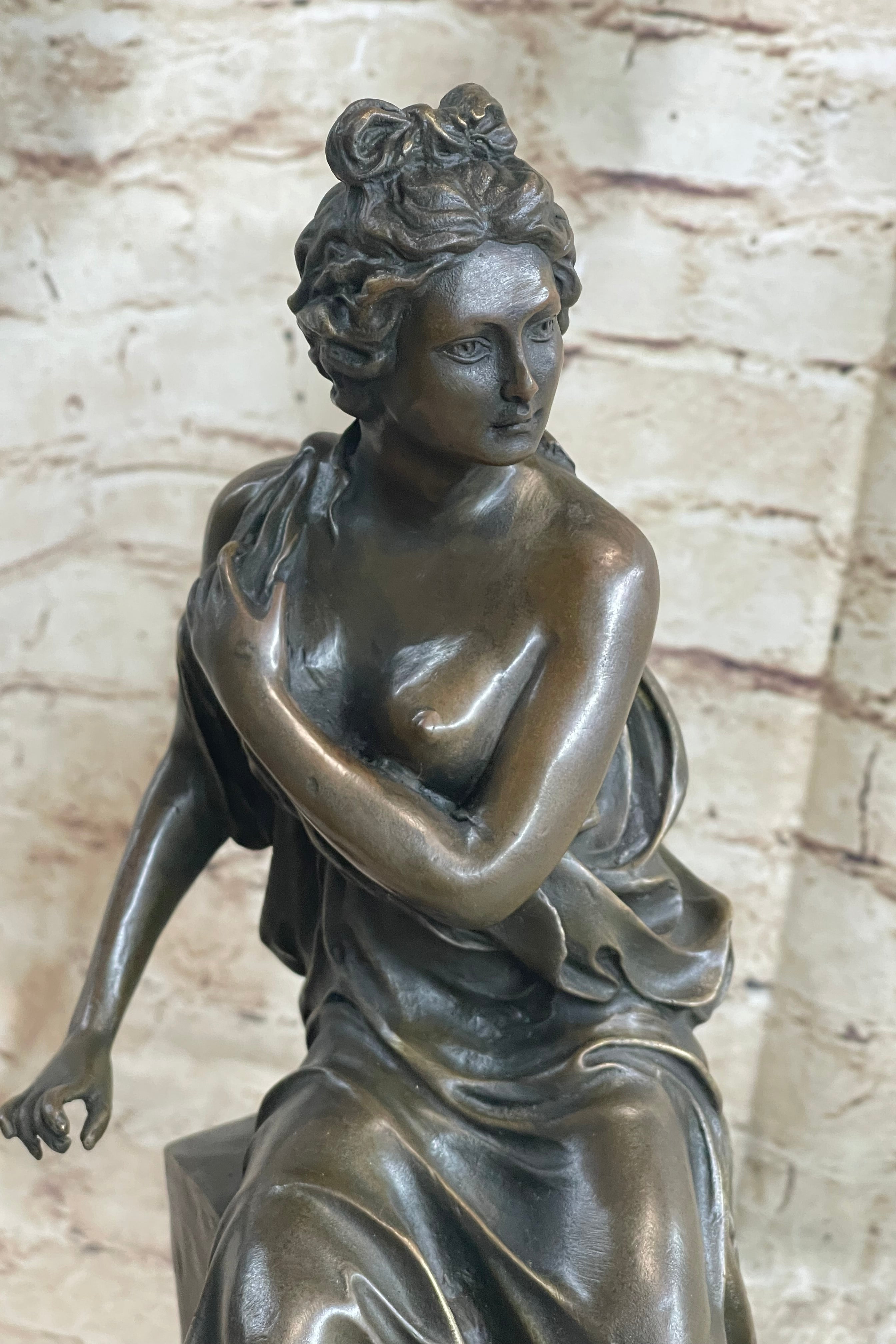 This stern woman sits atop a decorative pedestal. She is dressed in a loose garment that falls just below her cleavage line allowing her breast to show. She brings her other arm across her chest in an effort to cover herself. She has her hair sculpted away from her face, complemented by a bow, which adds to the femininity of this piece. Her eyes are fixed on a point ahead of her in a look that demonstrates the she is a figure of power. This is further enhanced by the fact that she is on top of a pedestal that is very reminiscent of a throne. She is delicately poised but her face remains firm in an expression that lets us know that she is a force to be reckoned with. This piece has been cast using the lost wax method, founded thousands of years ago, ensuring an exquisitely detailed sculpture and is signed A. Carrier that will add grace and beauty to your business or home. Get one for a loved one todayBronze Dimensions with Marble Base: Height 14 1/2" x Width 8"