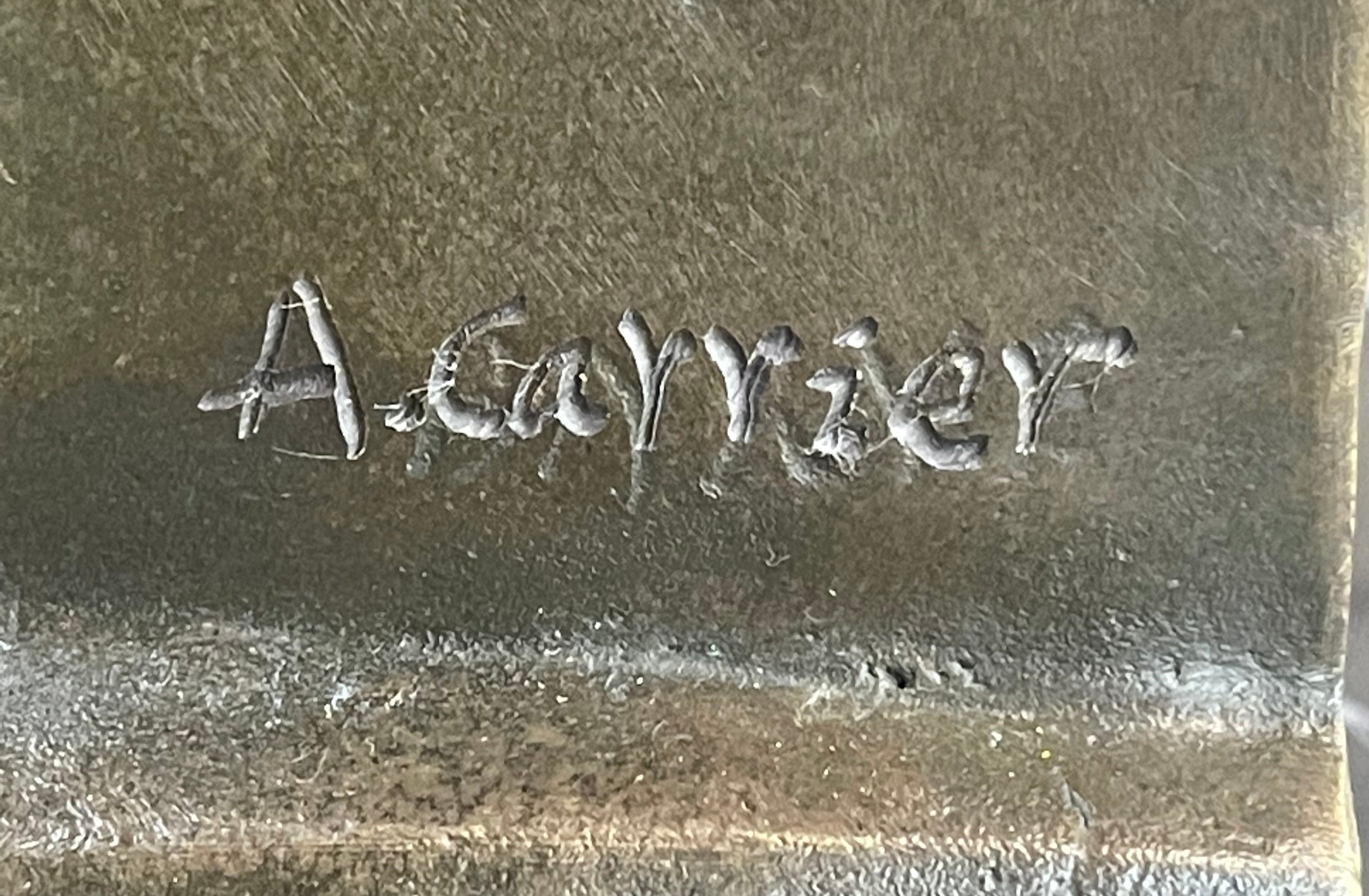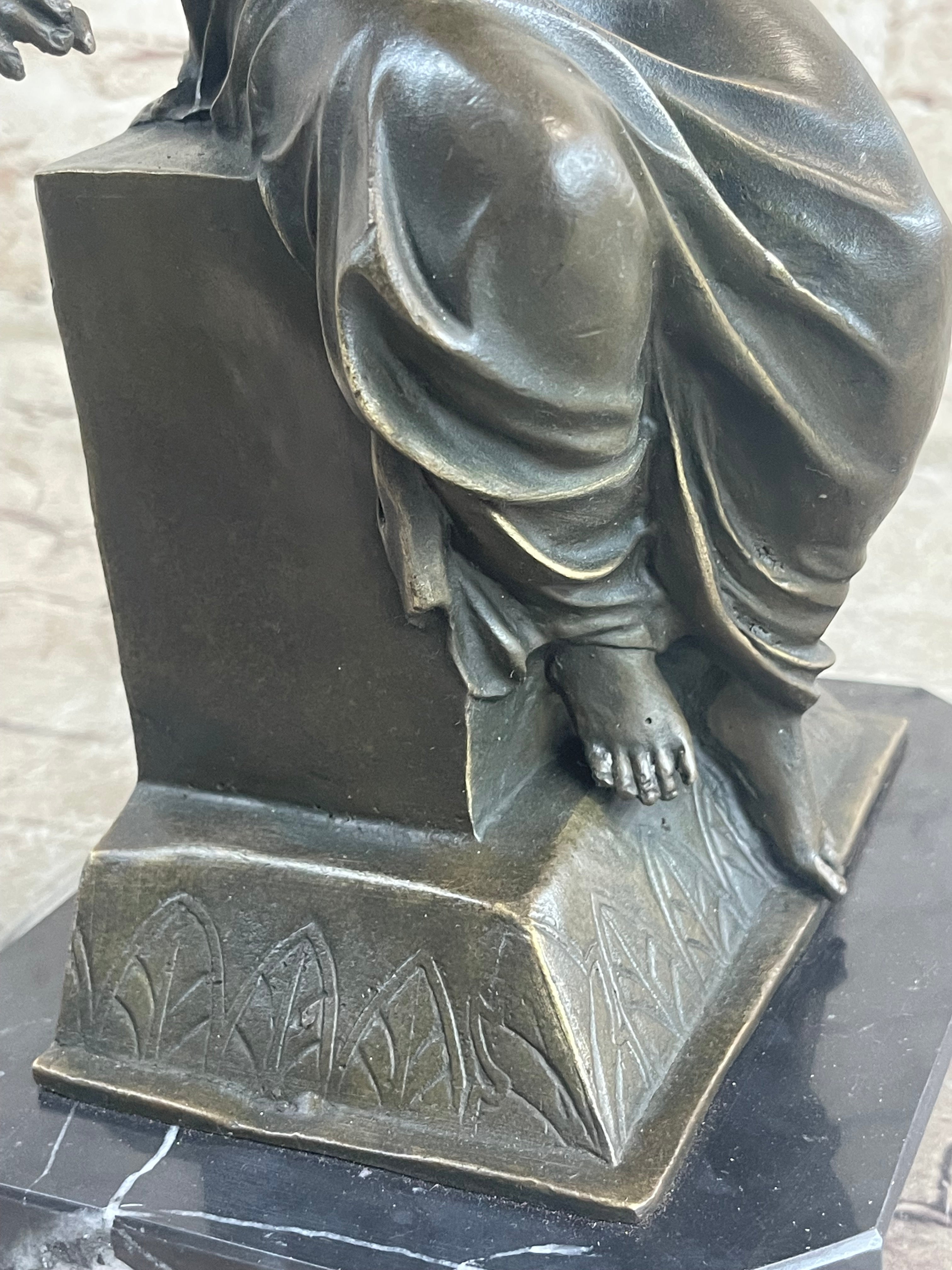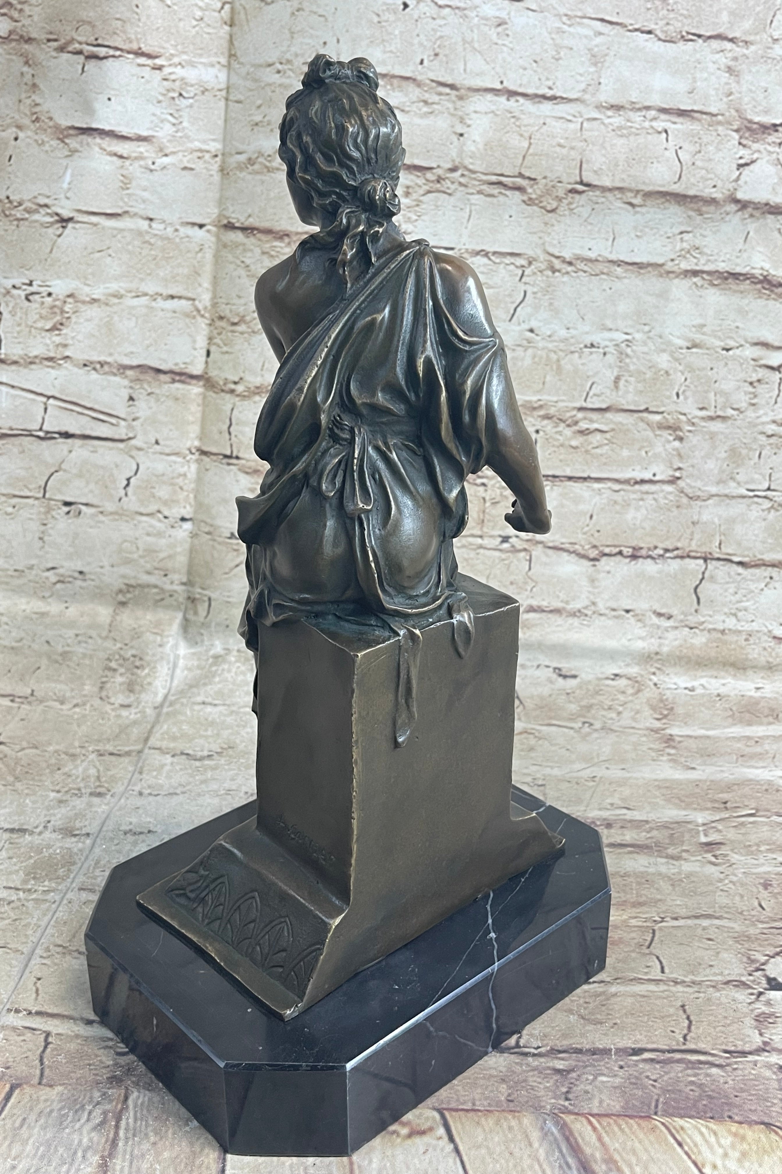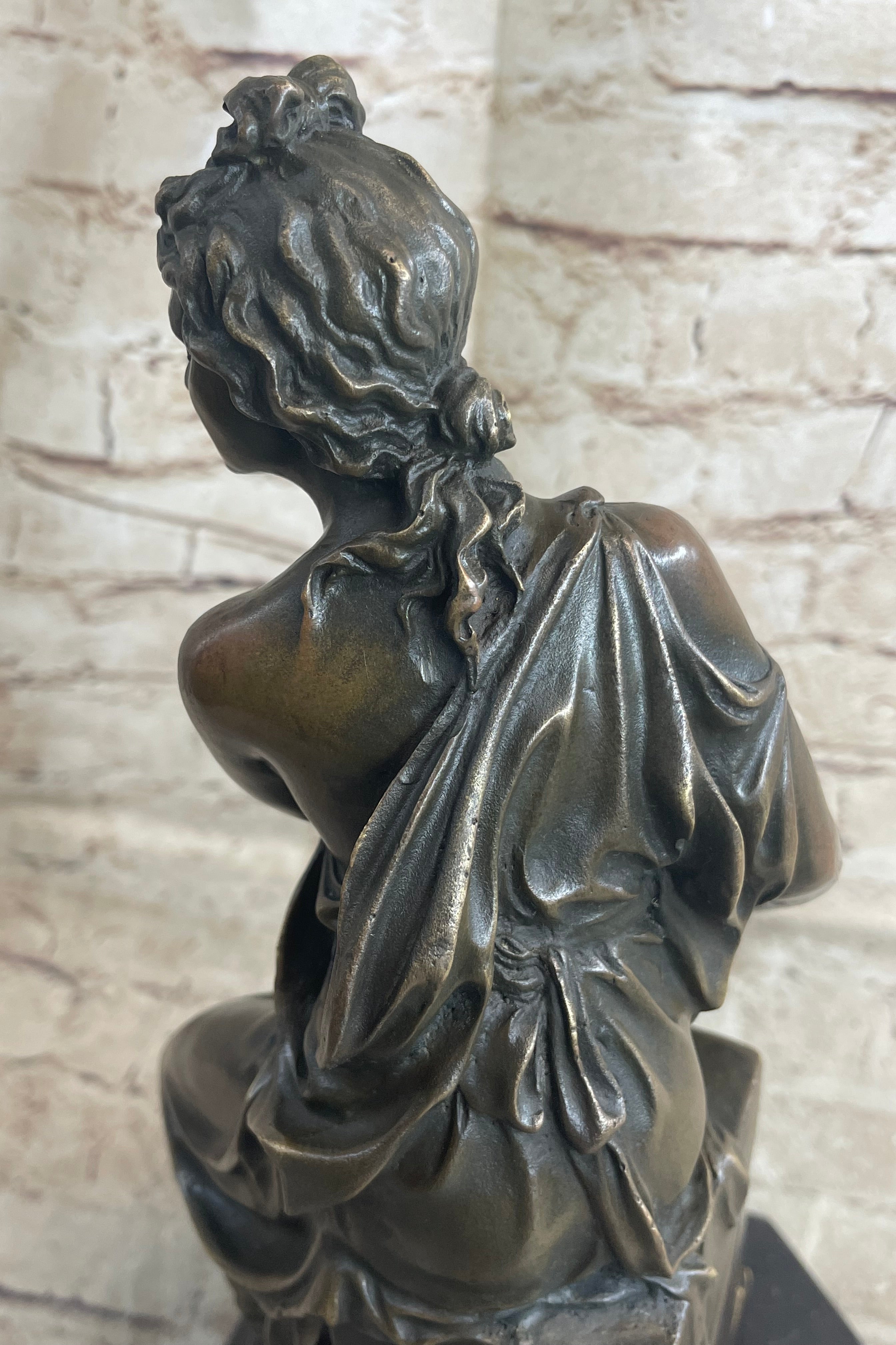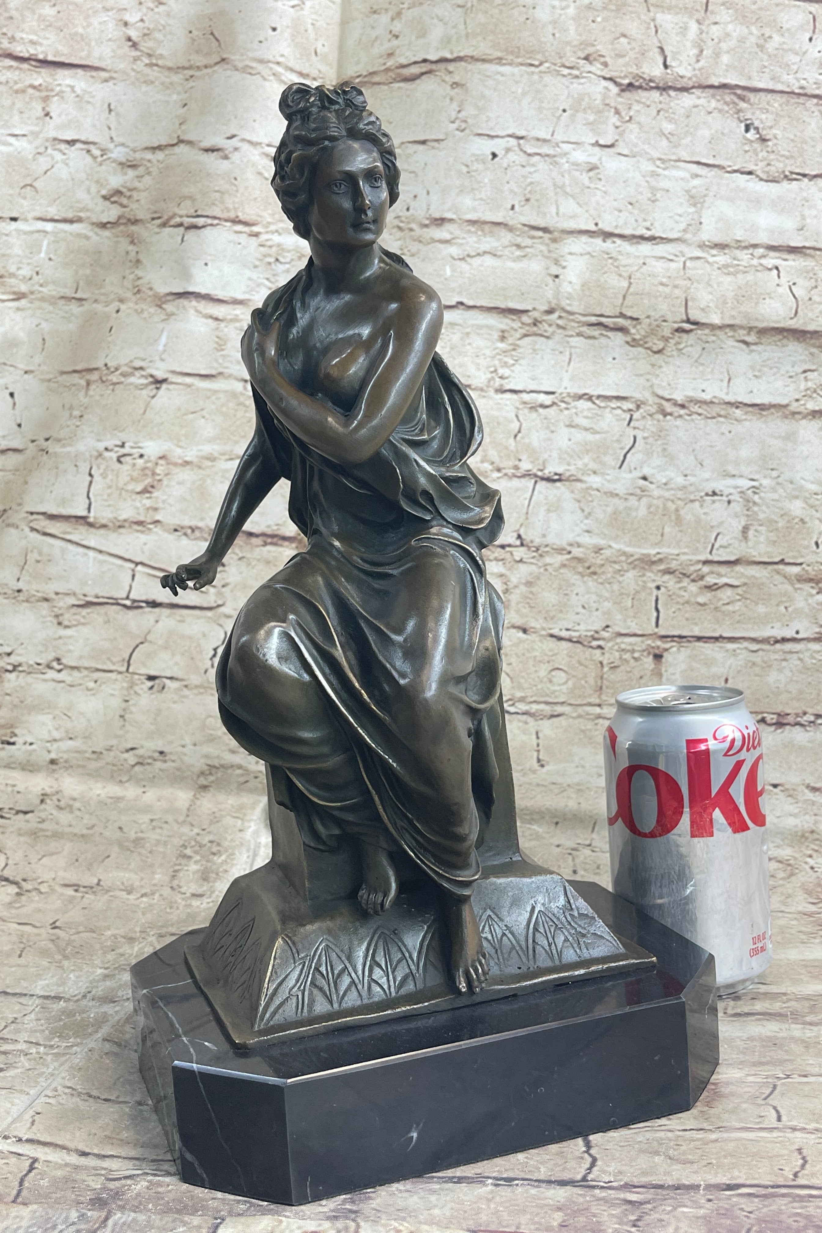 This stern woman sits atop a decorative pedestal. She is dressed in a loose garment that falls just below her cleavage line allowing her breast to show. She brings her other arm across her chest in an effort to cover herself. She has her hair sculpted away from her face, complemented by a bow, which adds to the femininity of this piece. Her eyes are fixed on a point ahead of her in a look that demonstrates the she is a figure of power. This is further enhanced by the fact that she is on top of a pedestal that is very reminiscent of a throne. She is delicately poised but her face remains firm in an expression that lets us know that she is a force to be reckoned with. This piece has been cast using the lost wax method, founded thousands of years ago, ensuring an exquisitely detailed sculpture and is signed A. Carrier that will add grace and beauty to your business or home. Get one for a loved one todayBronze Dimensions with Marble Base: Height 14 1/2" x Width 8"