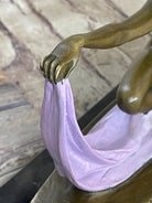 Resting atop a marble base of exquisite artistry, the sculpture gains an additional layer of grandeur. The base, adorned with purple detailed trim, offers a harmonious contrast to the dancer's presence. The signature of the artist, C. Mirval, adorns the piece, affirming its quality and celebrating the fusion of artistry and talent that brings this captivating dancer to life. This sculpture is not merely an object; it's a celebration of grace, art, and the captivating spirit of dance.Bronze Dimensions with Marble Base: Height 10" X Width 12"