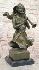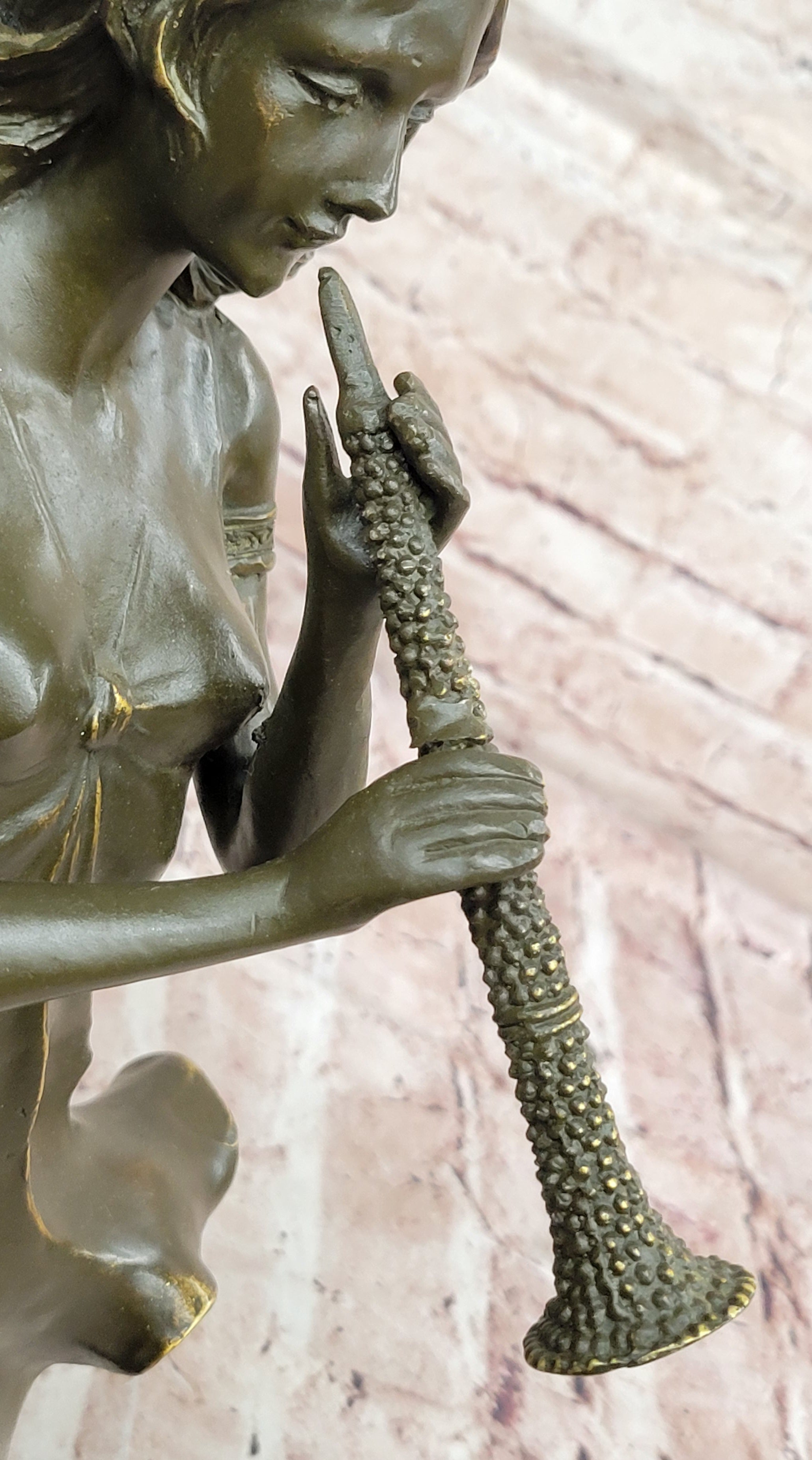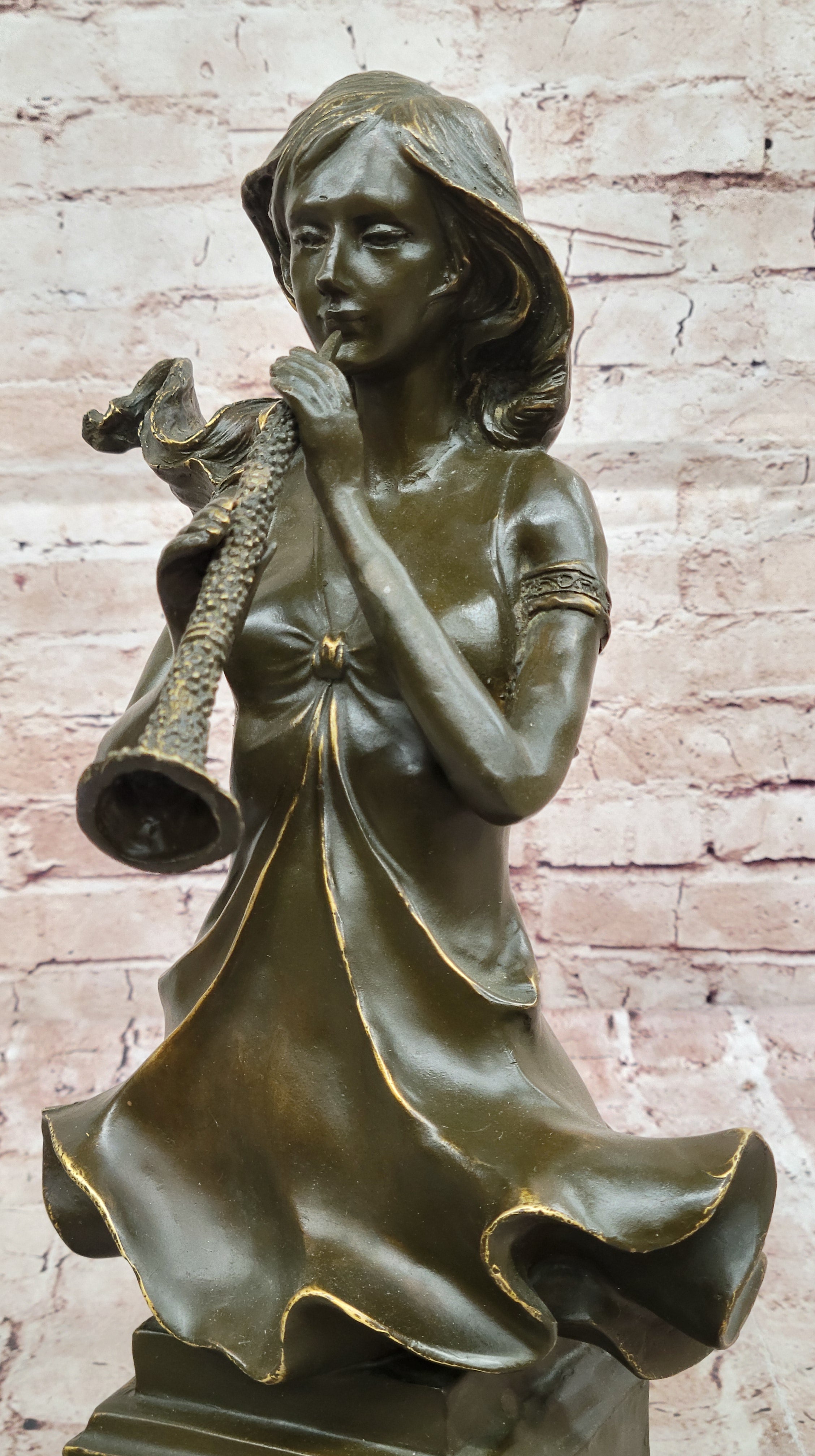 Handcrafted using the traditional lost wax method, the sculpture is made of genuine bronze and finished with a rich brown patina that accentuates its detailed contours and soft textures. From the folds of her attire to the fine lines of the horn, the craftsmanship demonstrates a high level of artistry and attention to form. The patina adds depth and warmth, complementing the statue's classical style.