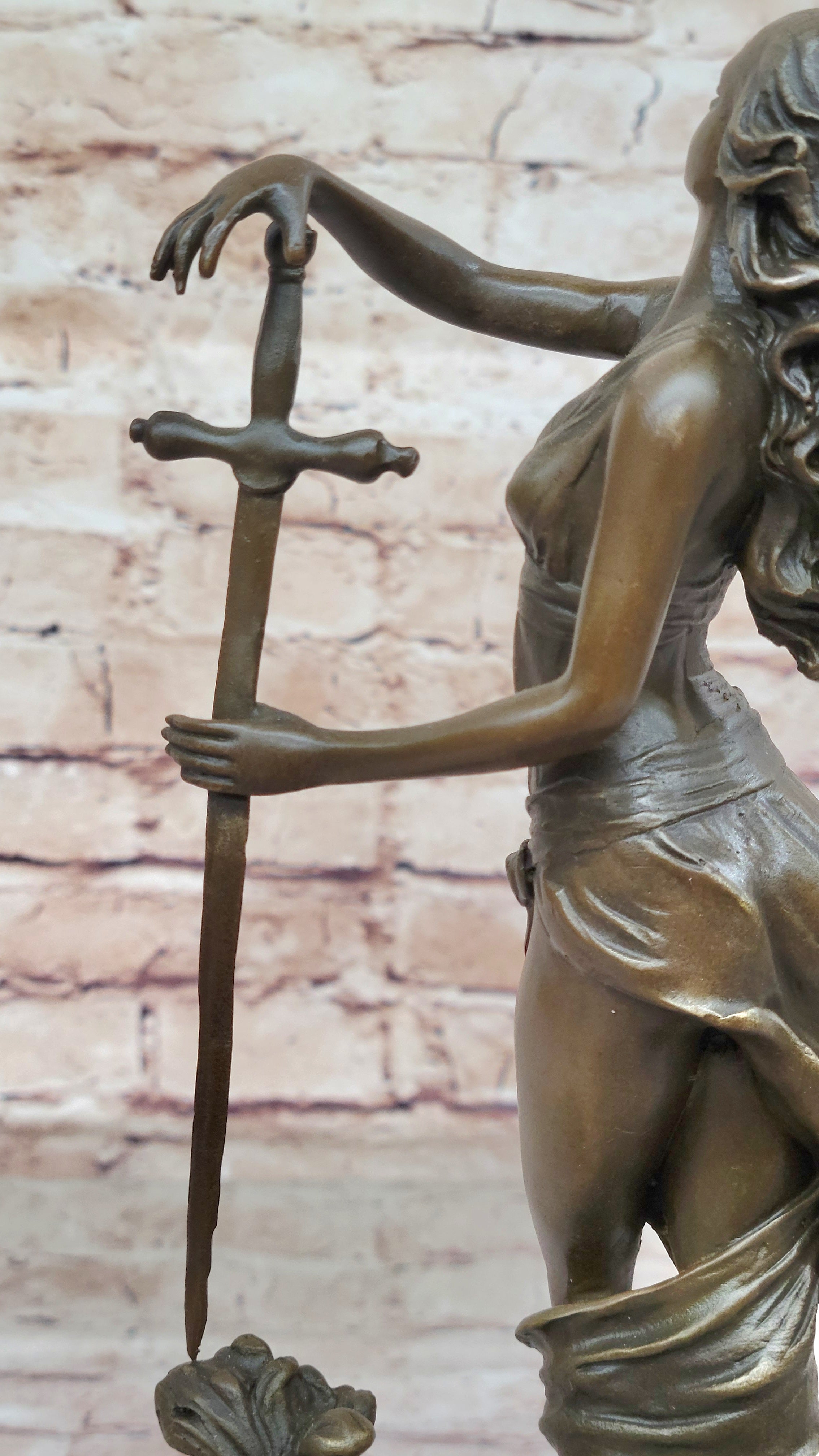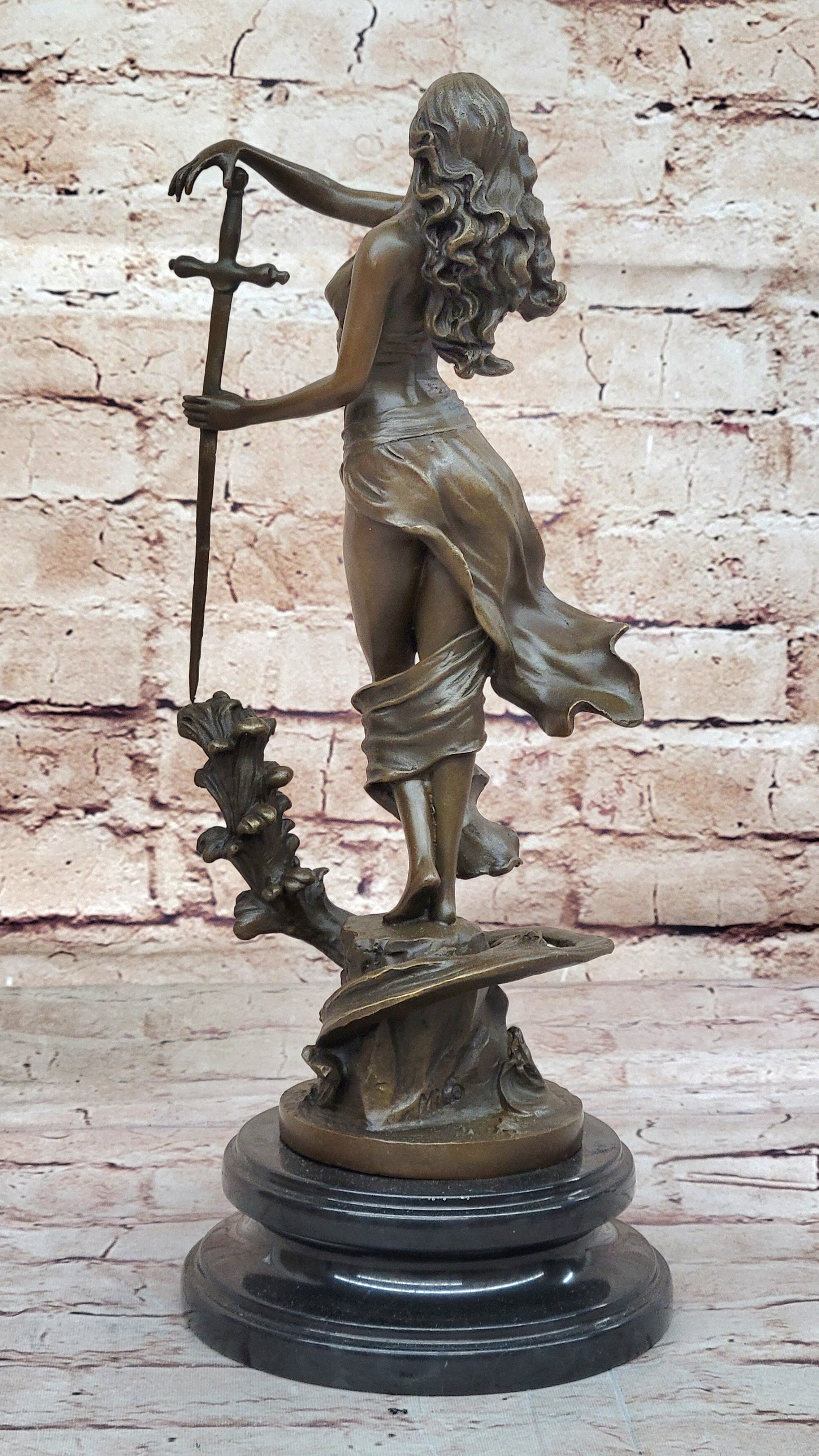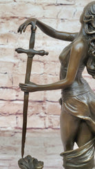 The woman's poised stance is heightened by her deliberate hand gestures. Her left hand holds a sword pointed downward, while her suspended right arm makes a fluid motion to turn the sword upright. This nuanced movement adds a layer of dynamism to the sculpture, capturing a moment frozen in time. Crafted through the age-old method of lost-wax casting, the sculpture bears the distinct touch of the artist's skill and attention to detail.