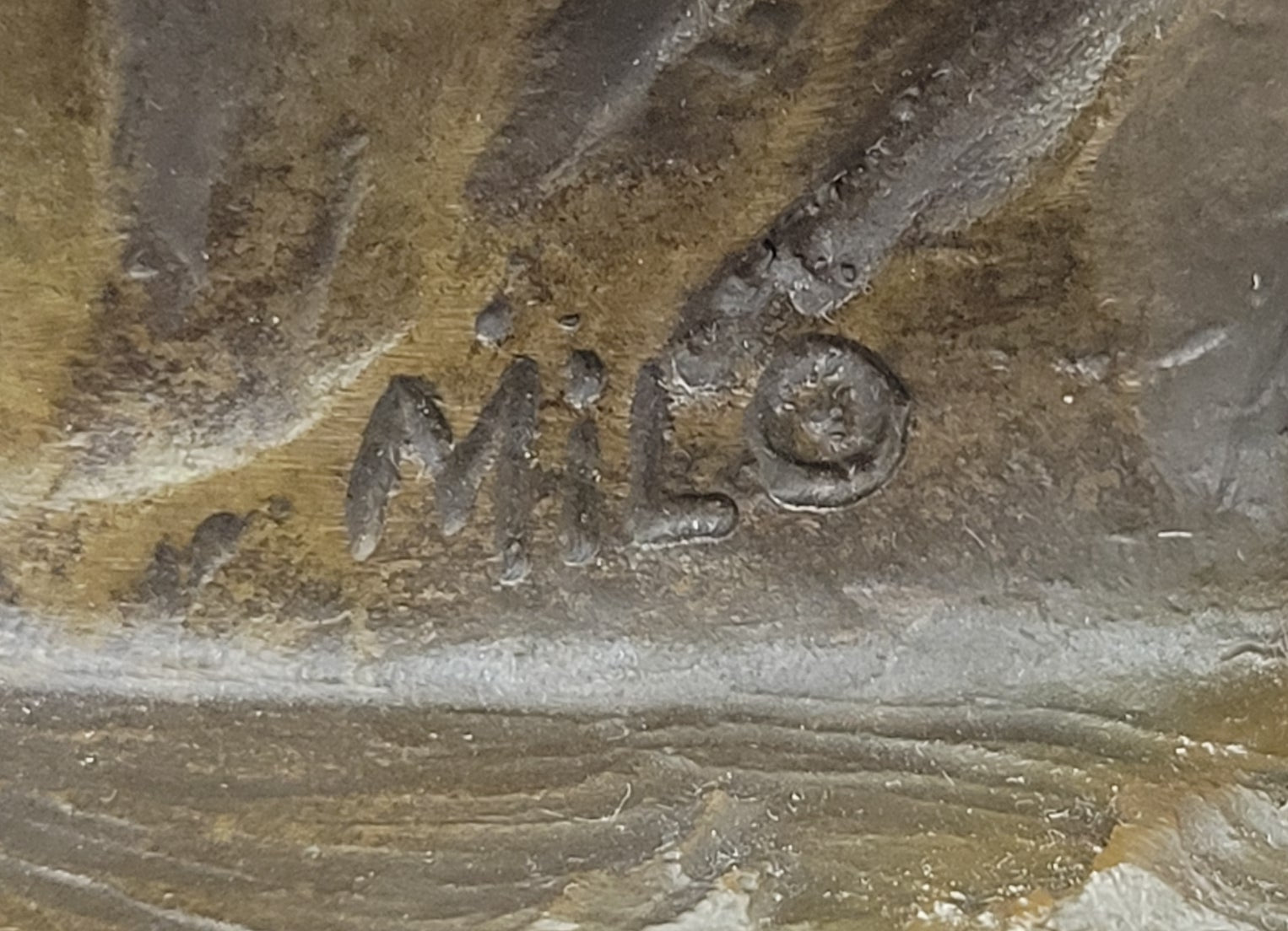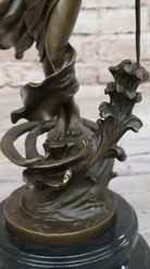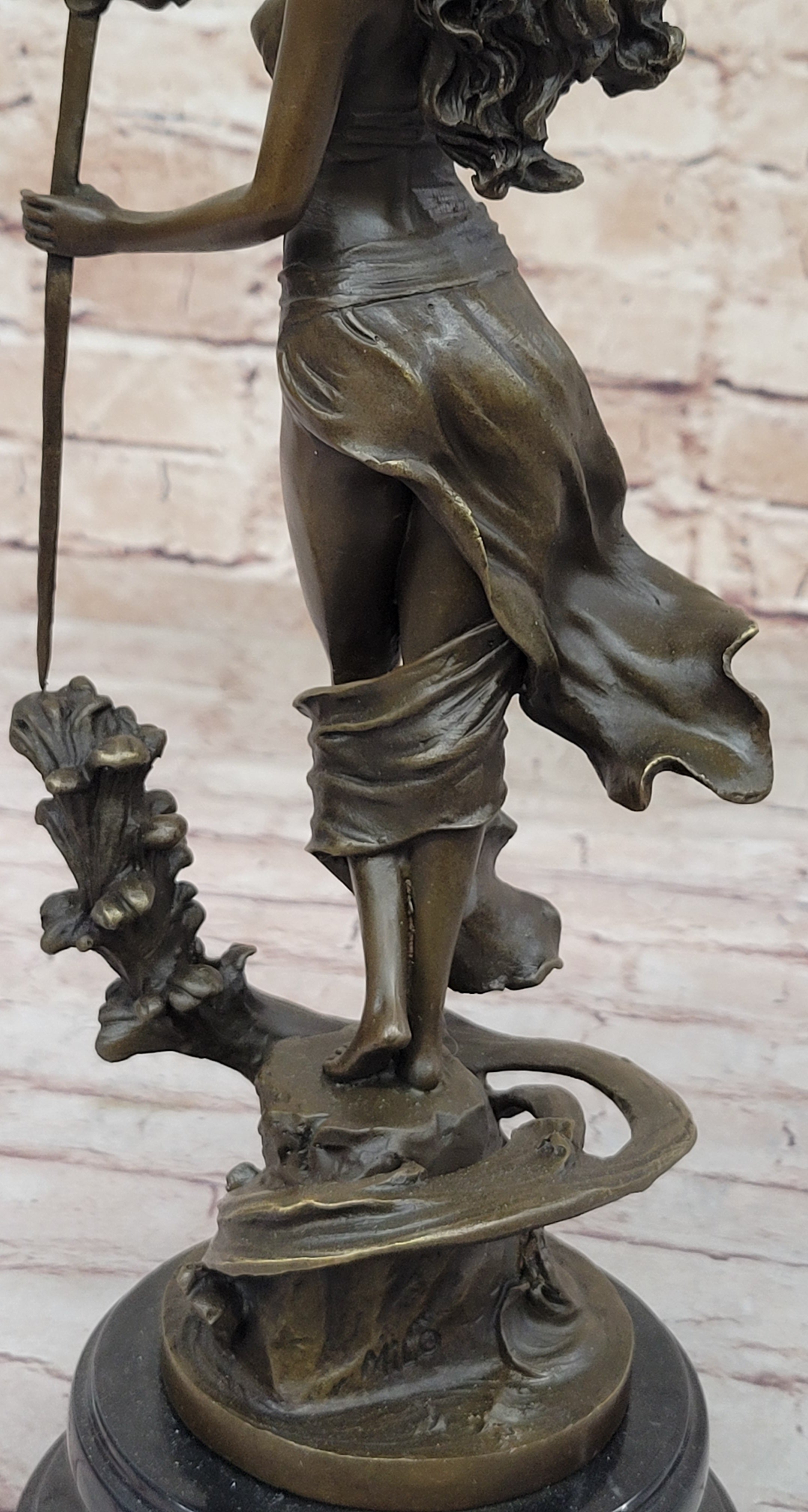 To accentuate its visual impact and offer stability, the sculpture is mounted on a sleek black marble base. The artist's signature, Milo, proudly adorns the sculpture, serving as a testament to its authenticity and the renowned artist's contribution to the world of bronze sculptures. This exquisite piece invites viewers to appreciate the harmonious blend of form, movement, and craftsmanship, making it a timeless addition to any art collection.Bronze Dimensions with Marble Base: Height 14" X Width 8"