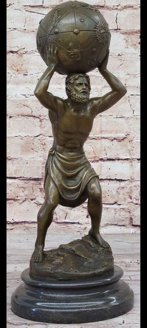 This exquisite bronze sculpture is a stunning depiction of Atlas, the Titan from Greek mythology who bears the weight of the heavens upon his shoulders. As a symbol of his eternal punishment, Atlas stands with his powerful figure stooped beneath the celestial spheres. This piece captures the timeless struggle between Earth and Sky, beautifully rendered through the intricate details and craftsmanship.