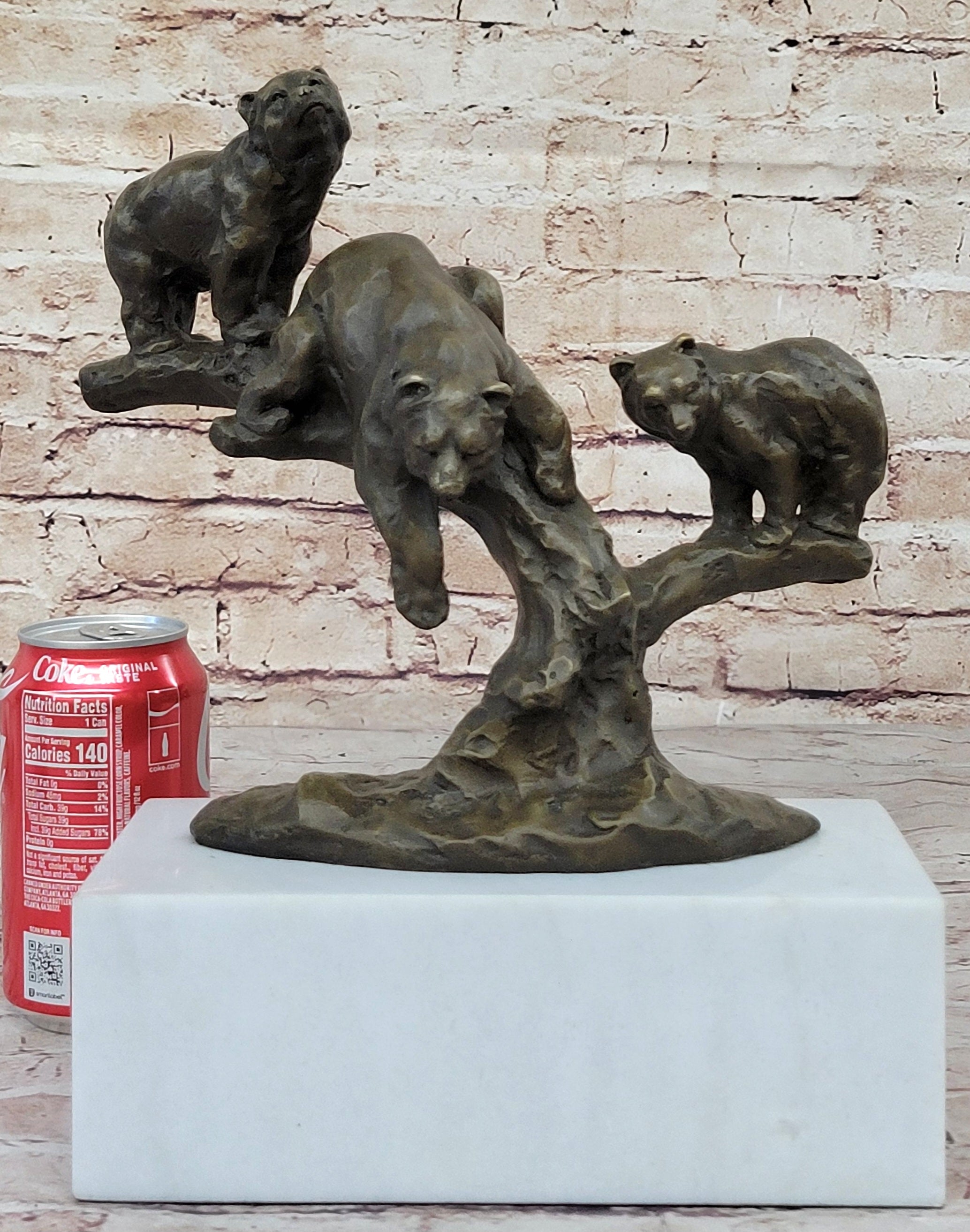 This exquisite bronze sculpture captures the heartwarming scene of a mother bear and her two playful cubs. Nestled on a sturdy branch, the mother bear exudes an air of serene contentment as she watches over her lively offspring. Her protective gaze, marked by knitted brows, conveys a sense of primal power and tender motherhood. The cubs, momentarily pausing their playful antics to engage with each other, represent the boundless energy and curiosity of youth.