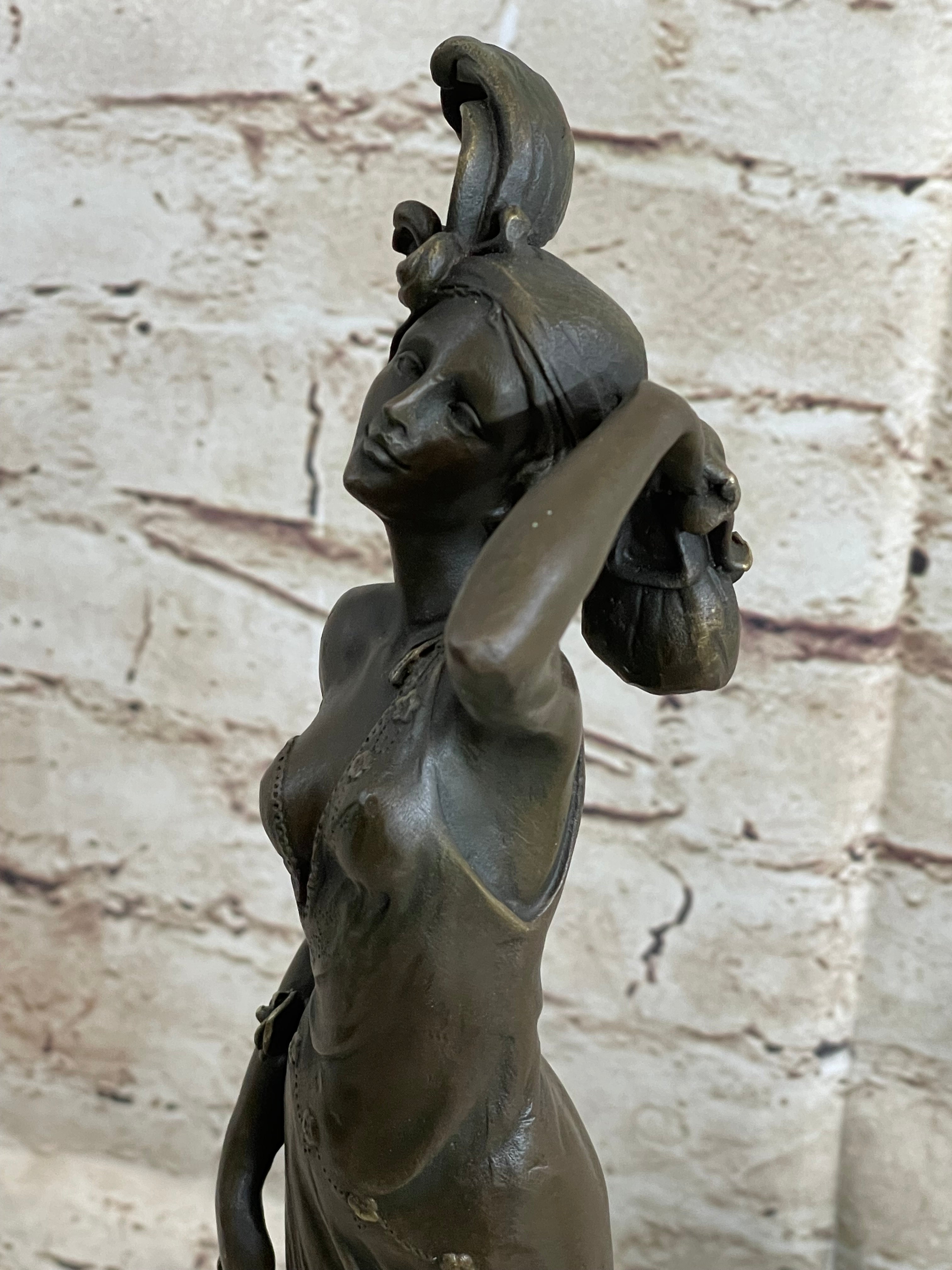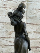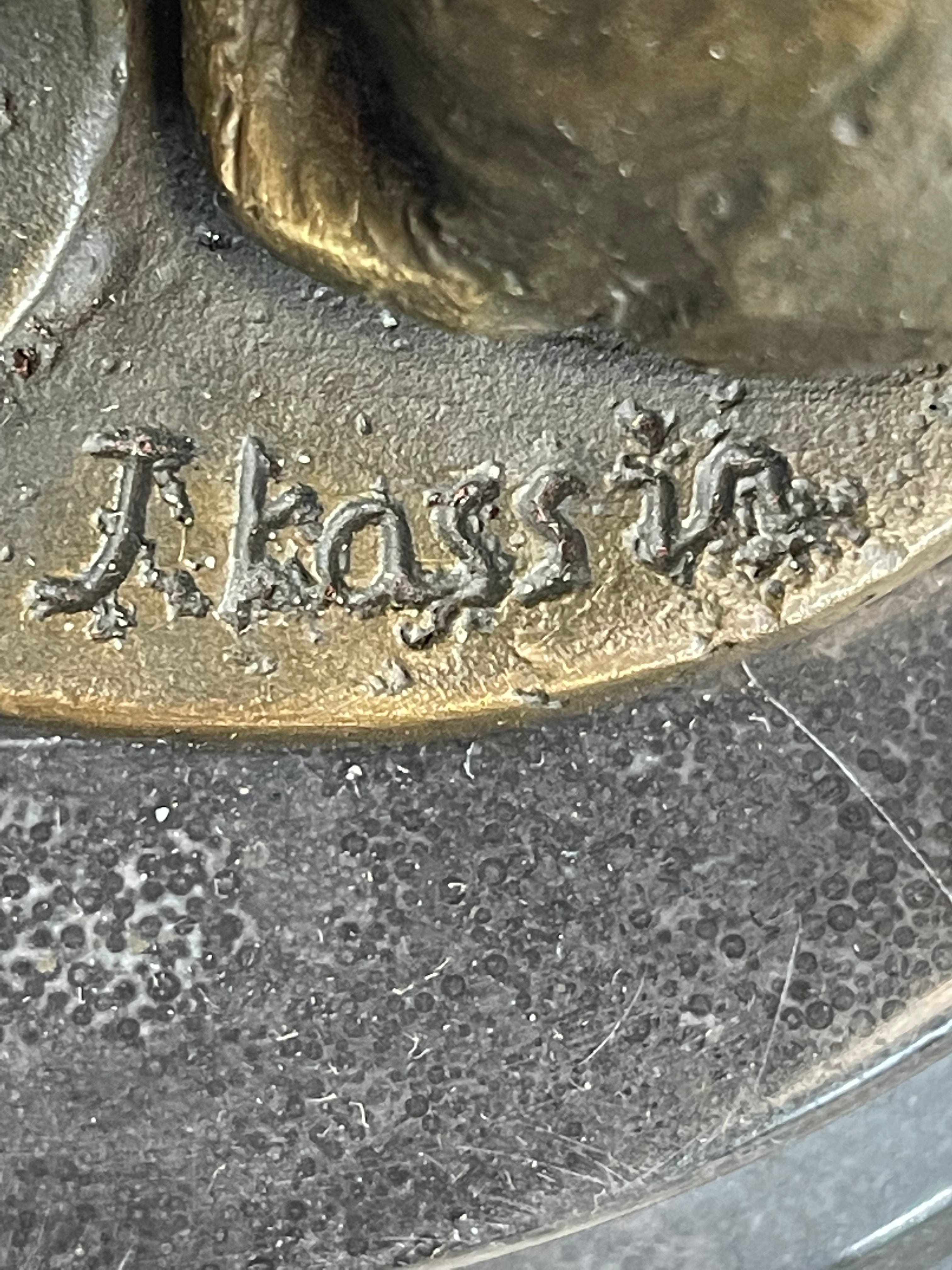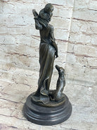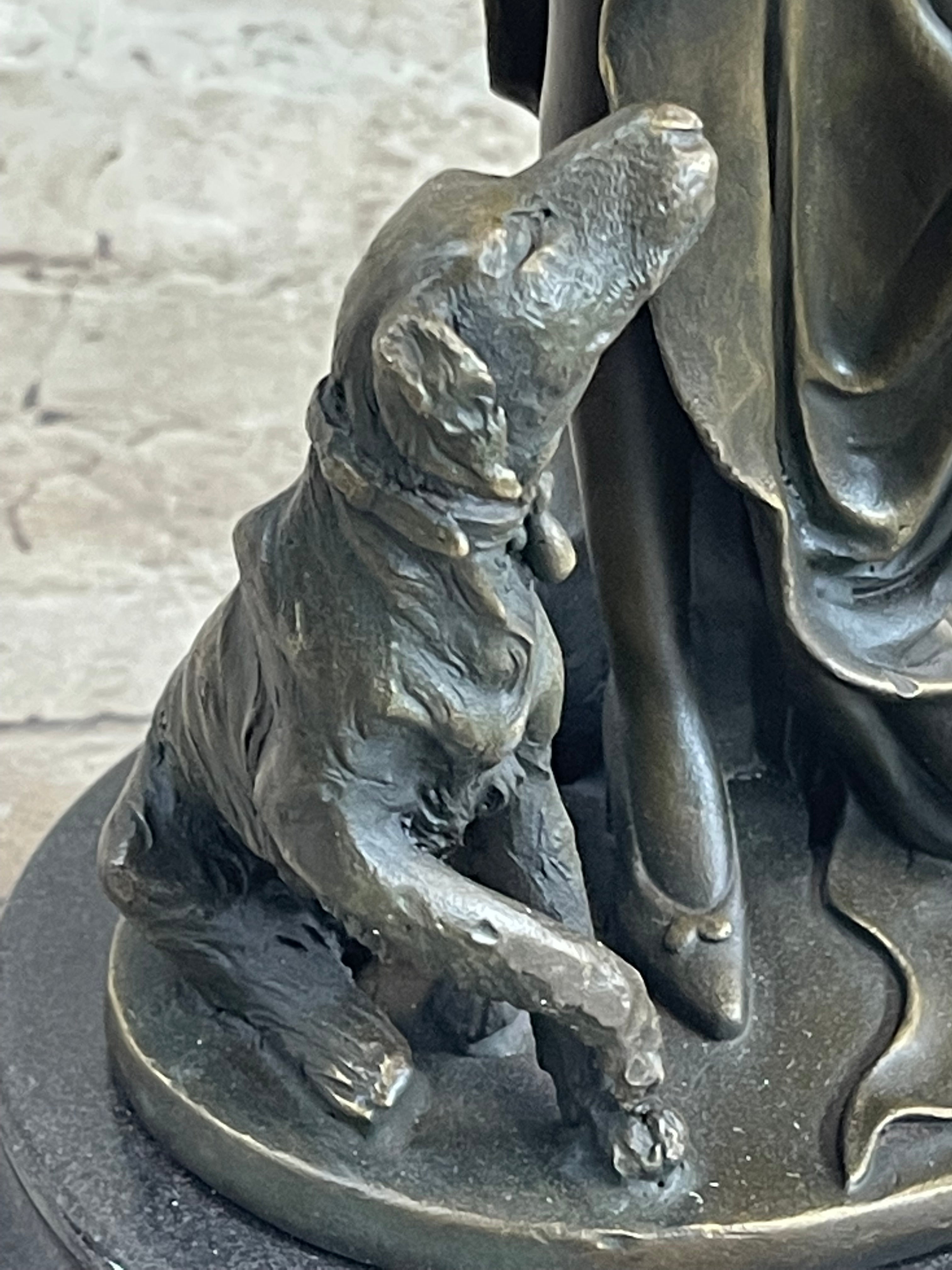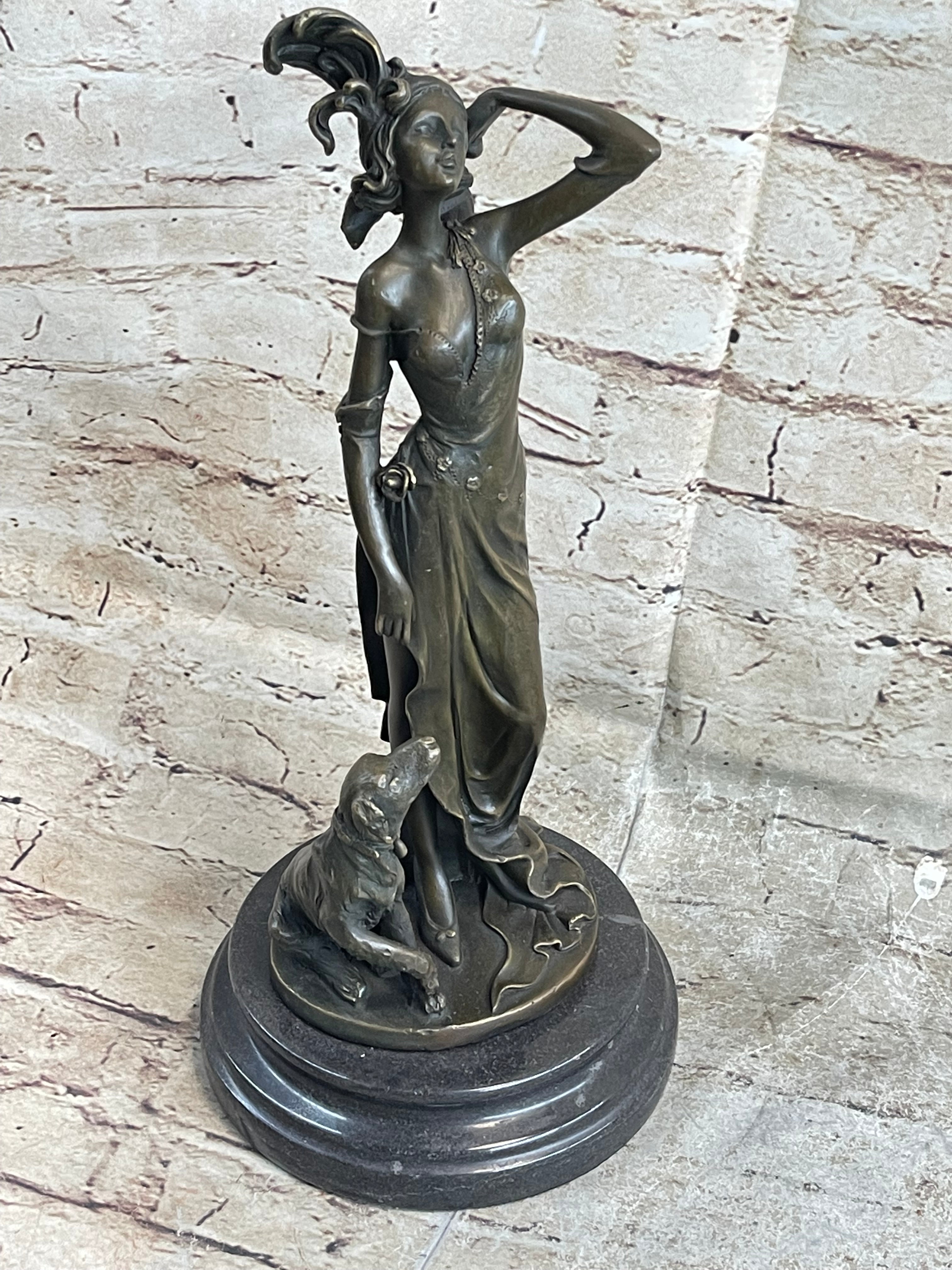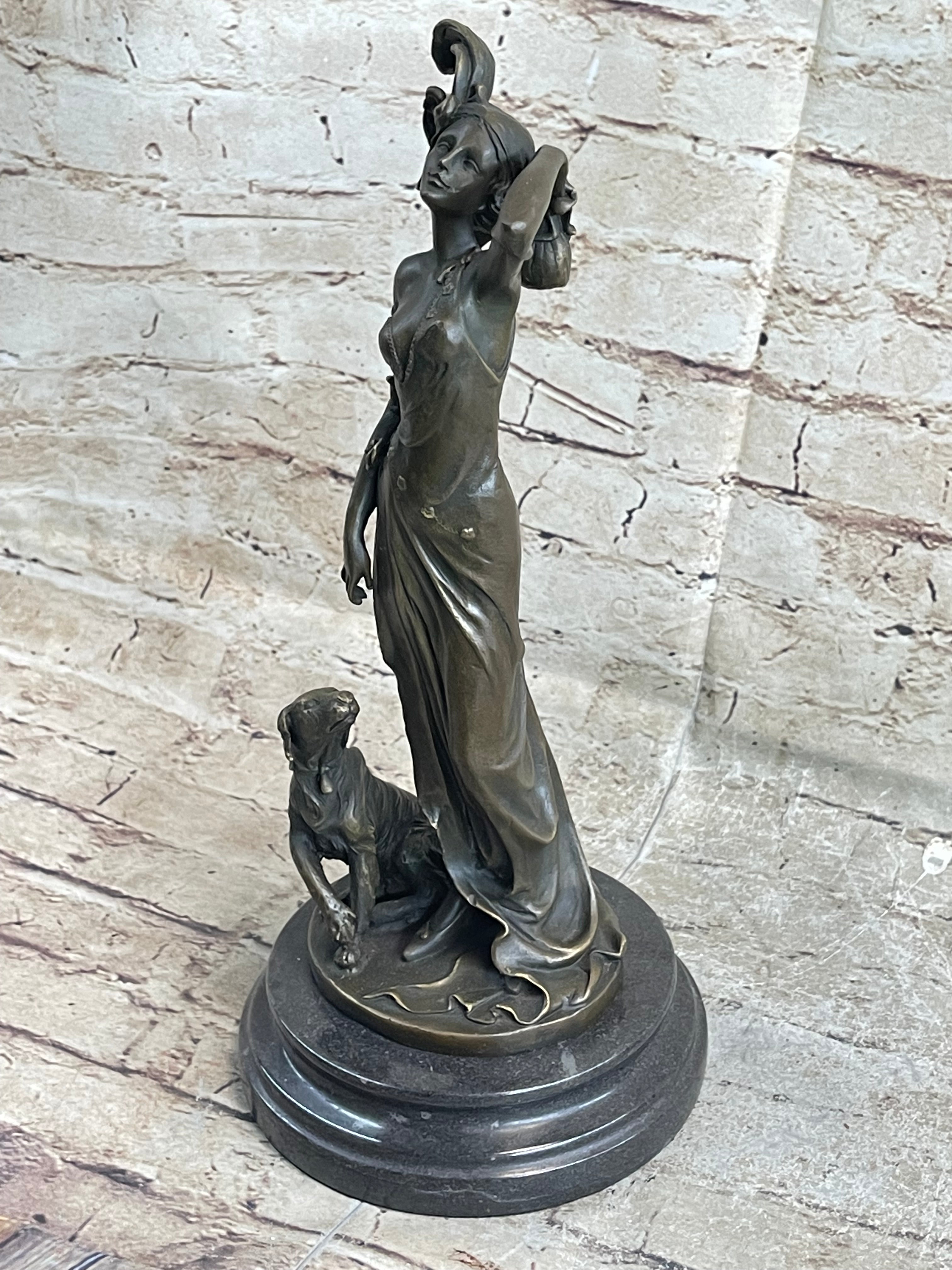 This is a wonderful statue of a woman with her dog. The woman is middle aged and fancily dressed. She is wearing a long beautifully detailed dress that hangs from her shoulders and has a broach under her bosom. Around her waist her dress is gathered giving her form more curves, each crease detailed with a pattern. On her thigh is a clip that again holds up the fabric of her dress, revealing her slender leg and bare feet. Her hair is wavy and gathered in a bun that a braid hangs from to her shoulders. Her eyes are closed and she has the look of relaxation while her right hand fans her face with a feather. Staring upwards at her is a loyal creature, an Egyptian pharaoh dog, slender with pointed ears, her hand reaches near him and he leans to embrace the affection. Handmade using the "Lost Wax Method" and made of solid 100% bronze with a two tone brown patina. Signed J.Kassin.Bronze Dimensions with Marble Base: Height 14" x Width 6"