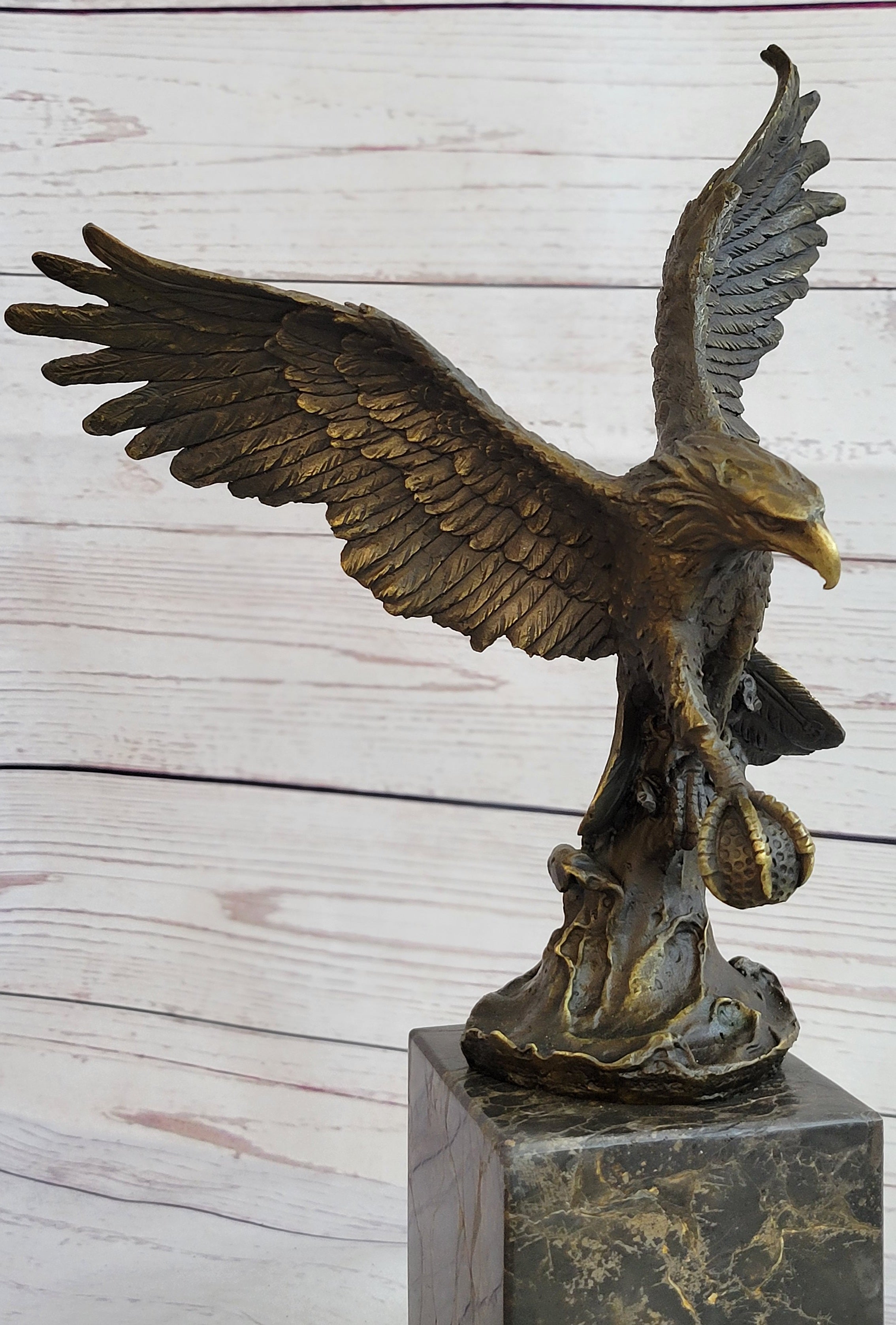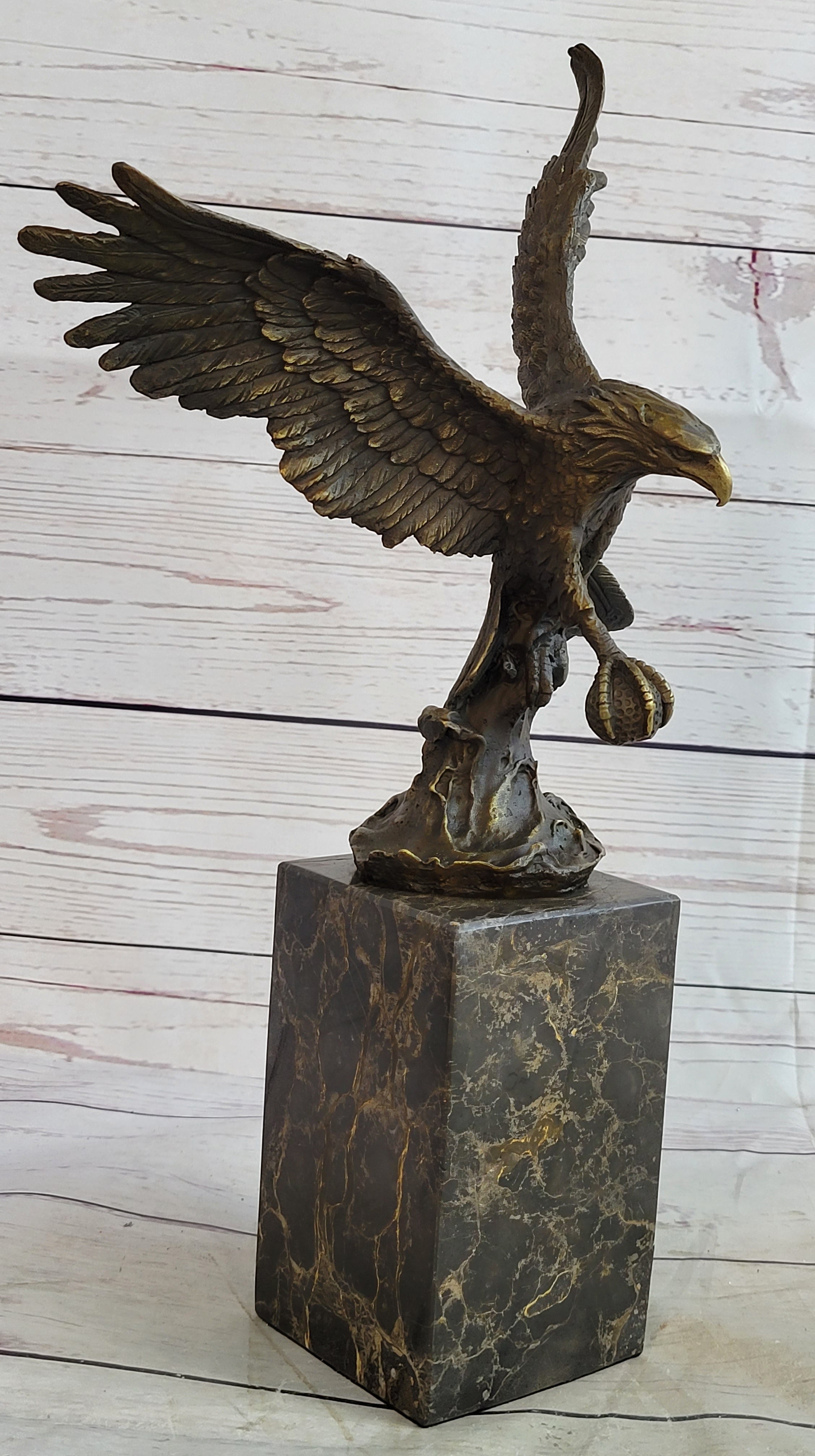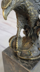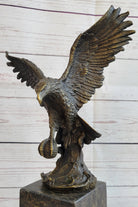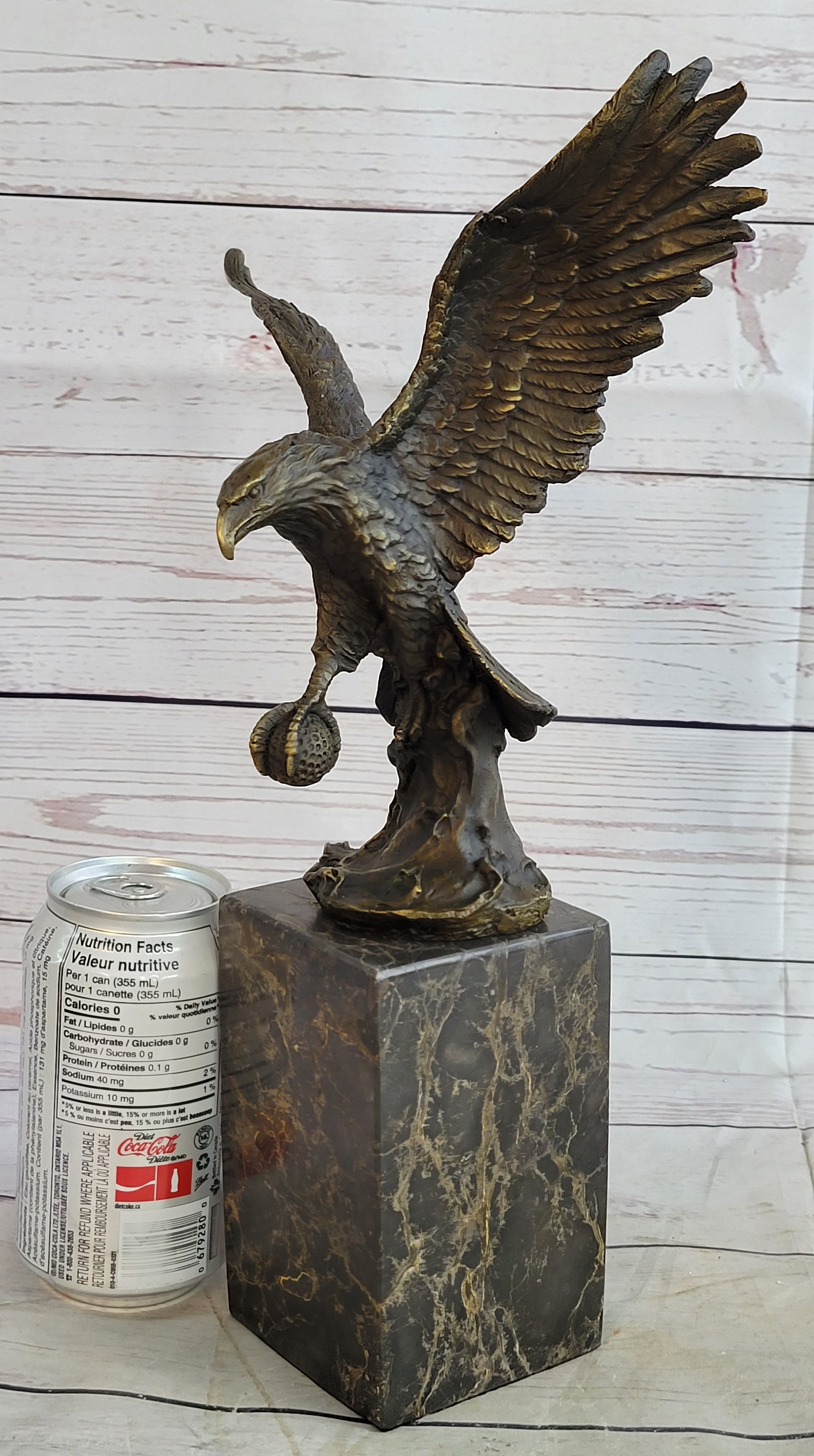 Handcrafted with meticulous attention to detail, this sculpture is a testament to the artist's skill and craftsmanship. The renowned "Lost Wax Method" was employed to create this stunning piece, ensuring that every feather, every curve, and every nuance of the eagle's form is faithfully rendered. The sculpture features a captivating two-toned brown patina that enhances its depth and realism, adding to its timeless appeal.