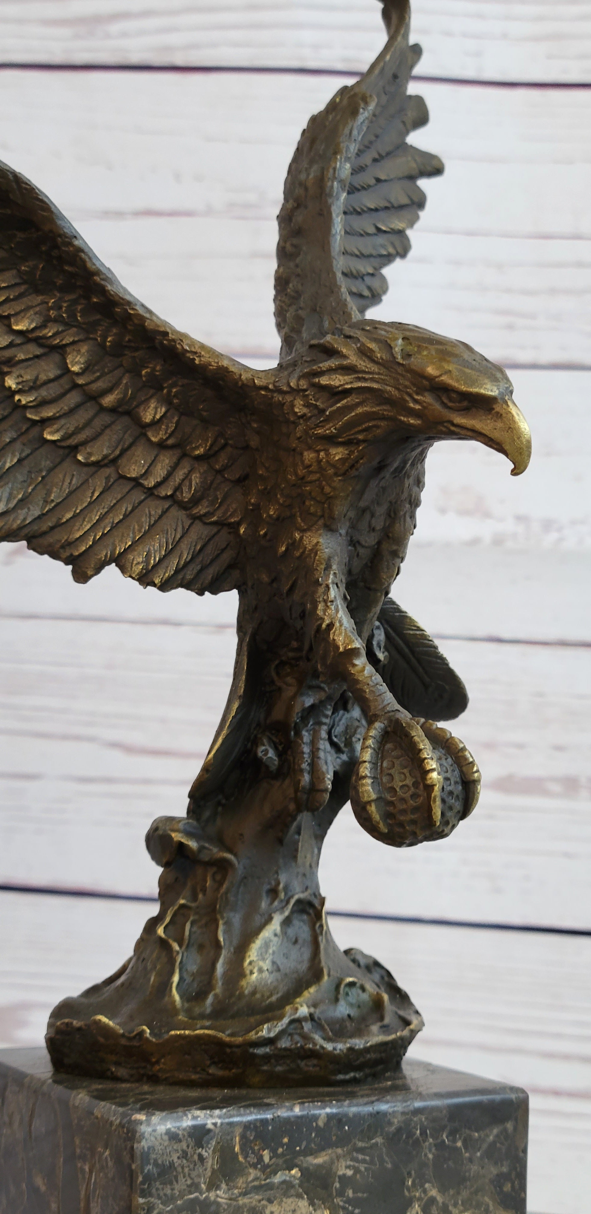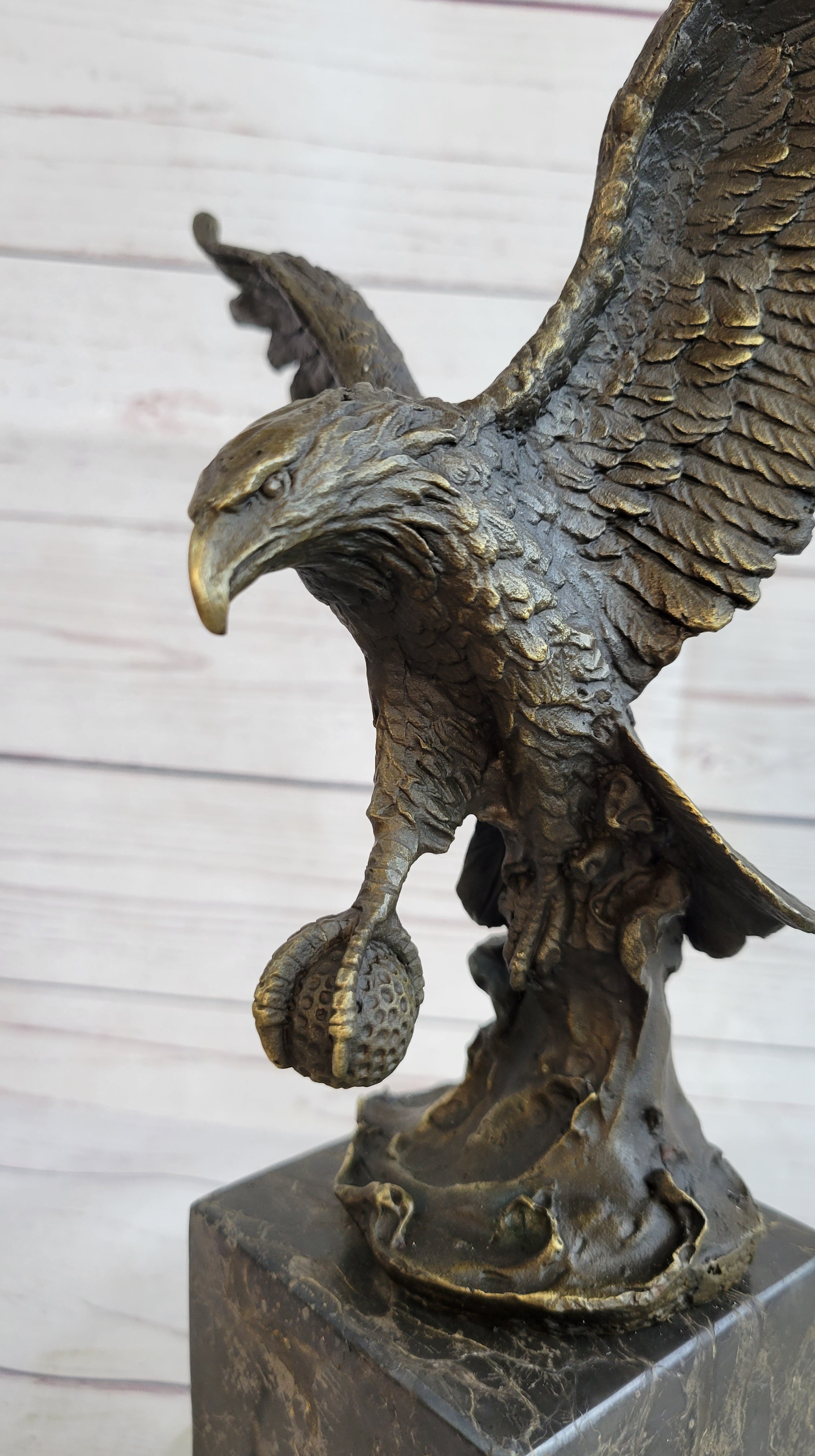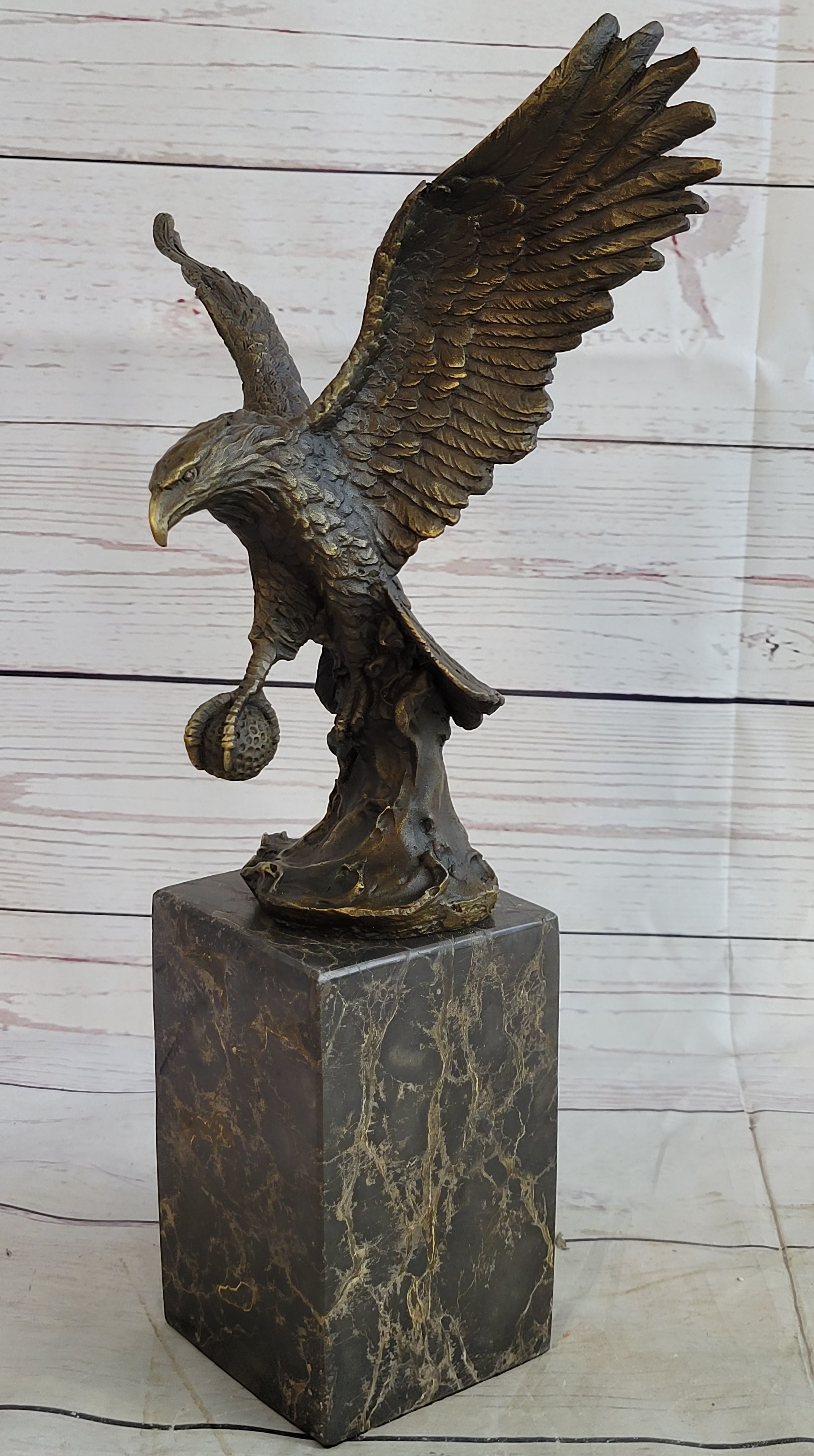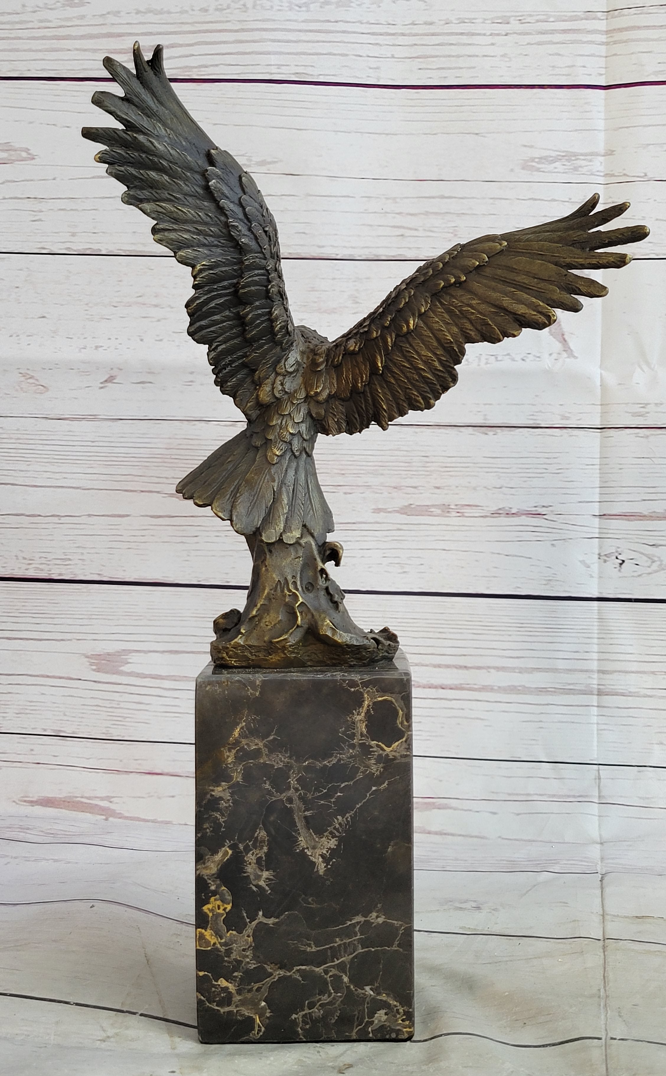 Handcrafted with meticulous attention to detail, this sculpture is a testament to the artist's skill and craftsmanship. The renowned "Lost Wax Method" was employed to create this stunning piece, ensuring that every feather, every curve, and every nuance of the eagle's form is faithfully rendered. The sculpture features a captivating two-toned brown patina that enhances its depth and realism, adding to its timeless appeal.
