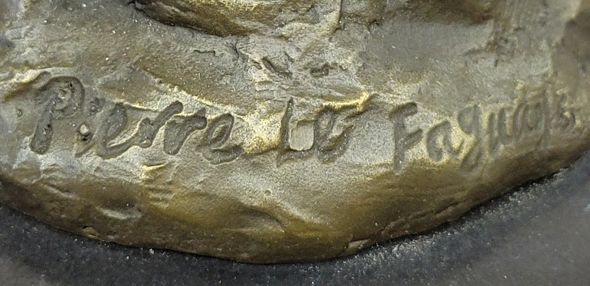 Diana's significance in Roman religion endures today in modern practices like Religio Romana Neopaganism and Stregheria. This sculpture pays homage to her timeless influence and is a testament to the skill and artistry of Pierre Le Faguays. Whether as a symbol of reverence for Roman mythology or a striking piece of art, this sculpture is a remarkable addition to any collection.Bronze Dimensions with Marble Base: Height 20" X Width 7 1/2"