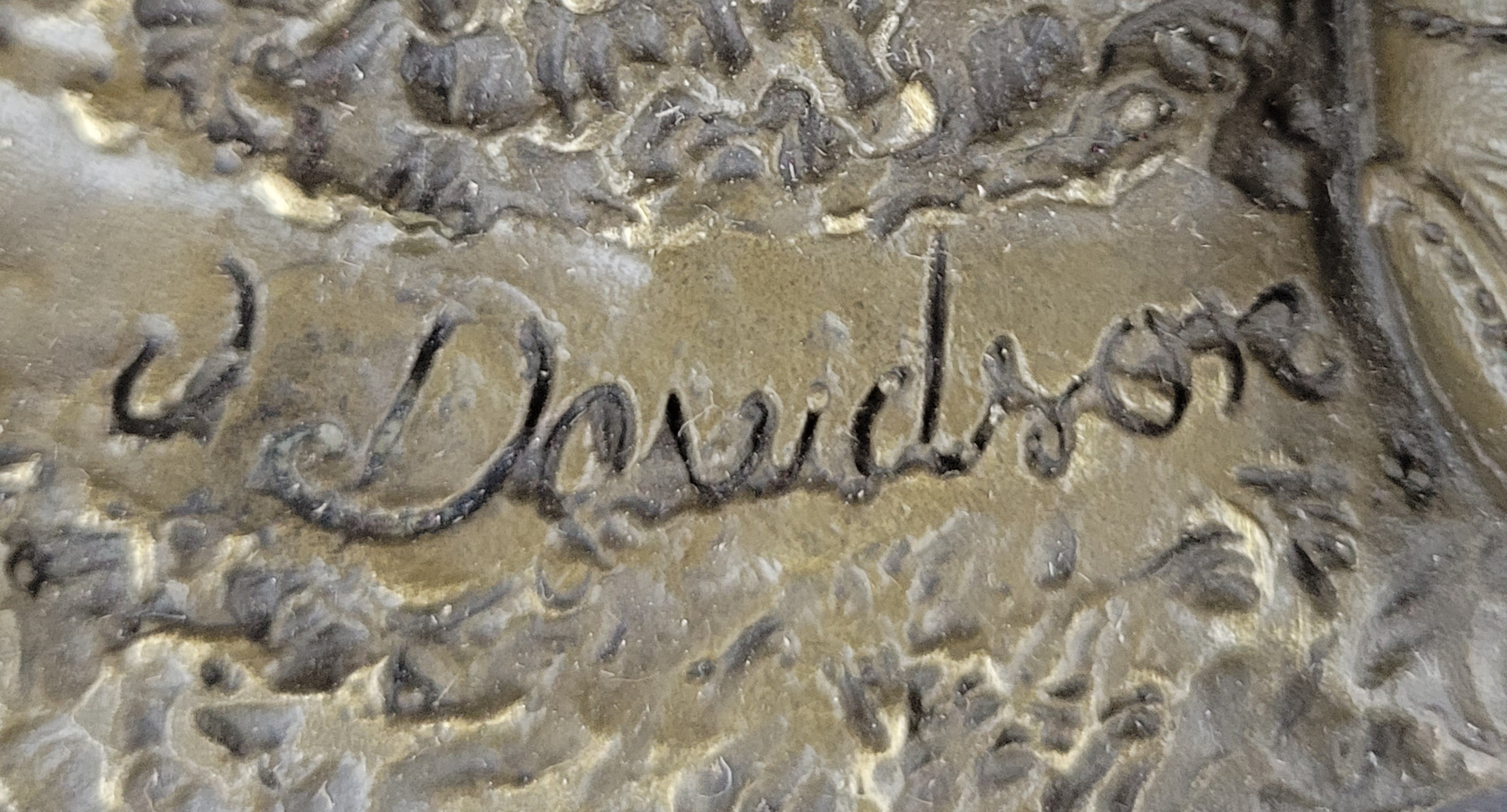 Using the time-honored lost wax method, each nuance of the sculpture is carefully brought to life, ensuring a one-of-a-kind masterpiece. The rich brown patina adds depth and warmth to the bronze, highlighting the intricate textures and expressions. This limited-edition sculpture is signed by the talented artist Davidson, adding a touch of authenticity and prestige to the piece.