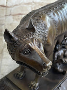 This captivating bronze statue captures the essence of a timeless tale, featuring a she-wolf standing proudly over two infants. The statue's brown patina gracefully enhances its intricate details, evoking a sense of antiquity. The she-wolf's powerful presence is accentuated by the meticulously sculpted thicker mane adorning her neck and spine, while her upright ears and pronounced ribs add to her lifelike representation. Her unwavering stance symbolizes protection as she shields the two boys, Romulus and Remus, nestled beneath her. One child sits with palms upturned beneath her breasts, his mouth positioned just below her nipple, while the other kneels beside him, mirroring the same hopeful gesture. Resting upon a square slab of Rose marble, this remarkable sculpture is a testament to the lost wax method and is artistically signed by the sculptor, Romulus.