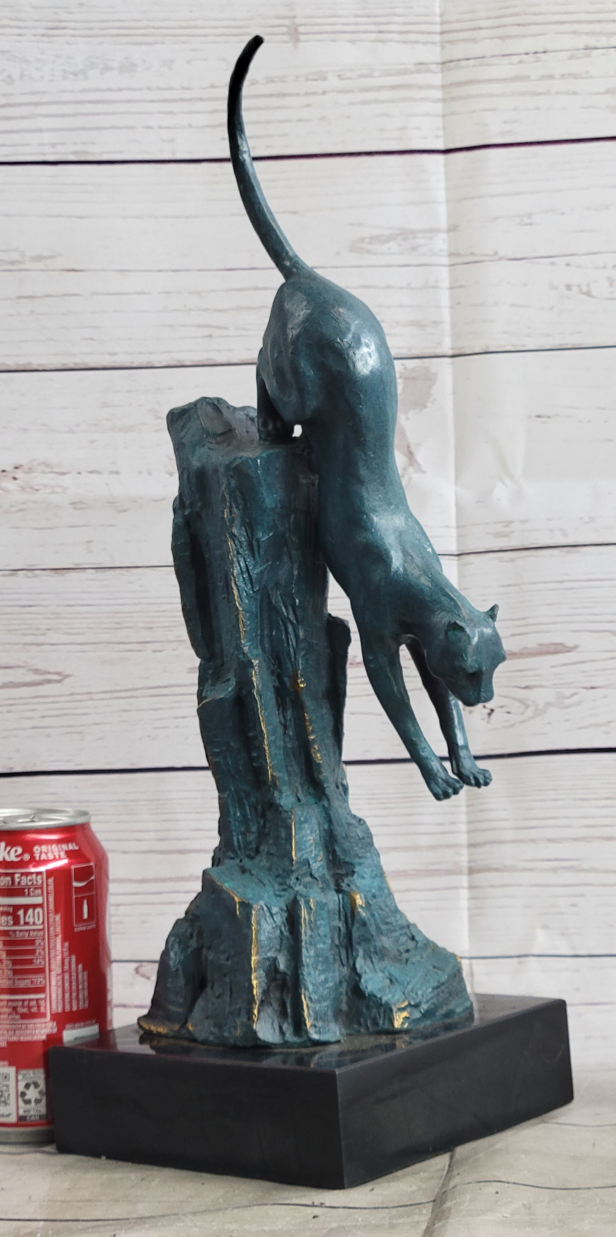 Experience the breathtaking power and grace of nature with this stunning bronze sculpture titled "Cougar Jumping from a Cliff." Handcrafted with meticulous attention to detail, this genuine solid bronze masterpiece captures the majestic cougar in mid-leap, frozen in time. The artist, Milo, skillfully utilizes the ancient lost wax method to bring this magnificent creature to life, while the vibrant green patina adds a touch of realism and elegance. Mounted on a sleek black marble base, this sculpture is a true collector's item, signed by the artist himself.