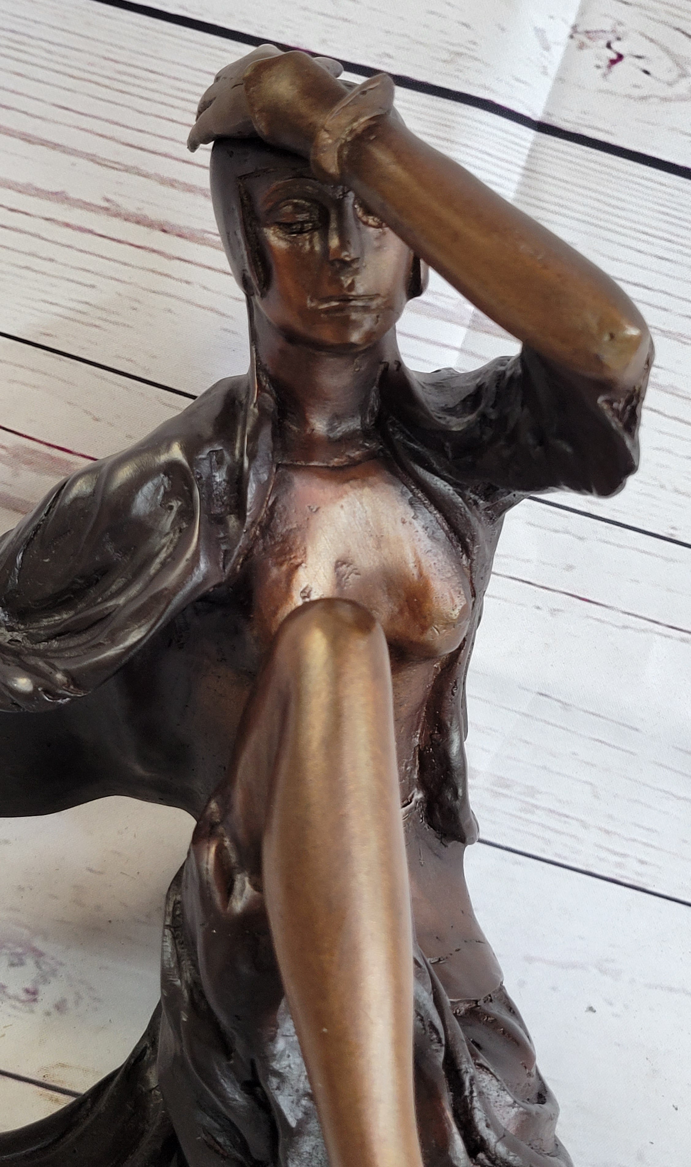 The alluring woman is captured in a seductive pose, her upper torso bending forward with her hands resting gracefully on her knees, forming a captivating L-shape with her figure. From her head to her dainty, pointed toes, she is adorned in a strappy bodysuit embellished with intricate beads and sequins that shimmer subtly, accentuating her graceful form. This handmade bronze sculpture beautifully showcases the delicate artistry and attention to detail that went into its creation.