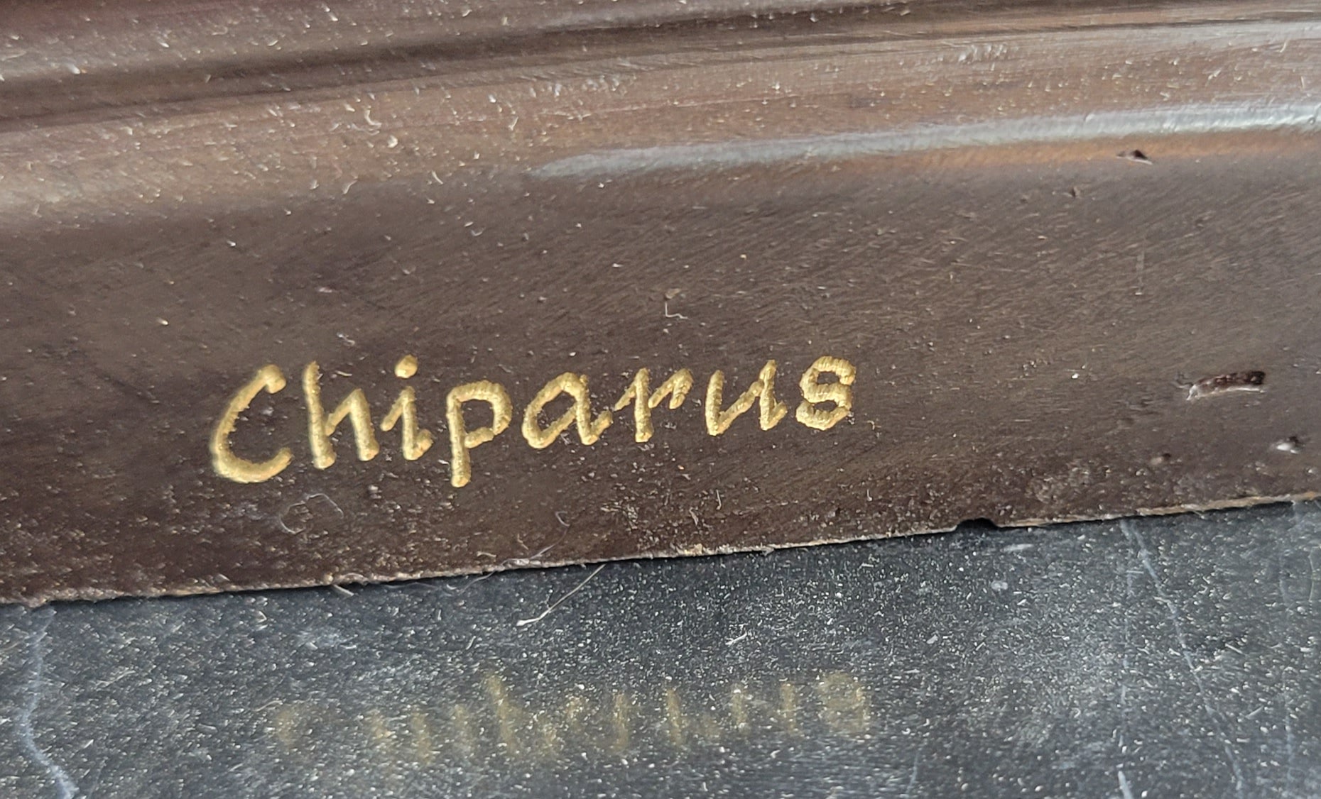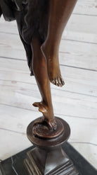 Mounted upon a sleek black marble base, the sculpture is further distinguished by the signature of the renowned artist Chiparus, adding an element of authenticity and prestige. The contrast between the dark marble and the bronze figure creates a striking visual impact, making this sculpture a perfect centerpiece for a sophisticated home or office. It is an exquisite gift for art enthusiasts, collectors, or anyone who appreciates the beauty of fine sculpture and the elegance of the female form.Bronze Dimensions with Marble Base: Height 20" X Width 11"