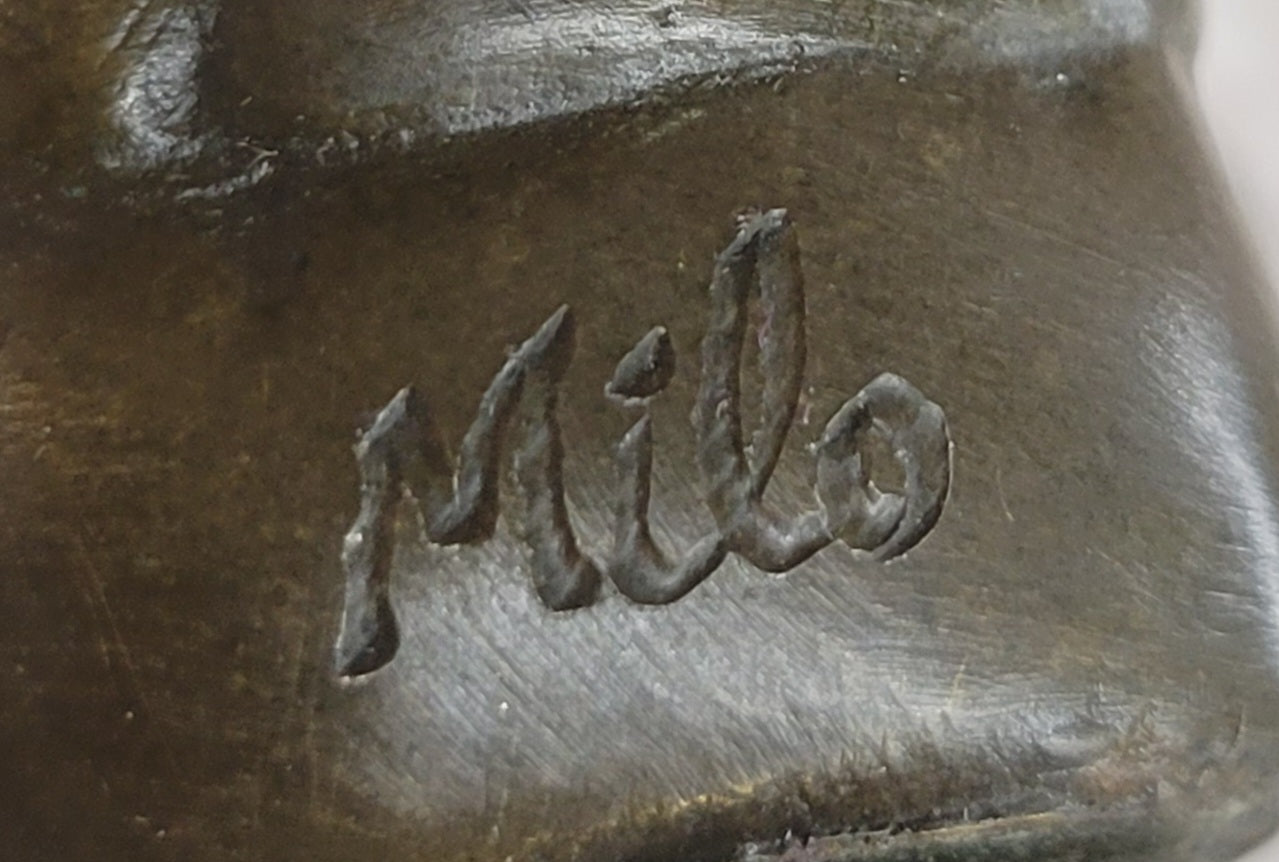 Signed by the artist Milo, this bronze figurine is not only a beautiful work of art but also a timeless treasure that will bring joy and delight to any space. Whether displayed in a child's room, a living area, or a collector's cabinet, this sculpture serves as a reminder of the simple joys of youth and the beauty found in everyday moments of play and contemplation.Bronze Dimensions: Height 3 1/2" X Width 2"