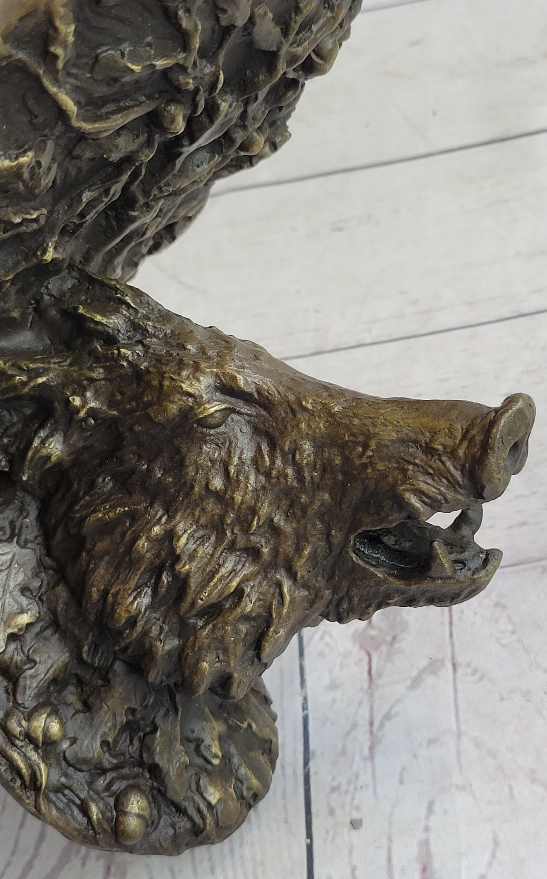 As a testament to the timeless techniques employed in its making, the boar's head is designed for wall mounting, adding a touch of rustic charm to any space. The choice of real bronze not only contributes to the piece's durability but also enhances the overall aesthetic with a rich and warm patina. The sculpture invites a connection to nature and the countryside, capturing the spirit of these majestic creatures in a form that pays homage to traditional craftsmanship. To affix this exceptional piece to the wall, it requires the use of one screw (not supplied), allowing for easy installation and creating a distinctive focal point in any setting.