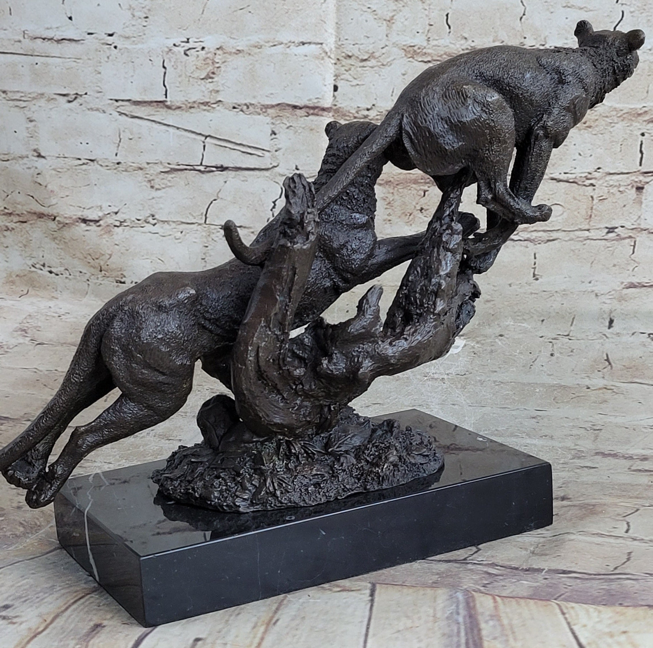 This bronze statue by Henry Moore is handmade and cast in the traditional Lost Wax Casting Process. This is a multi step process that insures a quality bronze sculpture that may be passed down from generation to generation. This is an large statue of a stalking puma. This collectible is The Cougar, Puma, Mountain Lion, Panther, or Catamount (Felis concolor) is a fiercecat that lives deep in deciduous forests, rain forests, grasslands, and deserts of North America and South America. These solitary cats can purr but cannot roar. Very athletic, these cats are excellent jumpers, climbers and swimmers. Cougars have a life span of about 8 years. There are many subspecies of cougar.Cougars are an endangered species due to loss of habitat and over-hunting by man. Anatomy: The cougar has keen eyesight and good hearing. It has a small head, big ears, powerful jaws, long, pointed canine teeth, and sharp, retractable claws oneach foot. The brown eyes have circular pupils. These powerful cats are up to 6 feet (1.8 m) long, plus a long tail that is 2-3 ft (60-90 cm) long. It weighs up to 200 pounds (90 kg). The young have a spotted coat, but become solid tan to gray-brown at six months of age. Diet: The cougar is a carnivore (a meat-eater). It is a fast, solitary hunter that hunts both during the day and at night. It eats deer, wild hogs, sheep, moose, elk, rabbits, hares, rodents (like beavers), raccoons, some birds, and livestock. Cougars stalk their prey and then ambush it by leaping from the ground or from a tree. They kill large animals by pouncing on the back and breaking the neck. They bury large prey with leaves and twigs to hide the carcass from other animals until they are able to finish eating itBronze Dimensions with Marble Base: Height 10" x Width 14"
