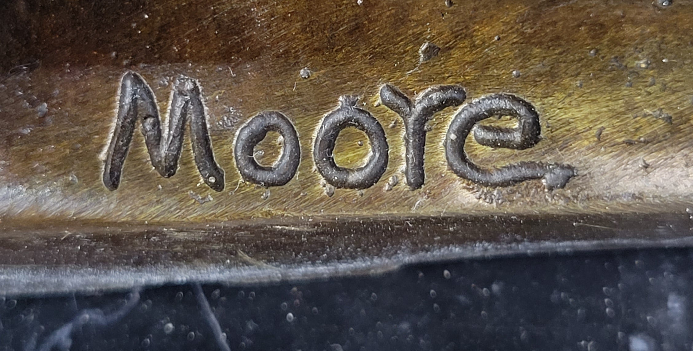 Against the backdrop of a post-war era riddled with uncertainty, this imagery of steadfast and benevolent authority struck a profound chord, resonating widely with audiences. Crafted entirely from bronze and adorned with a captivating brown patina finish, the sculpture exudes timeless elegance. It rests upon a sturdy black marble base, enhancing its visual impact and adding a touch of sophistication to any environment.Bronze Dimensions with Marble Base: Height 11" X Width 8"
