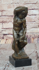 This striking bronze sculpture, "The Slave" or "The Prisoners," is a masterful reproduction of Michelangelo's renowned work, capturing the raw emotion and struggle of the human form in bondage. The sculpture embodies the Renaissance master’s unparalleled ability to convey tension, strength, and the yearning for freedom through intricate detailing and dynamic composition. The figure’s contorted posture and expressive musculature reflect an intense inner turmoil, making it a powerful symbol of endurance and resilience.
