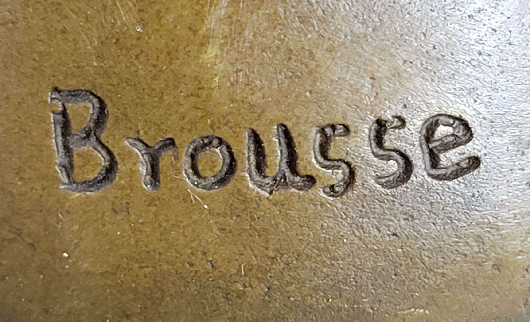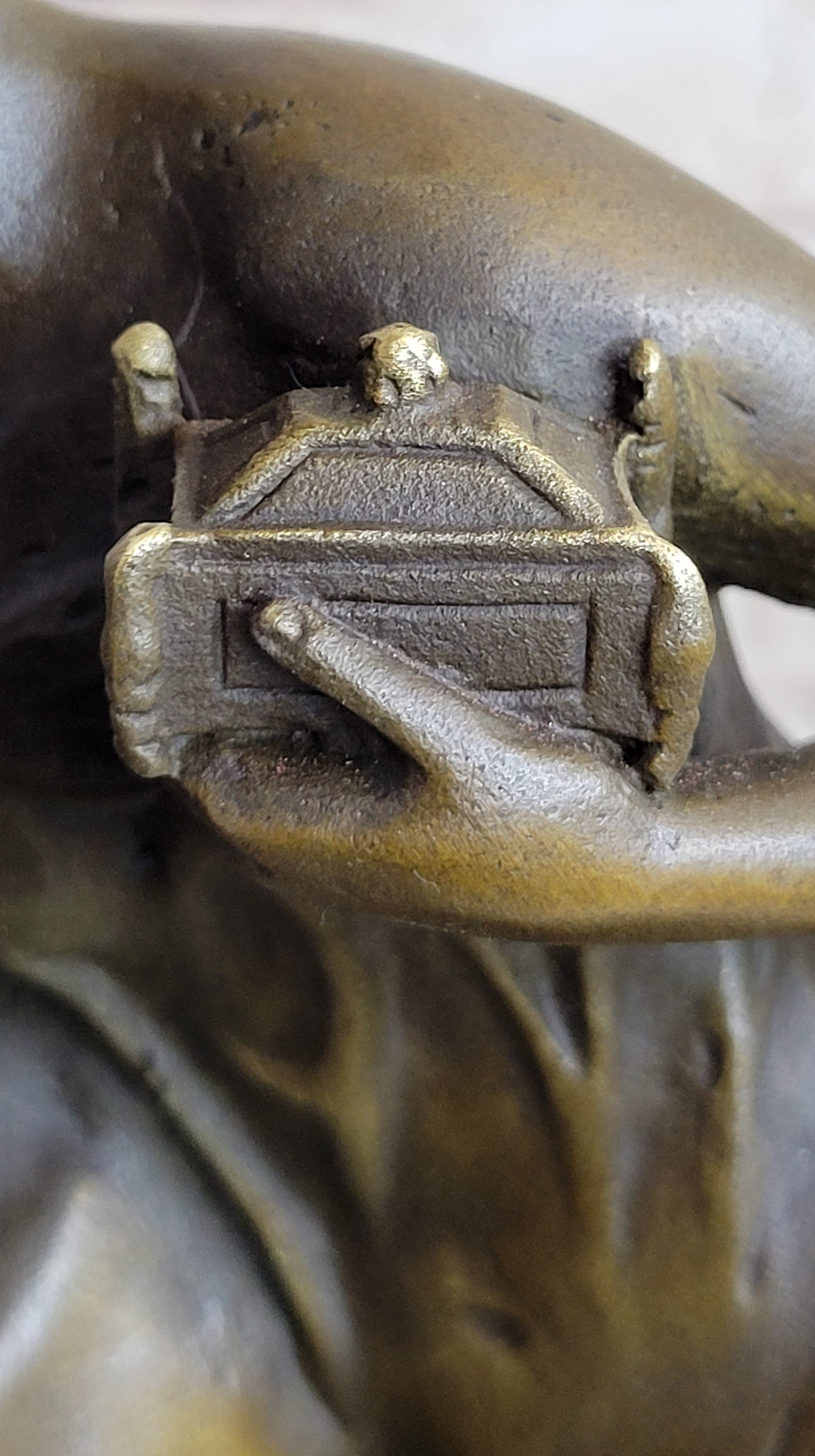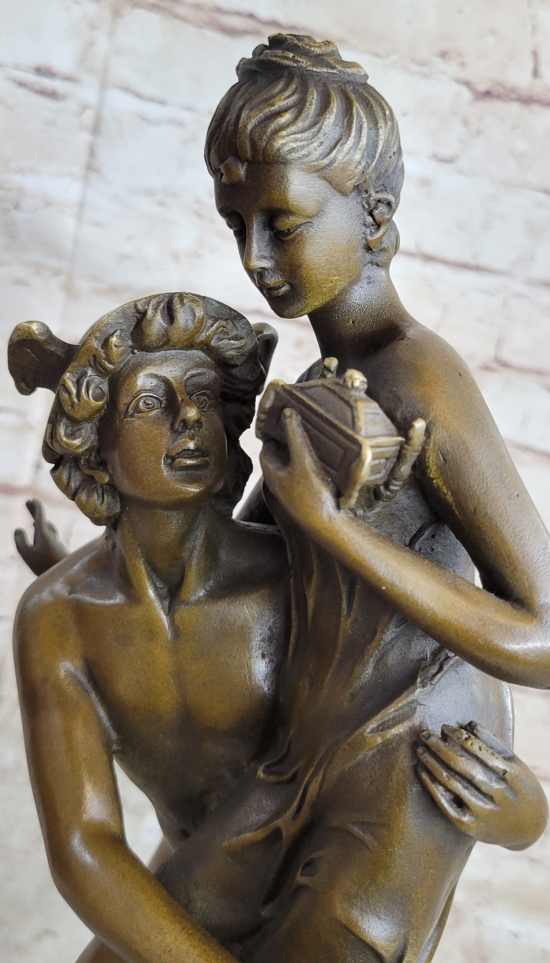 Meticulously crafted using the traditional lost-wax casting method, this rendition of the mythological duo serves as a timeless representation of the ancient tales and allegories of the gods. Enhanced with a rich brown patina stain, the sculpture resonates with the essence of antiquity and myth, symbolizing the complexities of human nature and the enduring power of hope. Resting upon a sleek black marble base, this exquisite artwork bears the signature of the esteemed artist Brousse, adding a touch of quality and artistry to this captivating portrayal of classical mythology.Bronze Dimensions with Marble Base: Height 17"X Width 7"