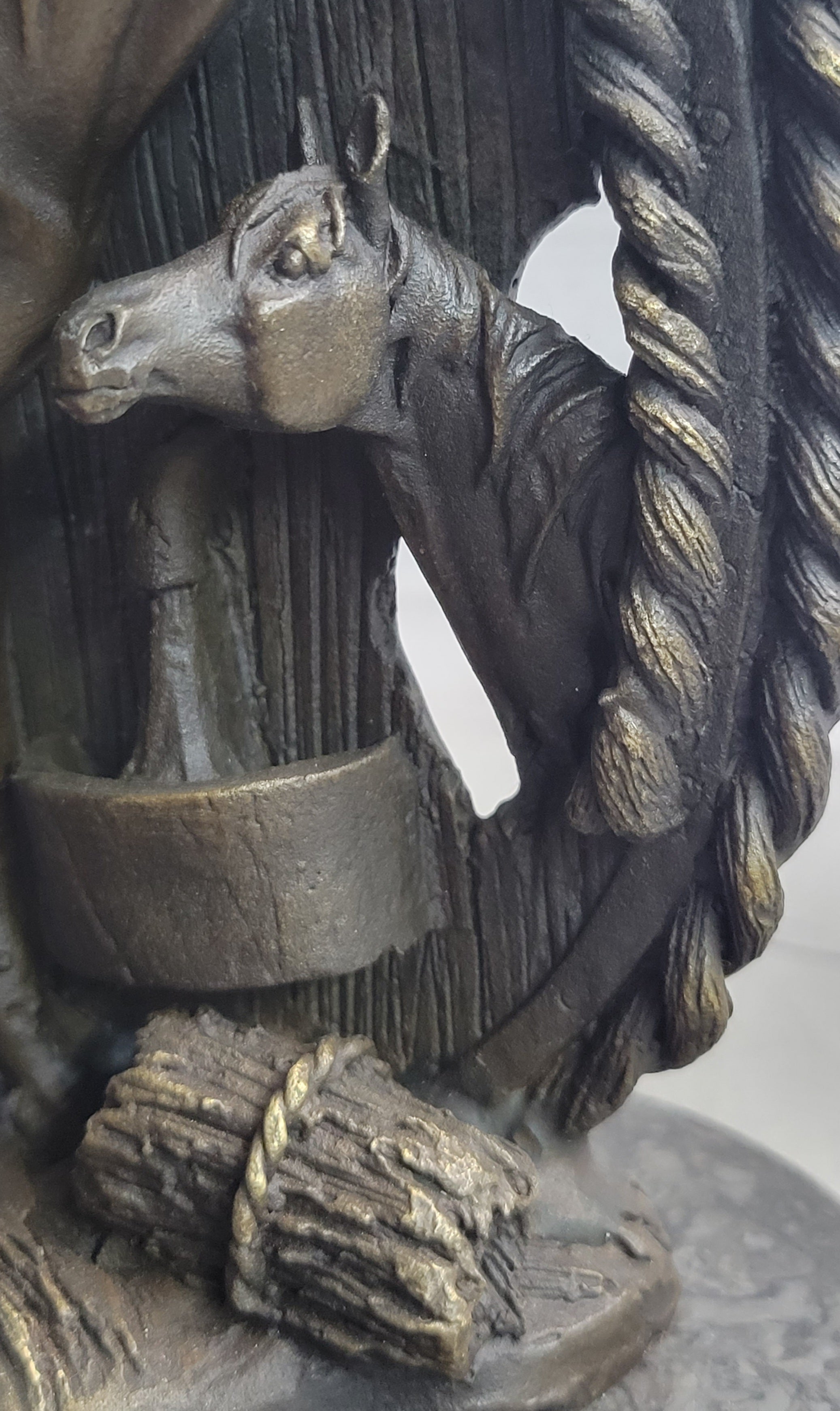 As the mare revels in her leisurely walk, her attention is shared with a charming baby foal by her side. The foal, eagerly nibbling on luscious green grass, mirrors its mother's carefree demeanor. Every move of the mare is shadowed by the foal, absorbed in the joyous simplicity of the moment. The sculpture skillfully captures this endearing bond between mother and foal, portraying a heartwarming snapshot of nature's beauty.