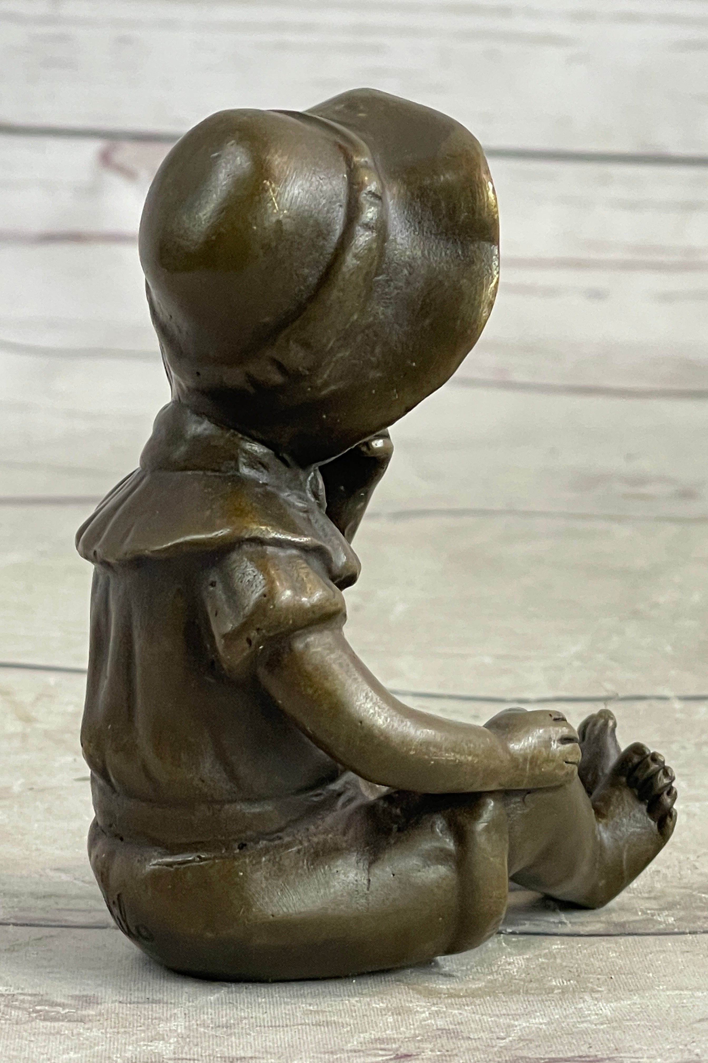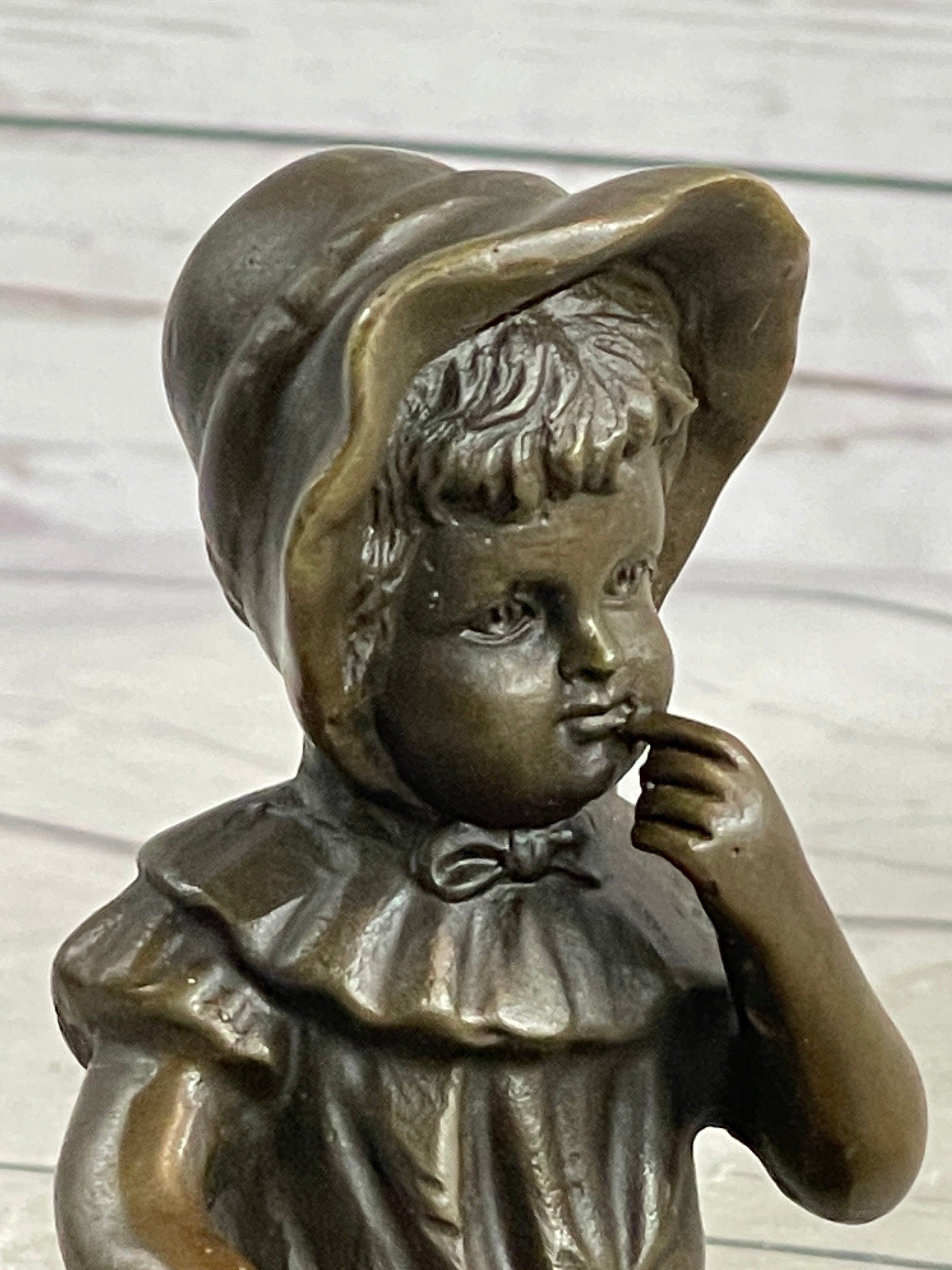 Capture the innocence and charm of childhood with this exquisite bronze sculpture of a baby girl wearing a bonnet hat. Crafted with meticulous precision and attention to detail, this signed figure is a testament to the artist's skill and creativity. Made exclusively from bronze, the sculpture radiates timeless style and makes a profound aesthetic impression. Its versatile design allows it to seamlessly complement various interior styles, adding a touch of elegance and grace to any space.