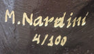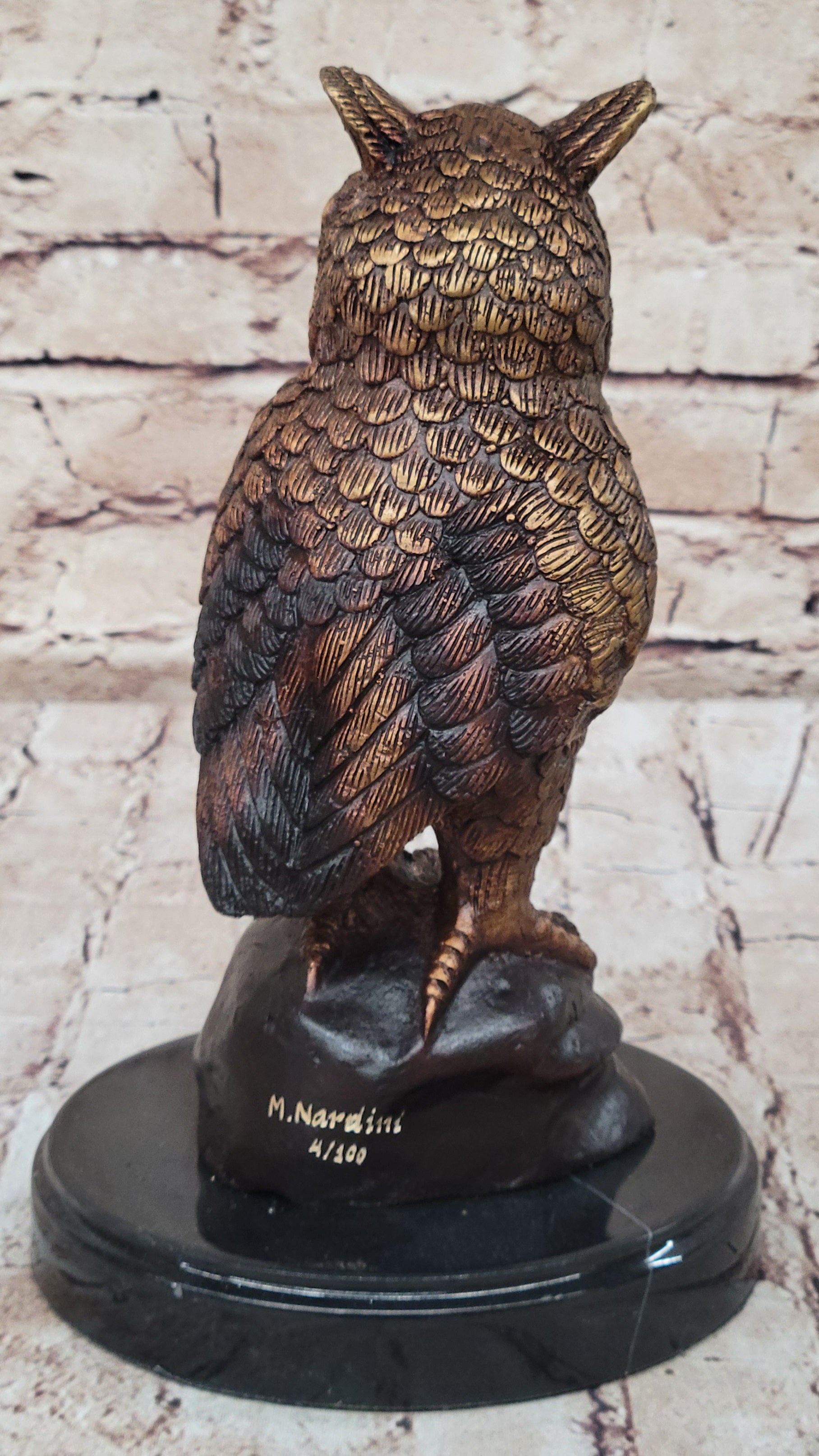 Meticulously handcrafted through the revered "Lost Wax Method," this remarkable sculpture embodies the essence of the owl's graceful form and intricate plumage. Every detail, from the meticulously rendered feathers to the meticulous etchings that define his countenance, resonates with a lifelike quality that captures the owl's mystical allure. Composed of 100% bronze and adorned with a nuanced two-toned brown patina, the sculpture exudes a timeless charm and an enduring elegance, offering a striking contrast against the solid black marble base on which it confidently perches. The sculpture bears the distinguished signature of the renowned artist M. Nardini, solidifying its status as a testament to the artist's exceptional craftsmanship and artistry.