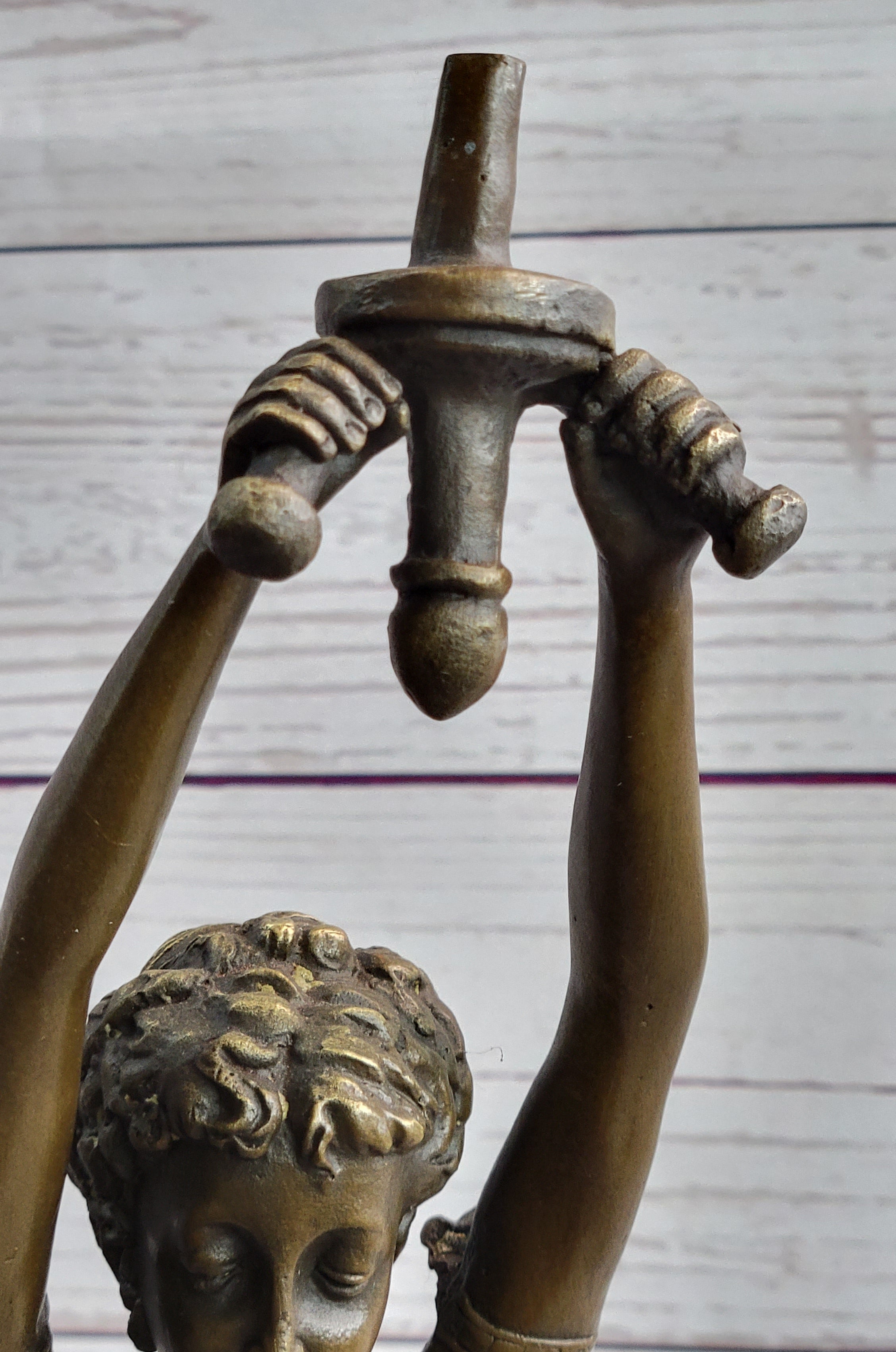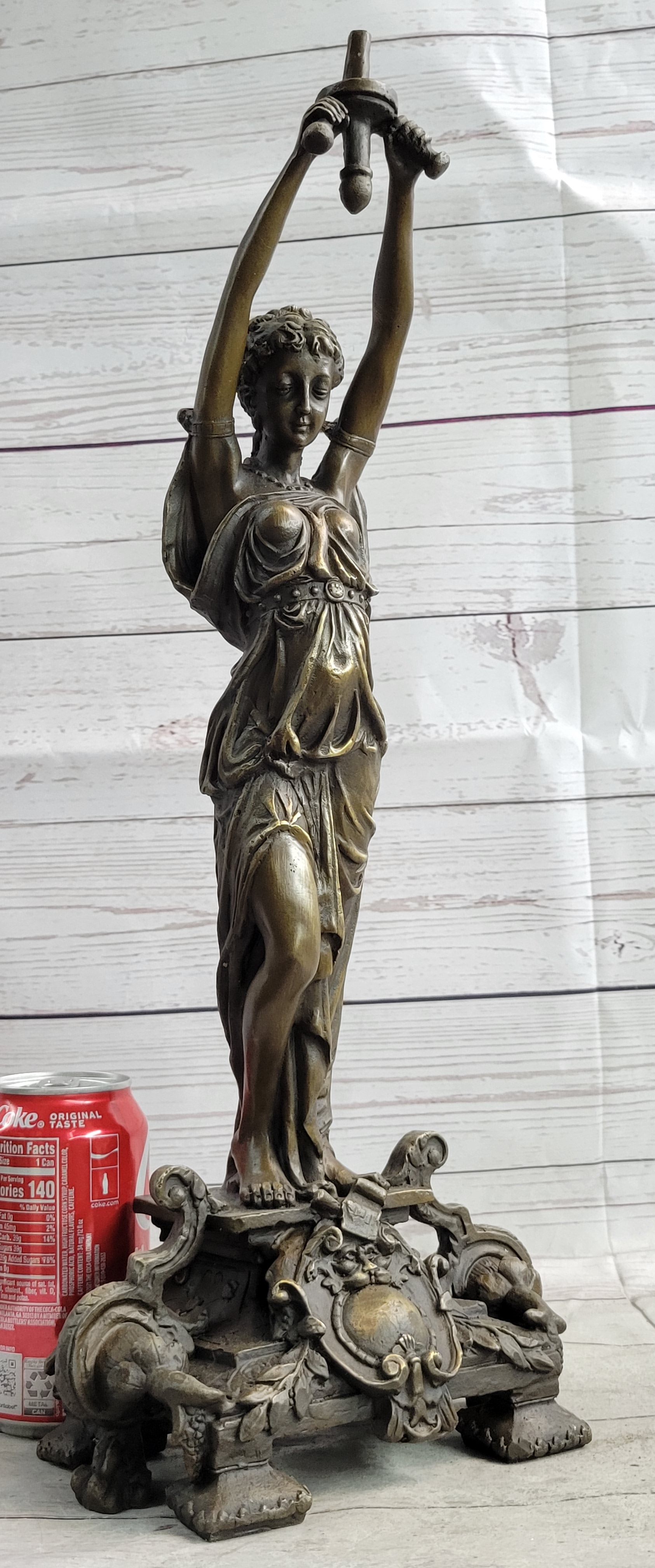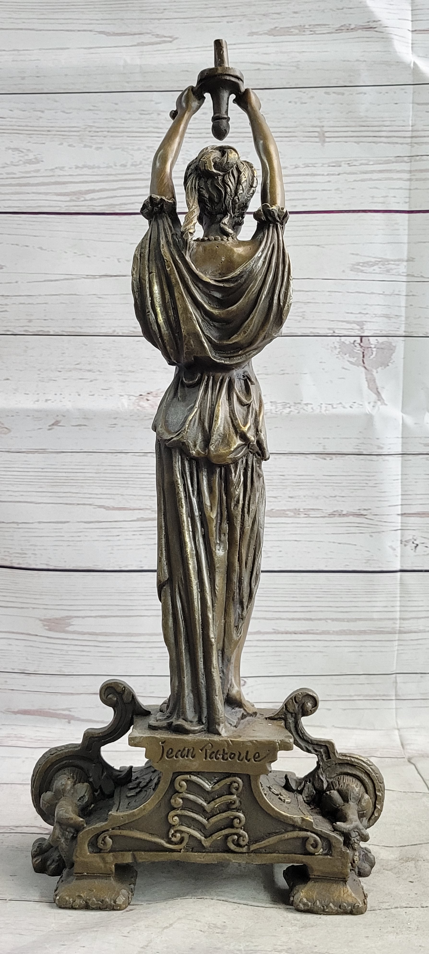 This magnificent bronze sculpture portrays an Ancient Greek temple priestess in all her regal splendor. Standing tall and graceful, she holds a sacred vessel in her hands, symbolizing her role as a guardian of the temple rituals. The intricate details of her flowing robes and delicate features showcase the exceptional craftsmanship of this hot cast bronze artwork. Created using the renowned lost wax method, the sculpture captures the essence of the temple priestess with a captivating brown patina finish. Signed by the esteemed artist Jean Patoue, this piece is a true testament to his mastery. The sculpture is a tribute to the rich history and culture of Ancient Greece. It exudes an aura of mystique and reverence, inviting viewers to immerse themselves in the world of the temple priestess. The fine attention to detail, from the folds of her garments to the expression on her face, brings this captivating figure to life. Whether displayed in a home, office, or gallery, this bronze statue is sure to captivate and inspire admiration. This hot cast bronze sculpture of the Ancient Greek temple priestess is a valuable addition to any art collection. Its timeless beauty and historical significance make it a sought-after piece among collectors and art enthusiasts alike. With its exquisite craftsmanship, the statue embodies the grace and elegance of the temple priestess, transporting viewers to a bygone era. Own a piece of history with this exceptional artwork, signed by the renowned artist Jean Patoue, and let the spirit of the Ancient Greek temple priestess grace your space.
