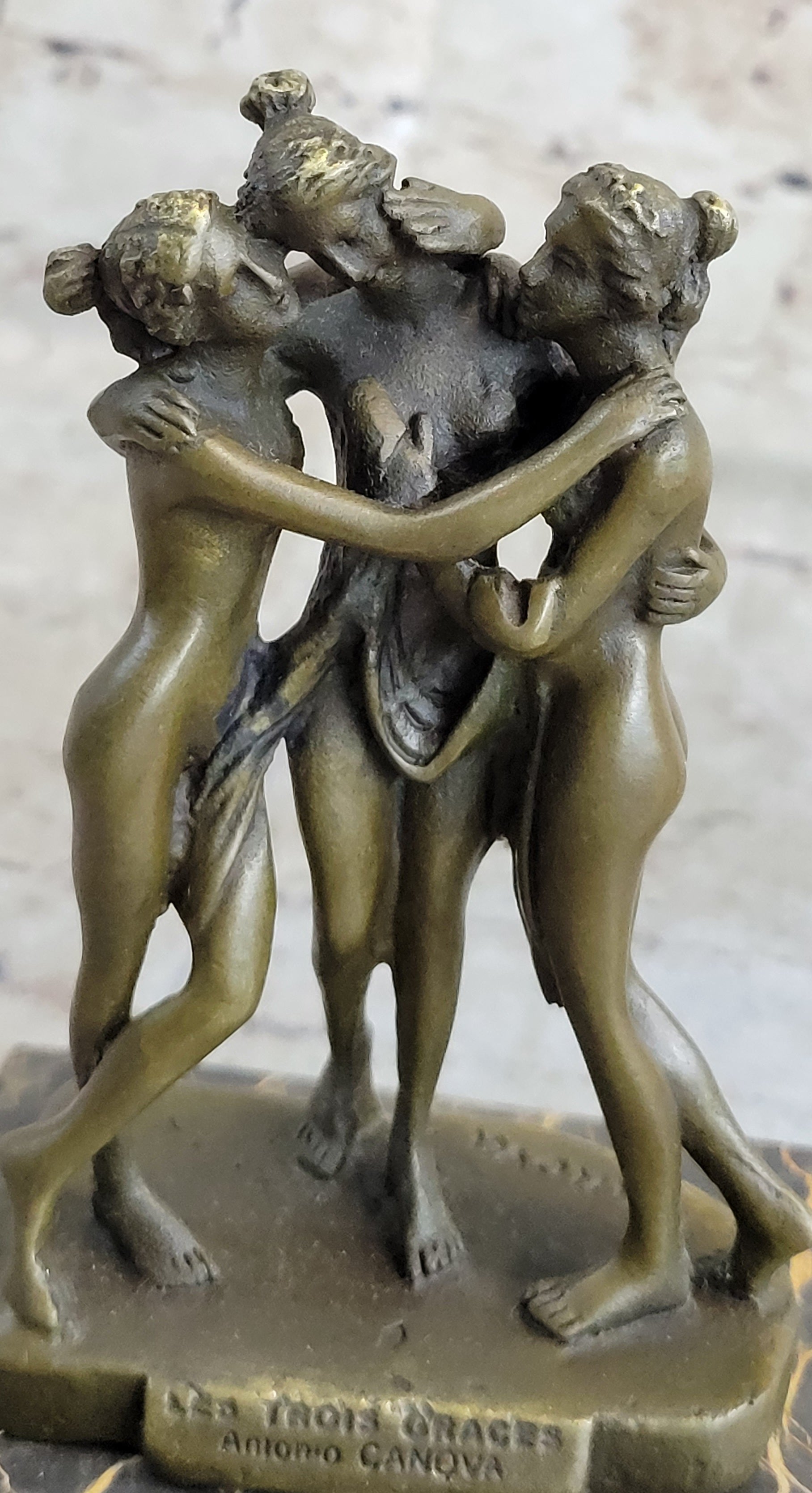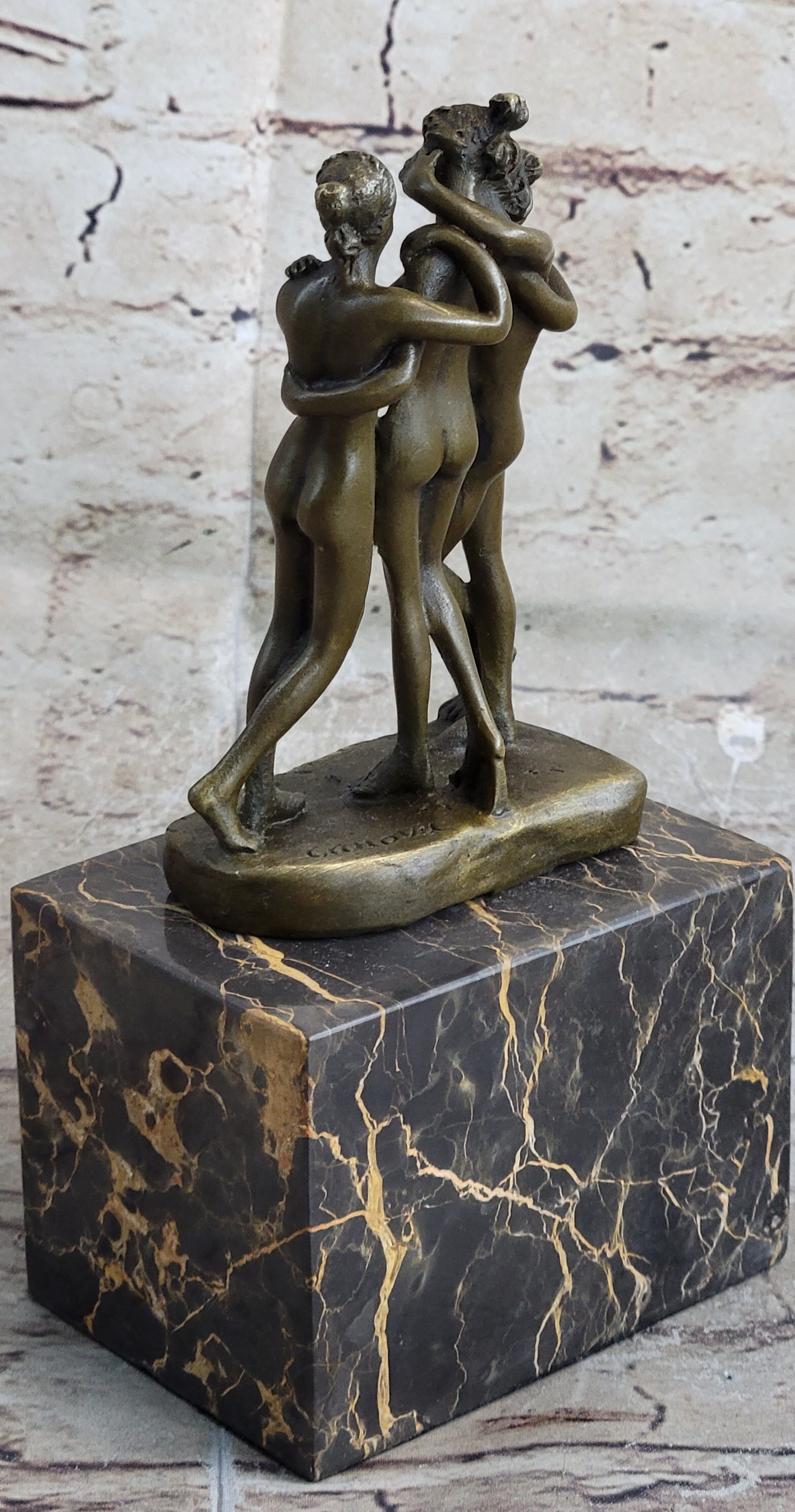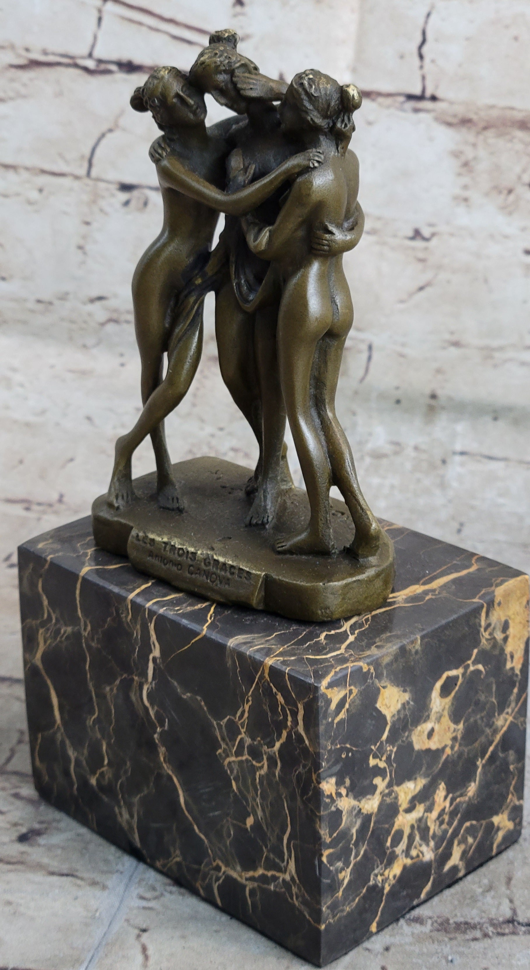As viewers admire the intricate detailing and graceful poses of the Three Graces, they are transported to a bygone era of artistic excellence and cultural revival. This sculpture not only celebrates the artistic legacy of Antonio Canova but also pays homage to the enduring power of classical mythology to inspire and enchant audiences throughout the ages.Bronze Dimensions with Marble Base: Height 8" X Width 4"