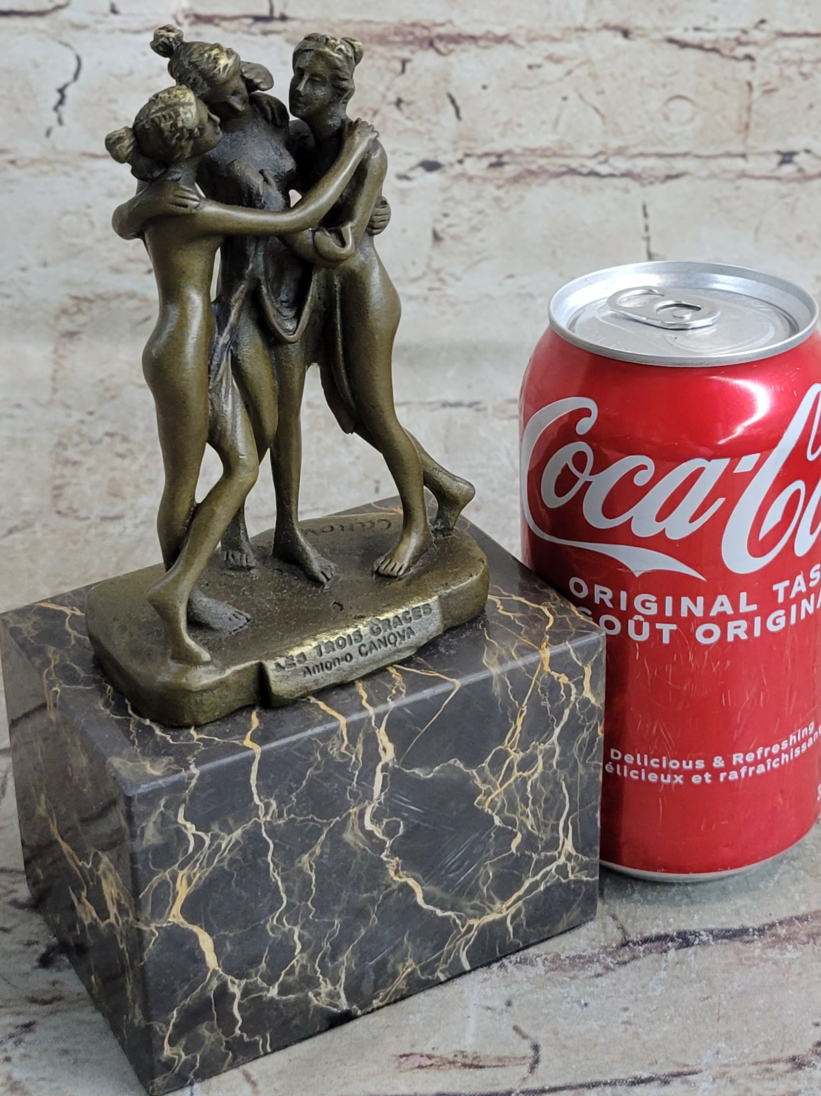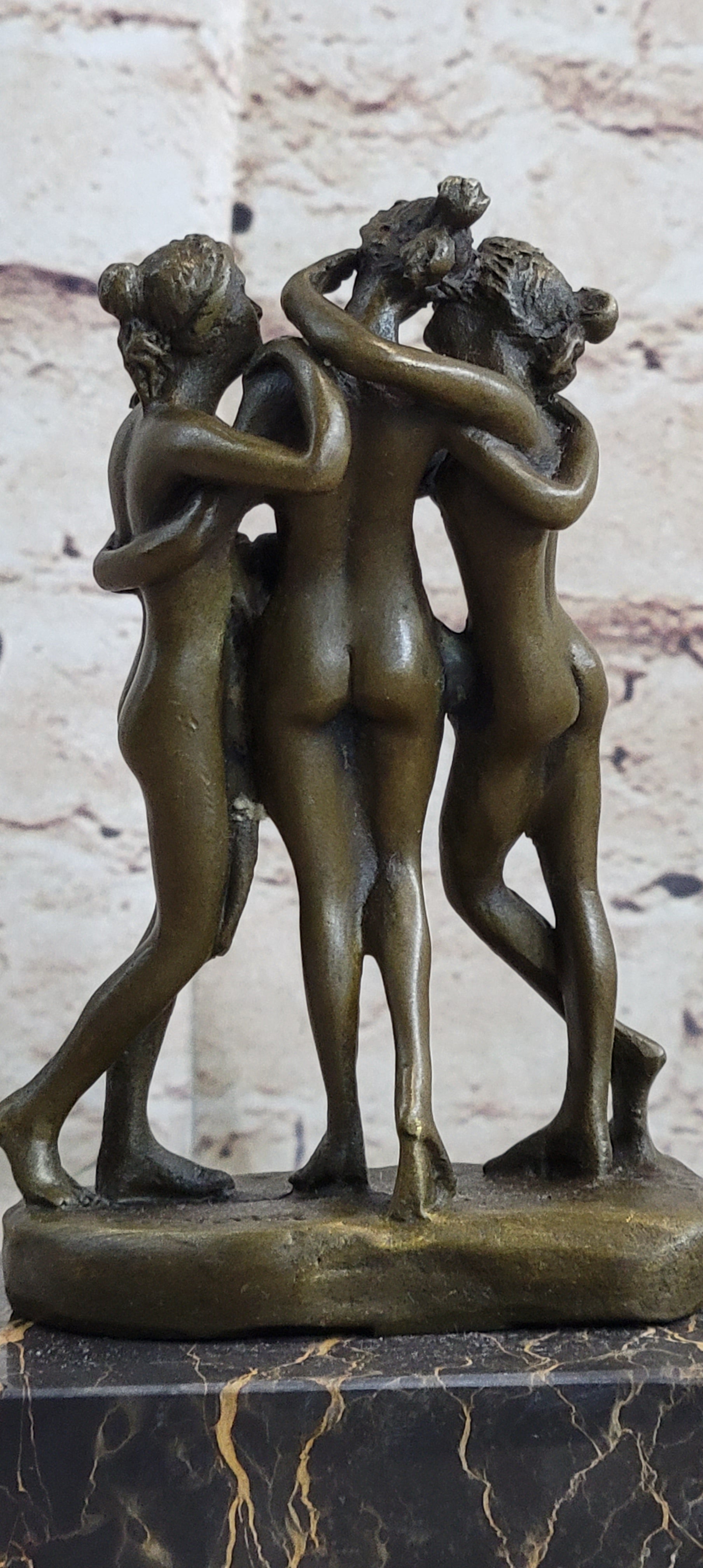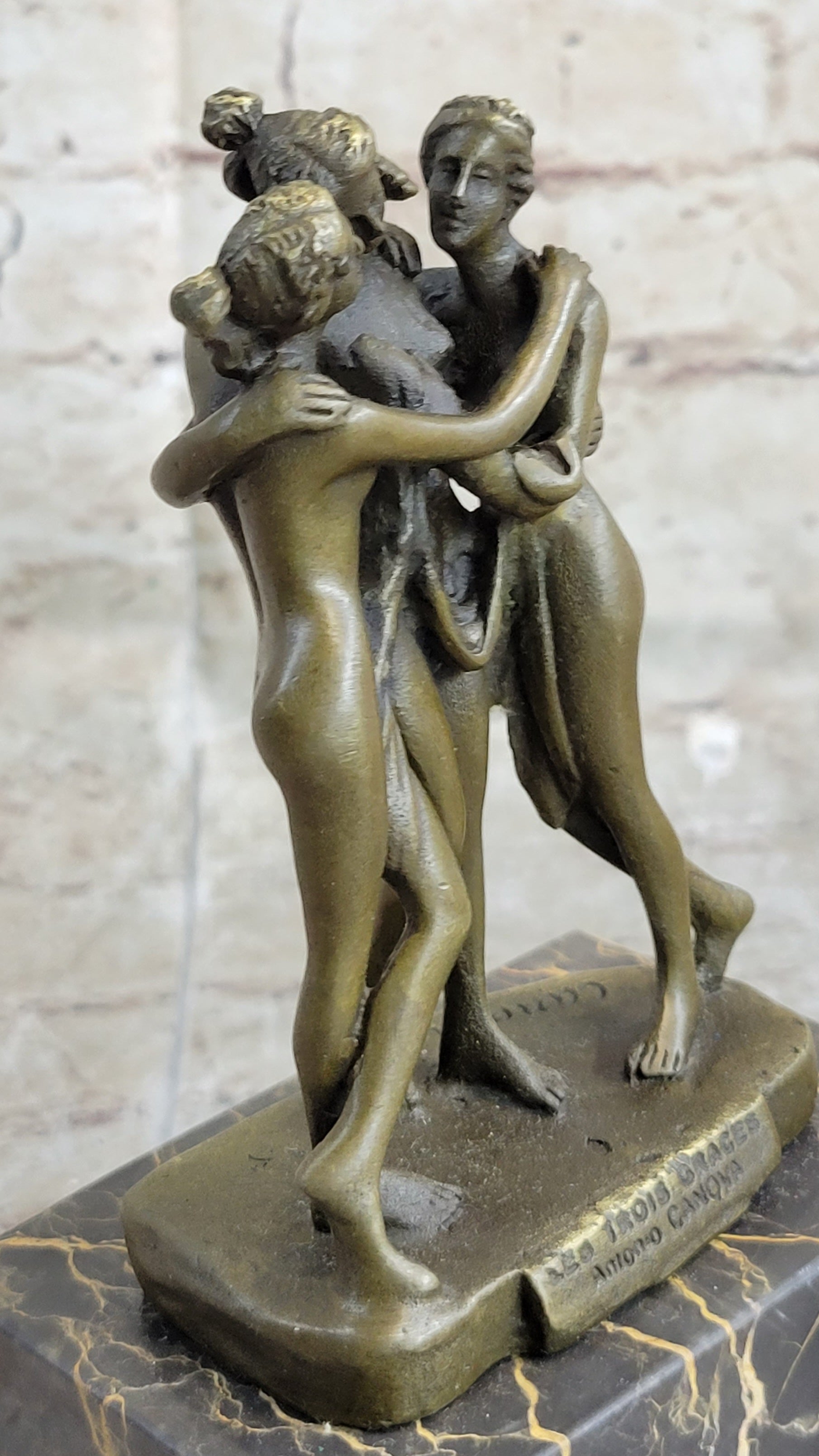 As viewers admire the intricate detailing and graceful poses of the Three Graces, they are transported to a bygone era of artistic excellence and cultural revival. This sculpture not only celebrates the artistic legacy of Antonio Canova but also pays homage to the enduring power of classical mythology to inspire and enchant audiences throughout the ages.Bronze Dimensions with Marble Base: Height 8" X Width 4"