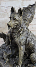 Immerse yourself in the intensity of the hunt with this captivating bronze sculpture featuring two formidable hunting dogs, a Pitbull and a German Shepherd. Positioned next to a lifeless rabbit and bird, these loyal companions gaze ahead with unwavering focus, ready to execute their owner's command. The scene is set amidst a forest, skillfully portrayed through the inclusion of a tree stump and branches, lending a sense of atmosphere to this remarkable piece.