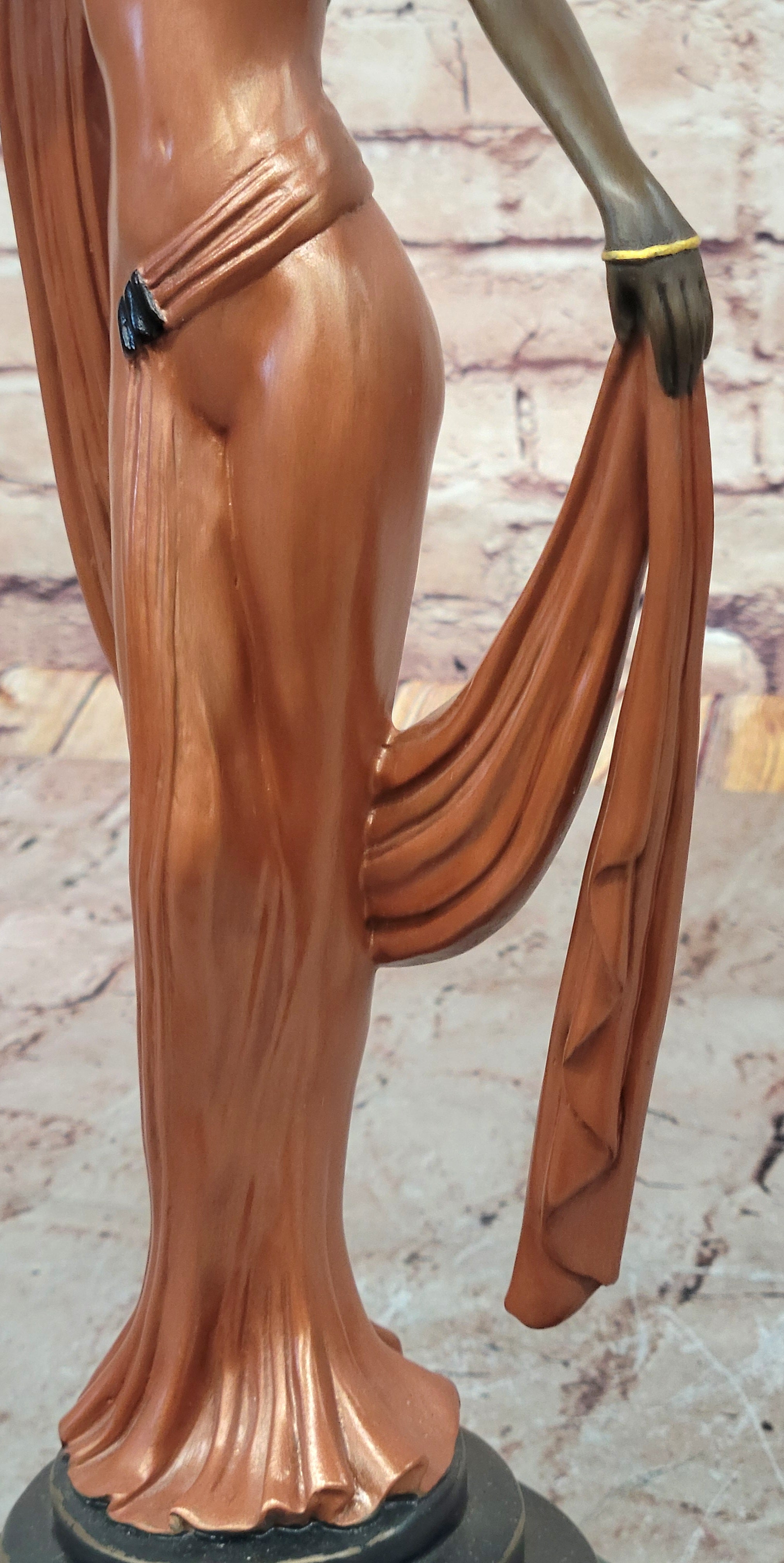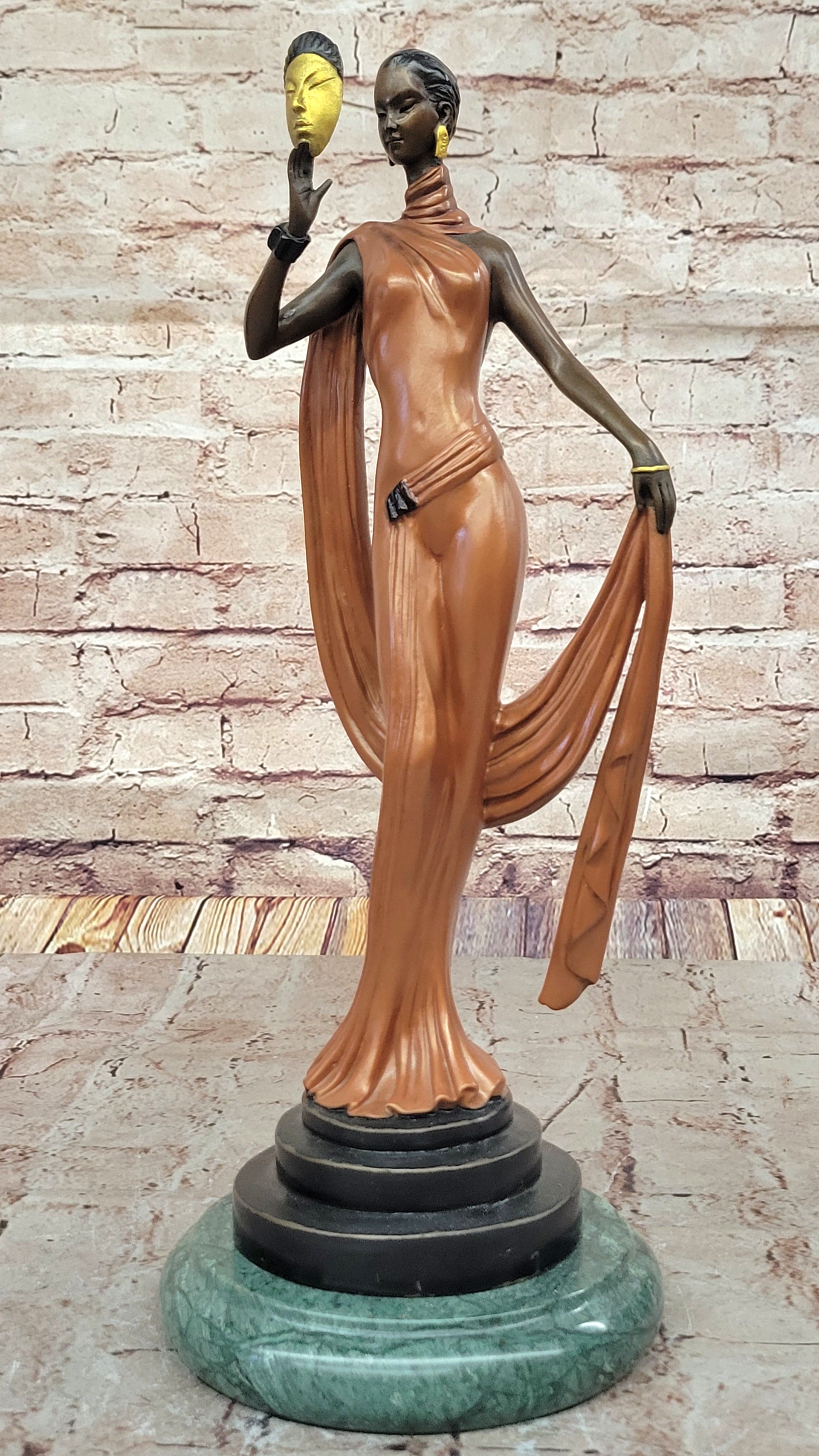 J. Erte Art Deco Bronze Lady with Mask – Elegant Figurine in Flowing Dress on Marble Base