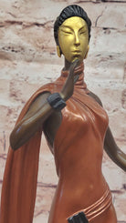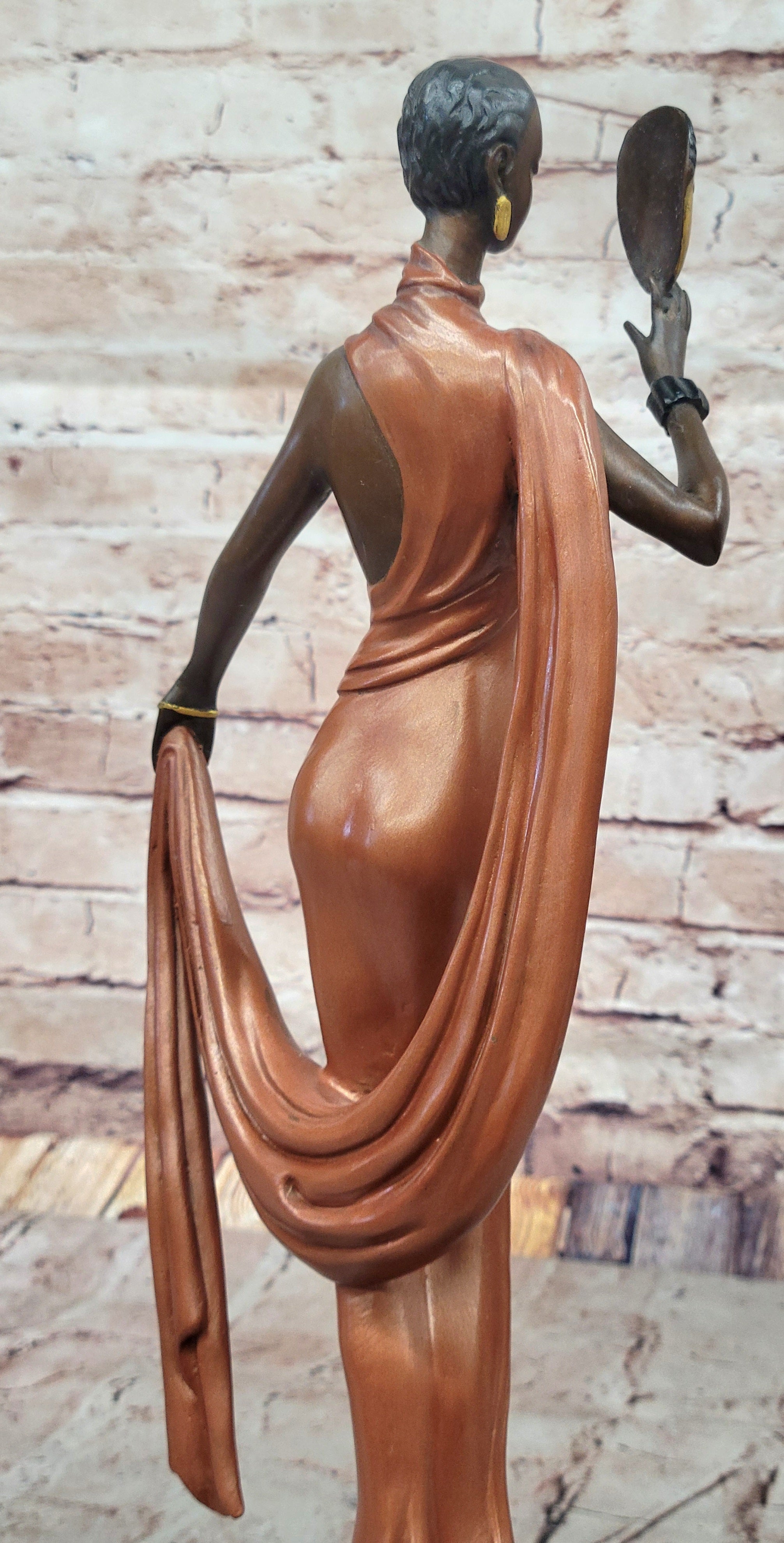 With her poised stance and captivating presence frozen in bronze, this fashionista immortalizes the timeless beauty and allure of haute couture, making her a captivating centerpiece for any art collection or space dedicated to the celebration of elegance and style.Bronze Dimensions with Marble Base: Height 16.5" X Width 6"