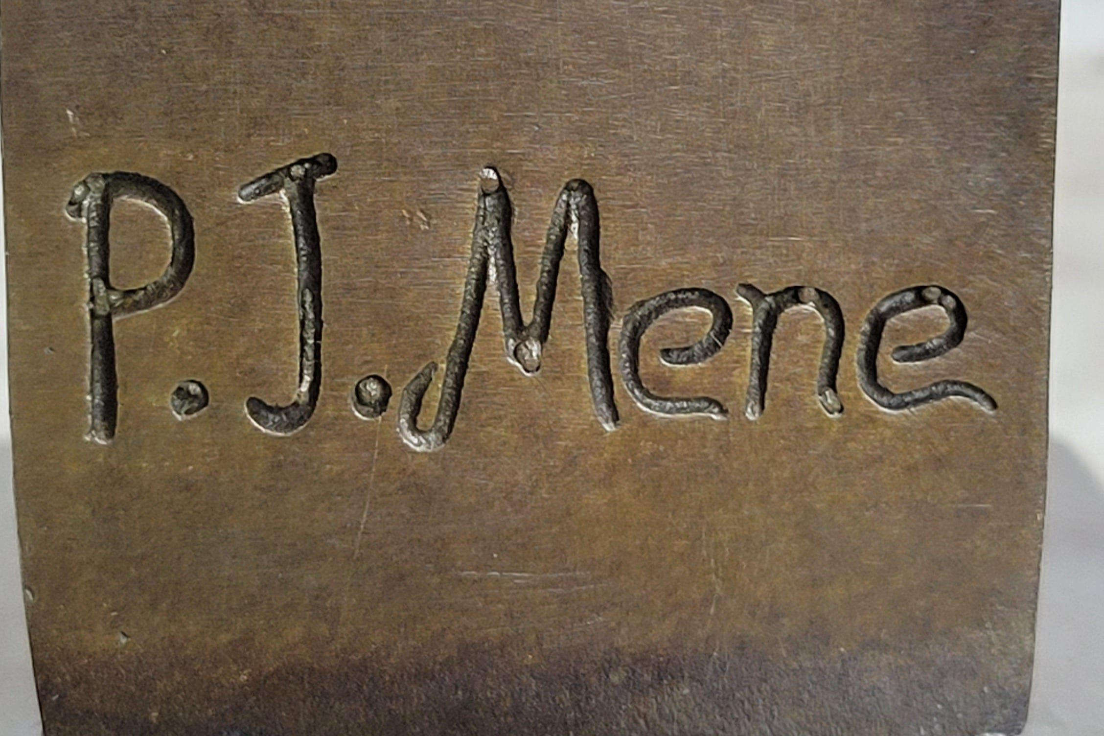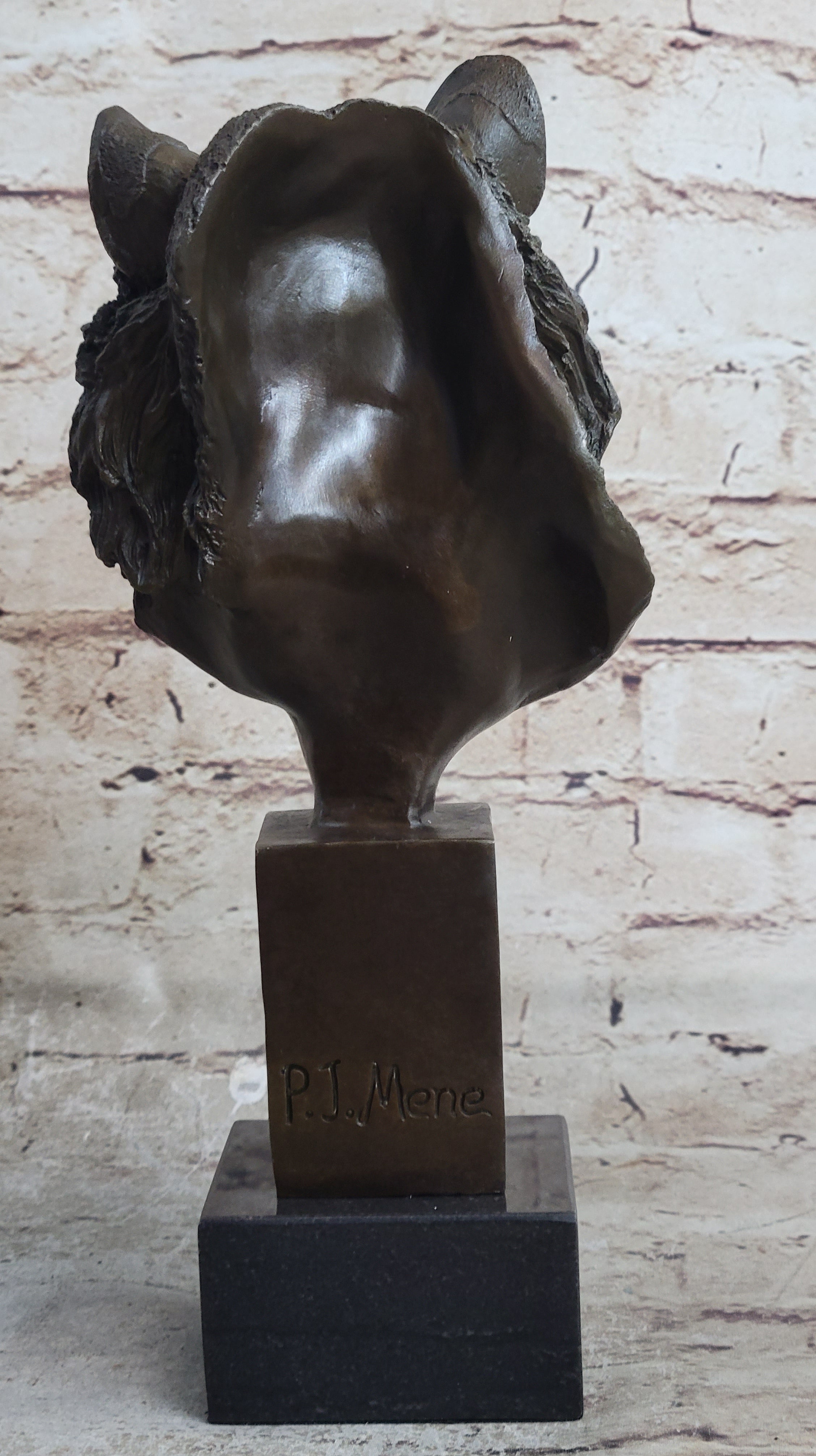 Using the time-honored "Lost Wax Method," this sculpture was meticulously cast to ensure the highest level of detail and authenticity. The rich brown patina finish adds a touch of warmth and depth to the sculpture, enhancing its lifelike qualities and accentuating the intricate details of the lion's form. Mounted on a durable marble base, this captivating piece stands as a tribute to the enduring legacy of the renowned artist P. J. Mene, reflecting his dedication to capturing the essence of wildlife through the timeless medium of bronze sculpture. Add a touch of wild beauty to your space with this stunning representation of the noble Male Lion.Bronze Dimensions with Marble Base: Height 10" X Width 5"