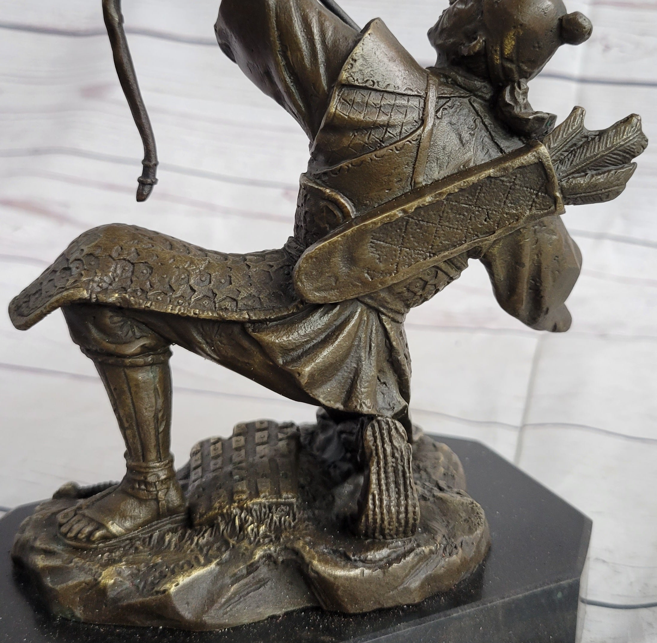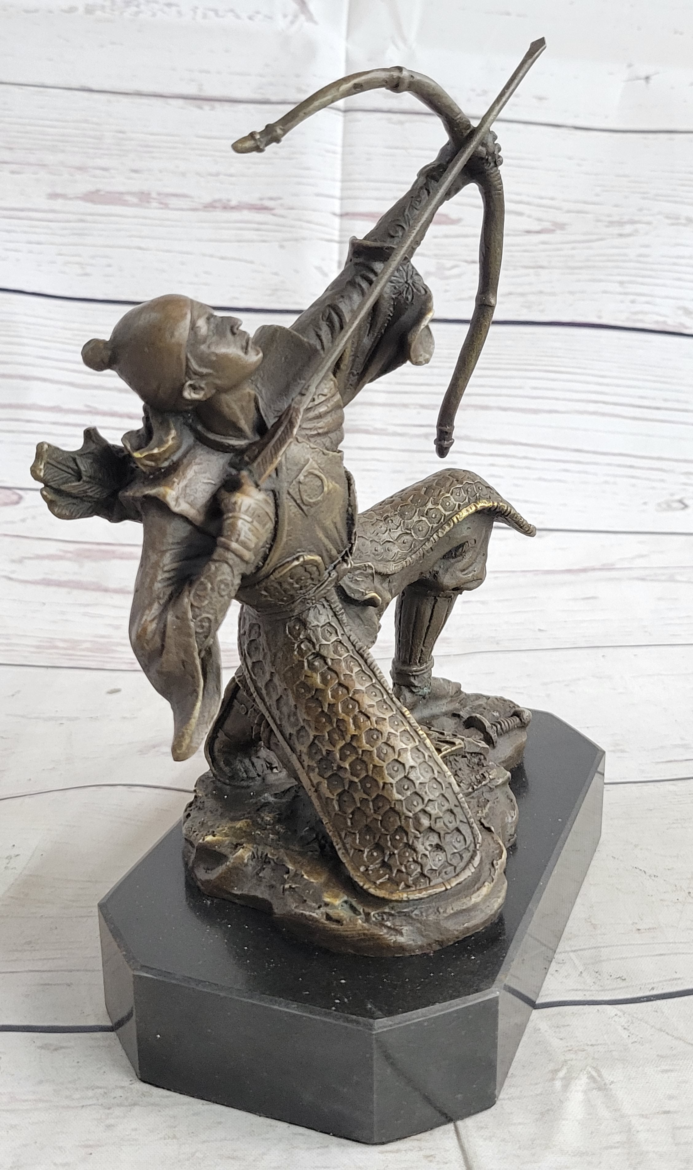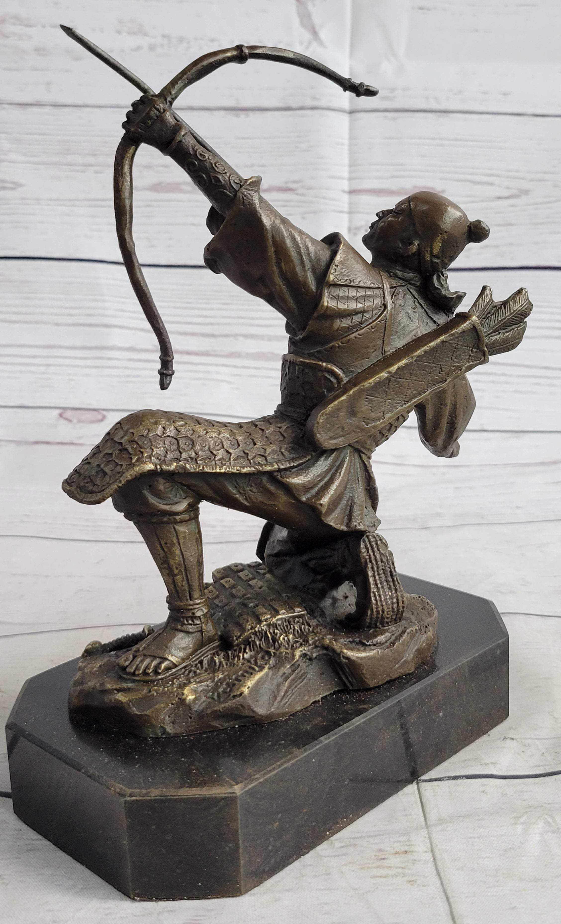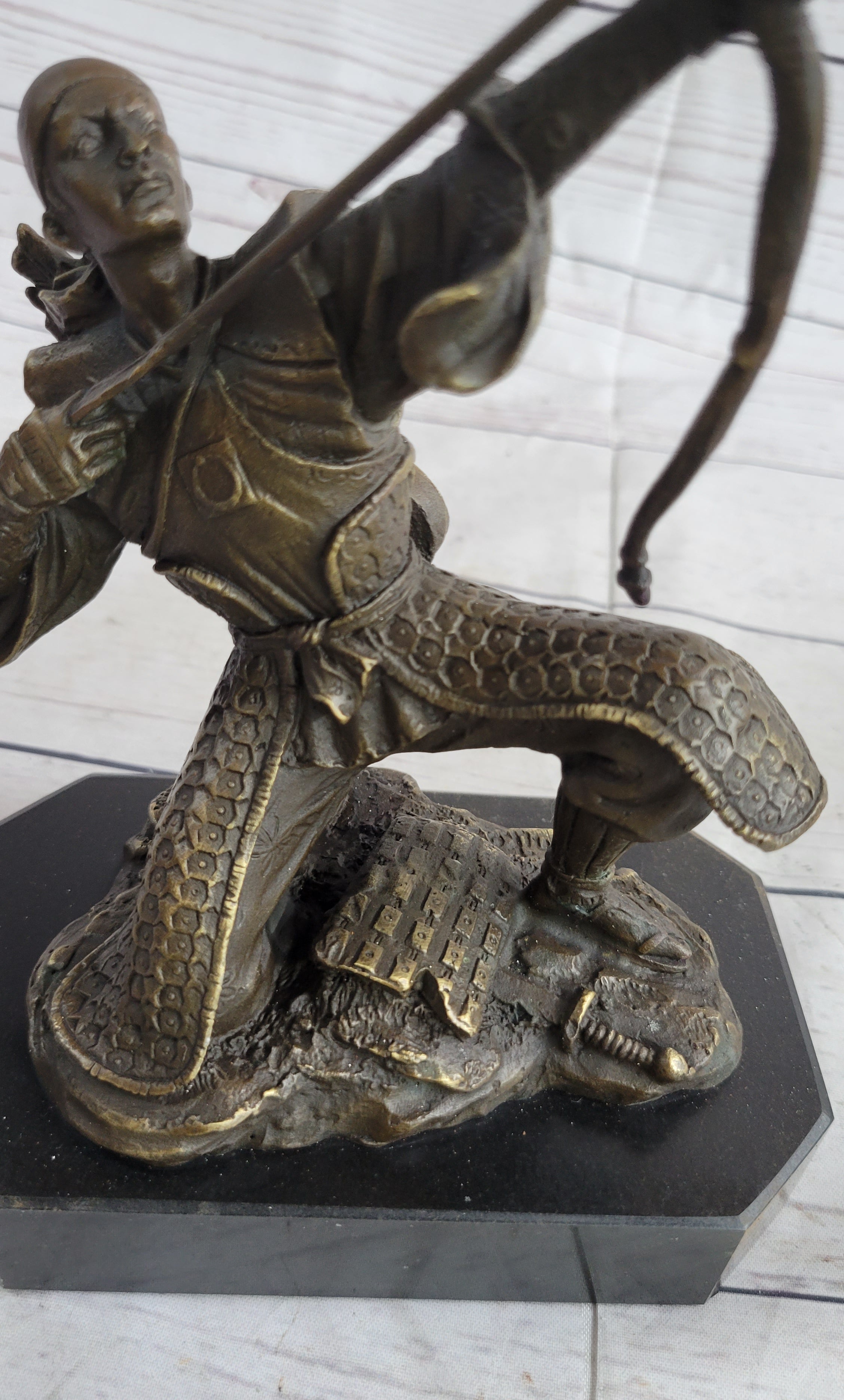 This striking bronze sculpture captures the intensity and determination of an ancient Samurai warrior as he takes a pivotal stance on the front lines of battle. With his knee planted firmly on the ground, he raises his bow with precision, squinting one eye as he takes aim at his target.