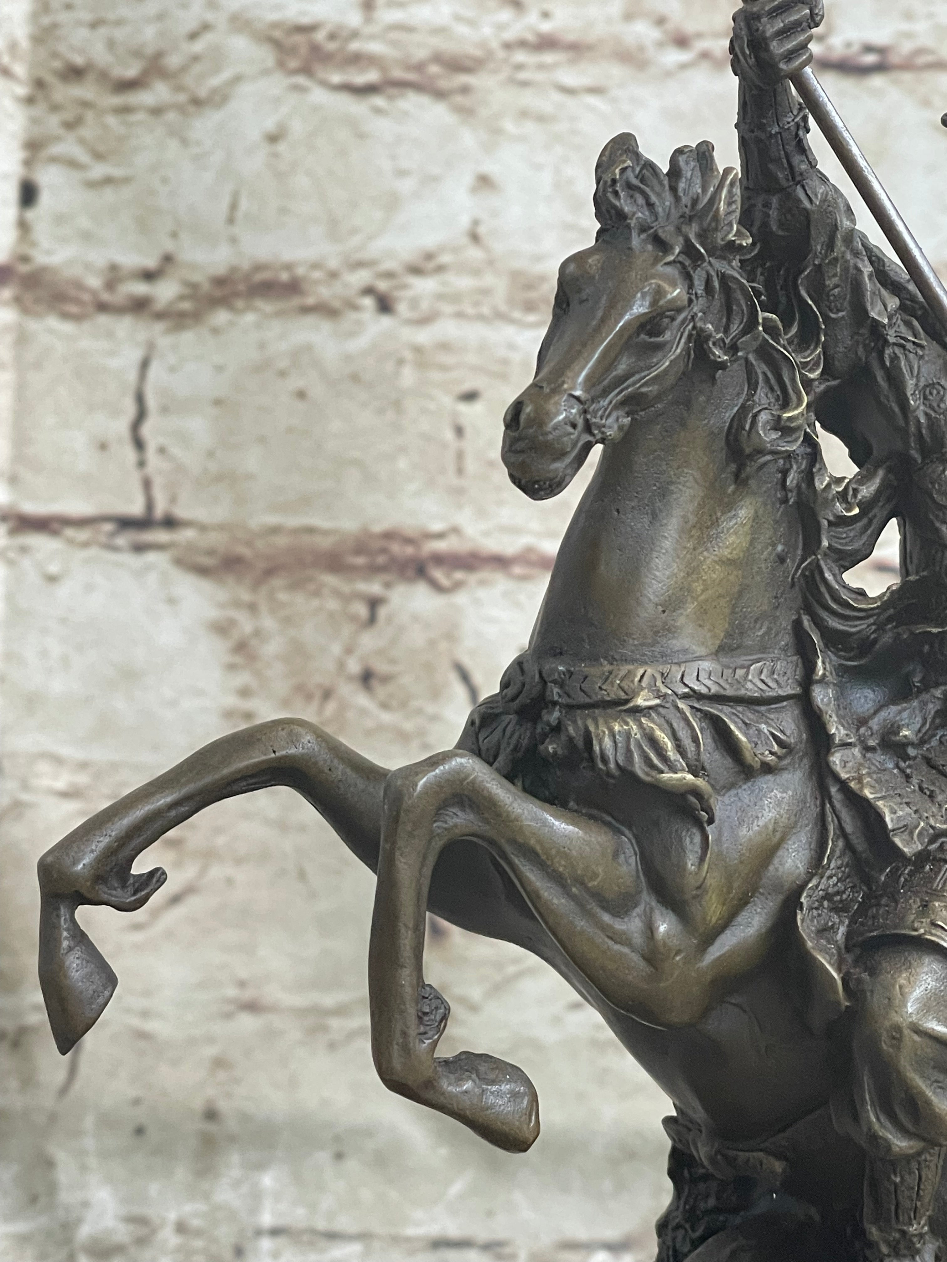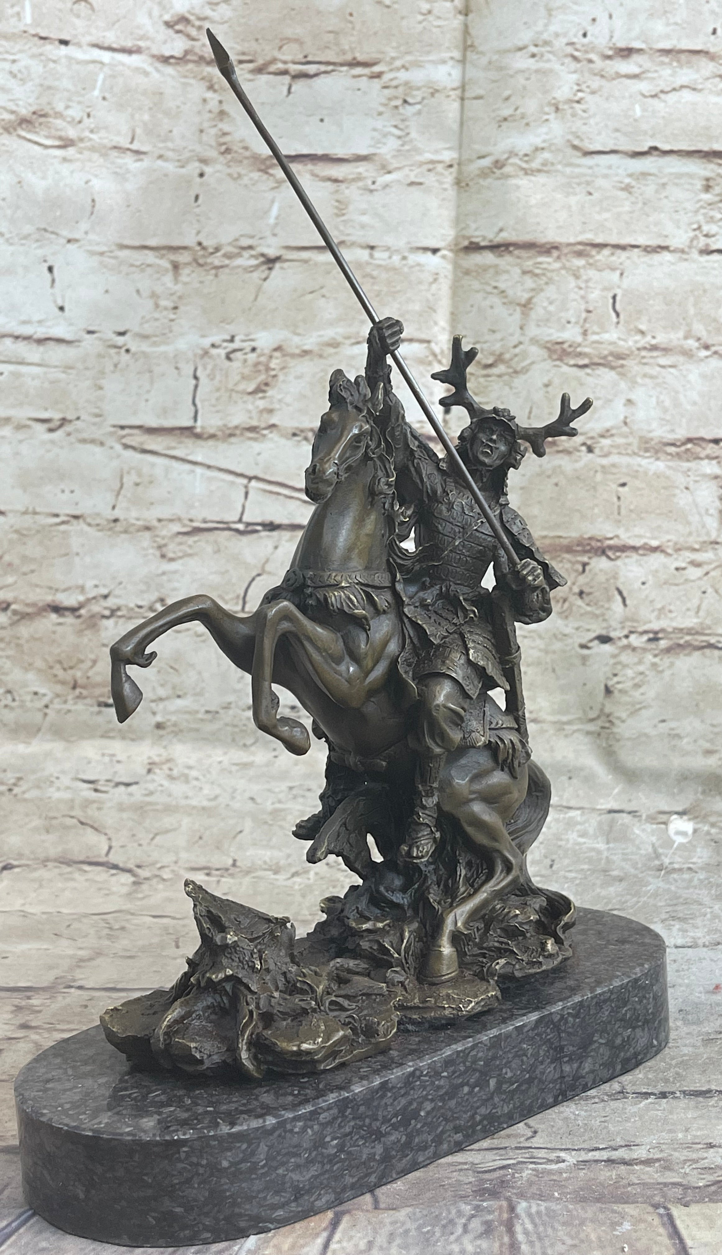 Transport yourself to the era of ancient Japan with this remarkable bronze statue depicting a fierce Samurai warrior in the midst of battle. Mounted on his loyal steed, the warrior charges forward with unwavering determination, his spear held high in a powerful stance. The intensity in his eyes and the strength in his posture speak volumes about his readiness for any challenge that may come his way.