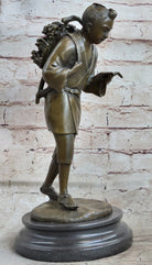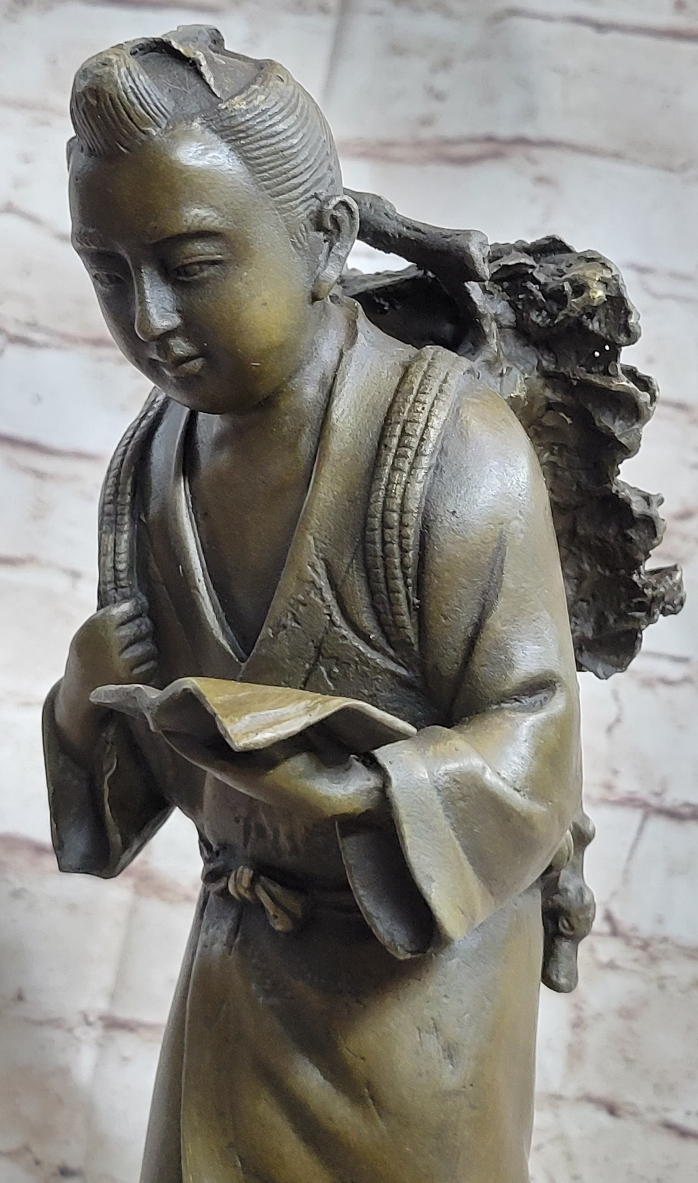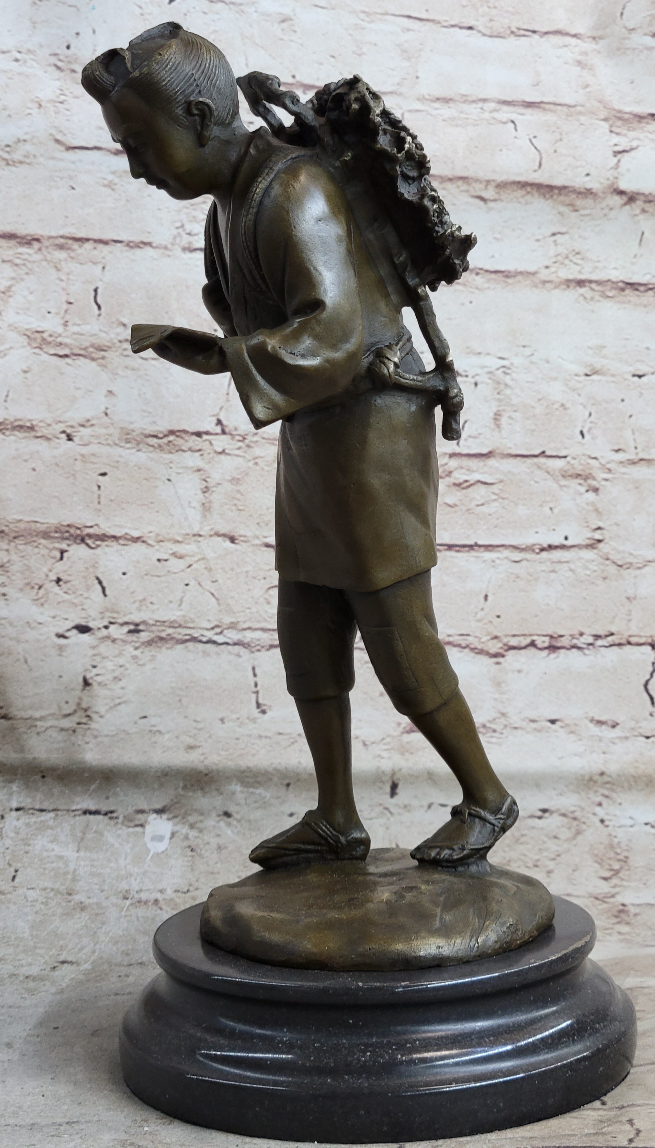 Japanese Scholar Bronze Statue with Backpack - Vintage Style Figurine of Young Boy Reading