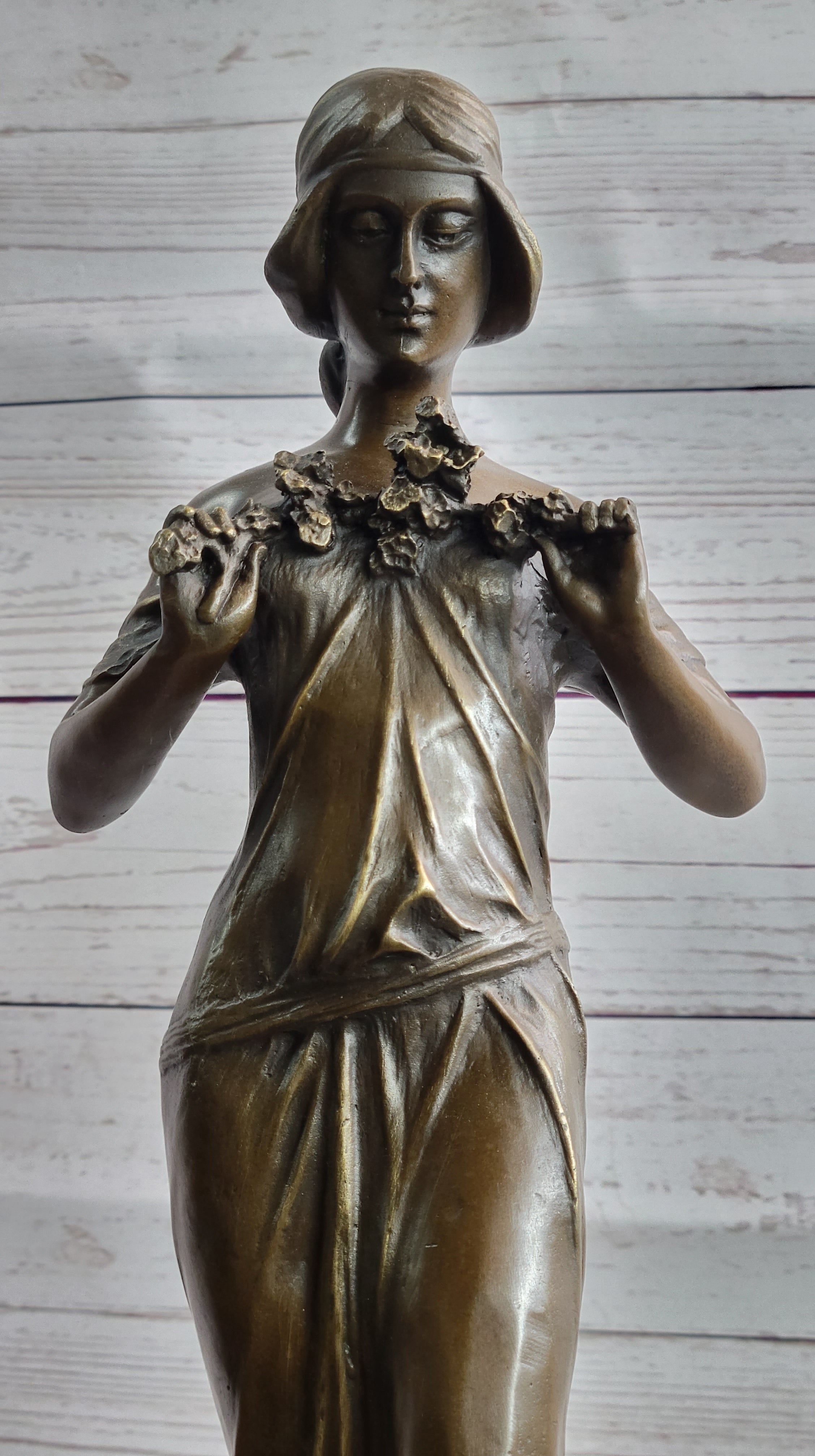 The Art Nouveau style, characterized by its organic forms and graceful curves, is showcased in every aspect of this sculpture. The female figure is adorned with floral motifs, reflecting the vibrant energy and blooming flowers of spring. The bronze sculpture is mounted on a sturdy base, providing stability and enhancing its visual impact. With its exquisite craftsmanship and timeless beauty, this statue is a perfect decorative piece for those who appreciate the elegance and allure of the Art Nouveau era.
