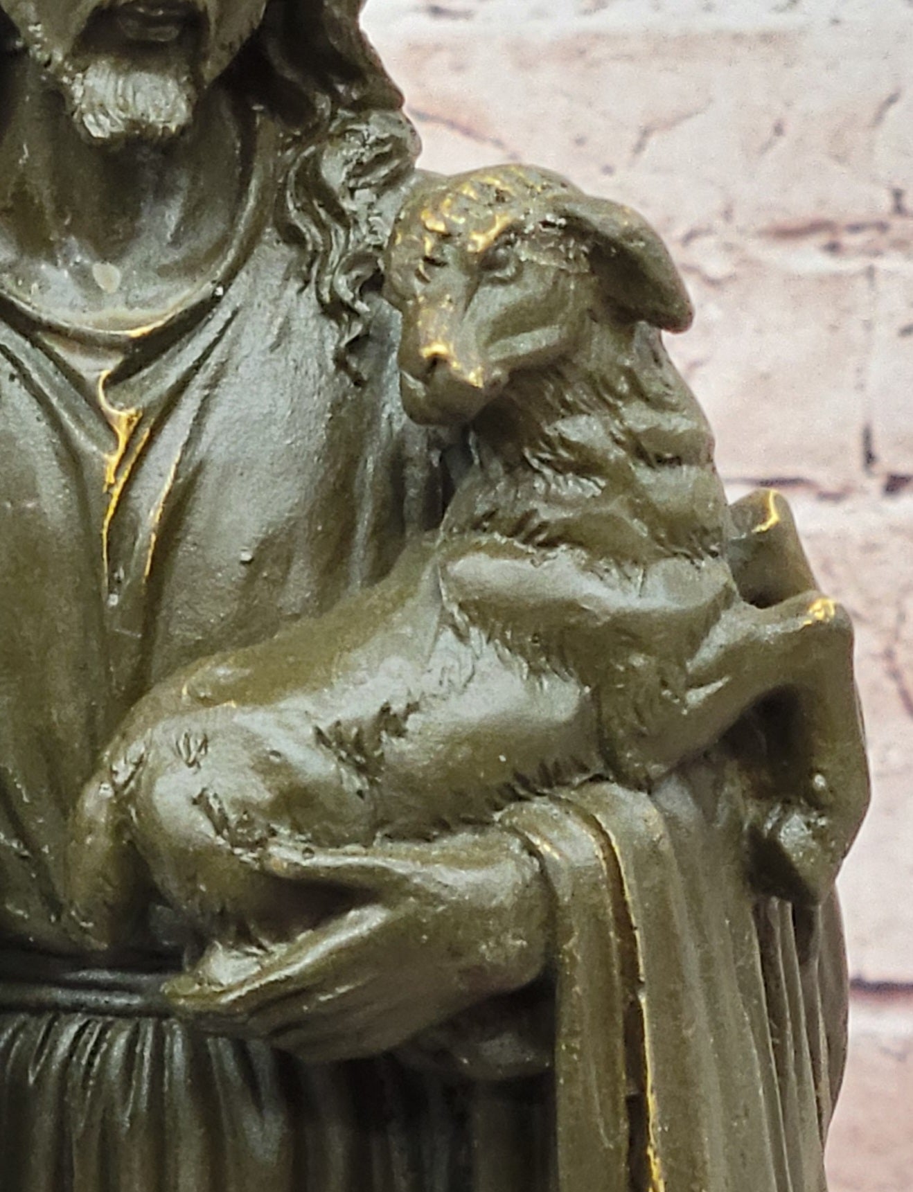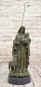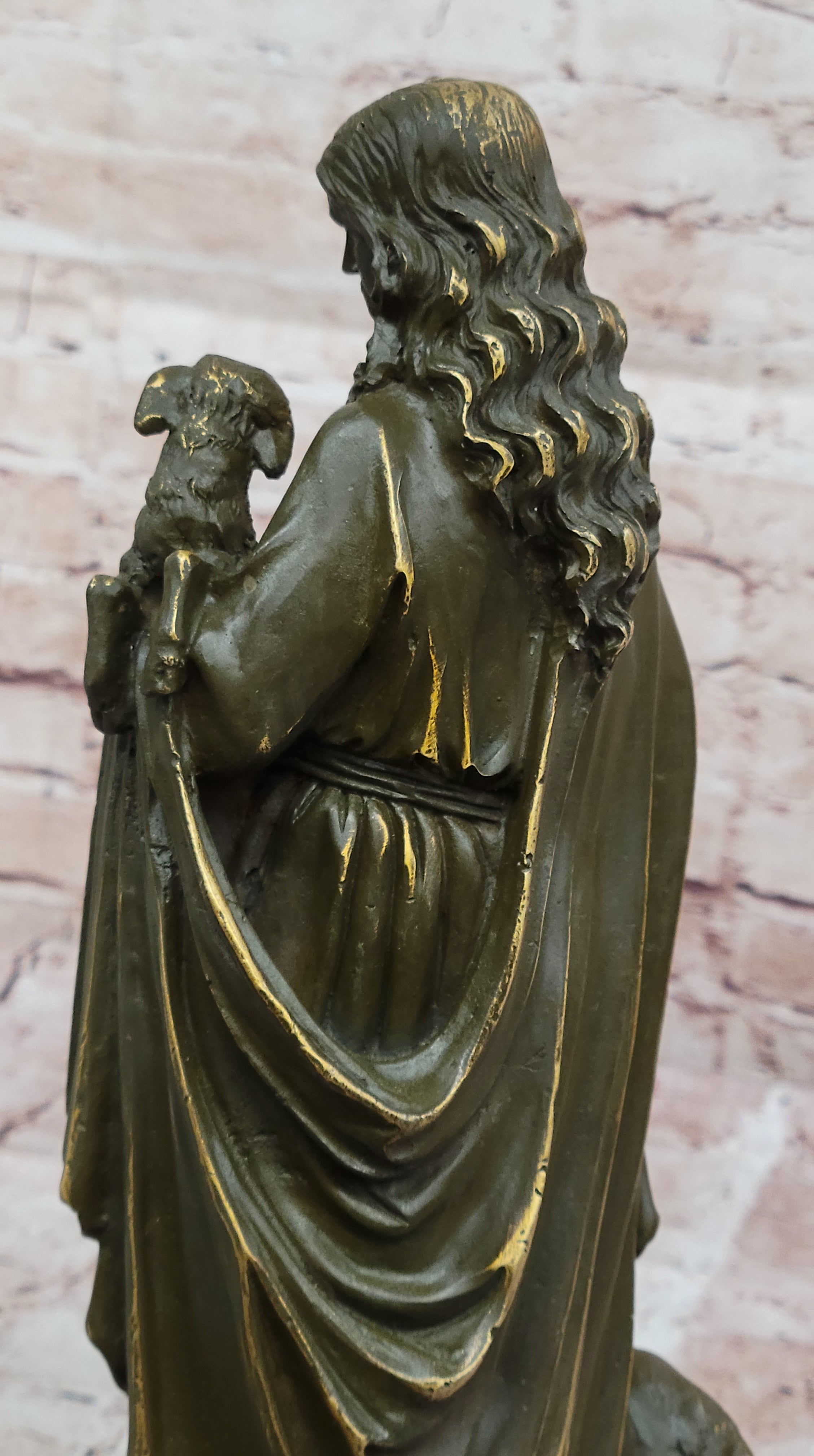 Handmade using the lost wax method, this hot-cast bronze figurine showcases a rich brown patina, highlighting the intricate details of Jesus’ flowing robes, serene facial expression, and the delicate texture of the lamb’s wool. Mounted on a round black marble base, this piece exudes both reverence and elegance, making it a perfect addition to any home, church, or spiritual space.