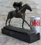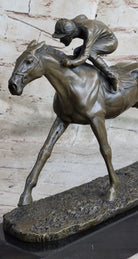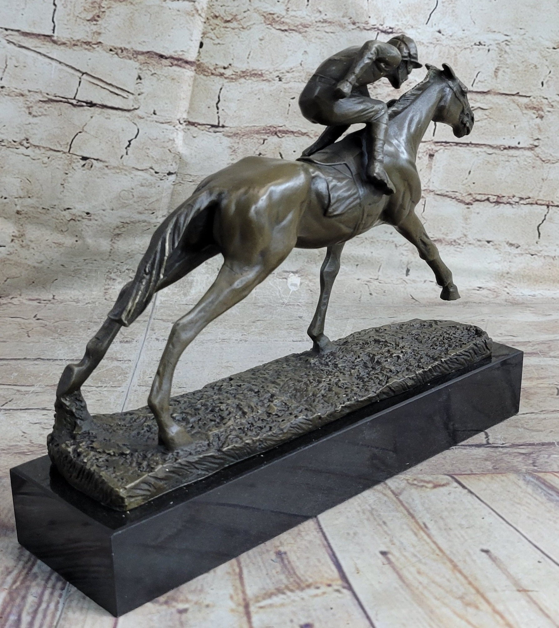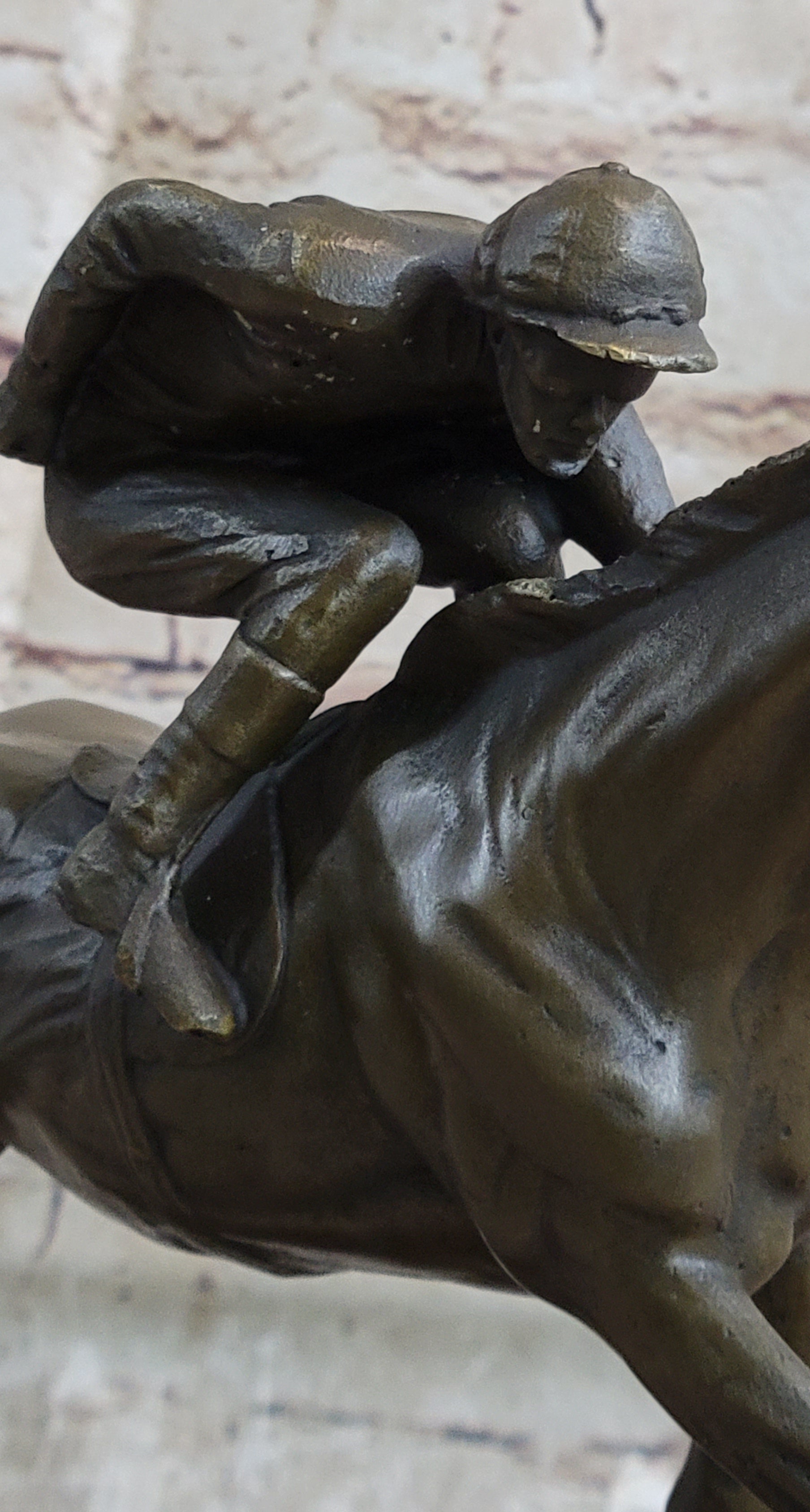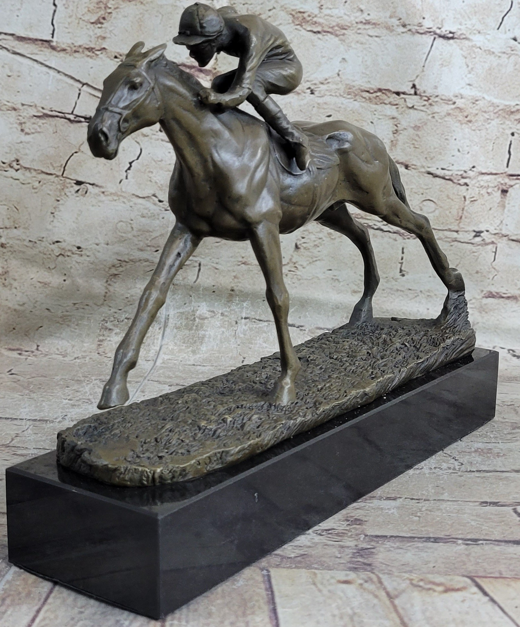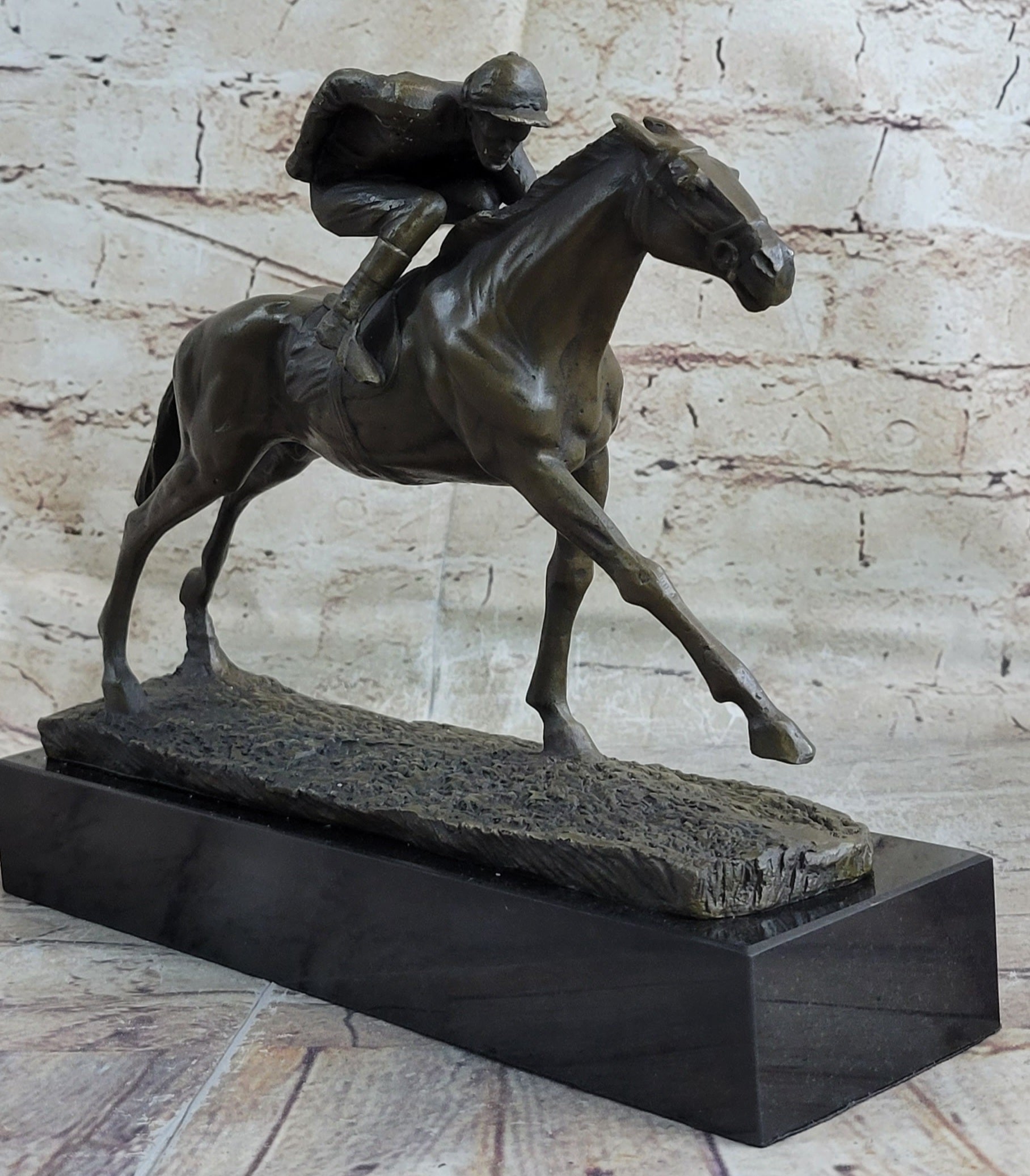 JOCKEY RIDING HORSE BRONZE STATUE FIGURE FIGURIN HOT CAST MARBLE BASE SCULPTURE